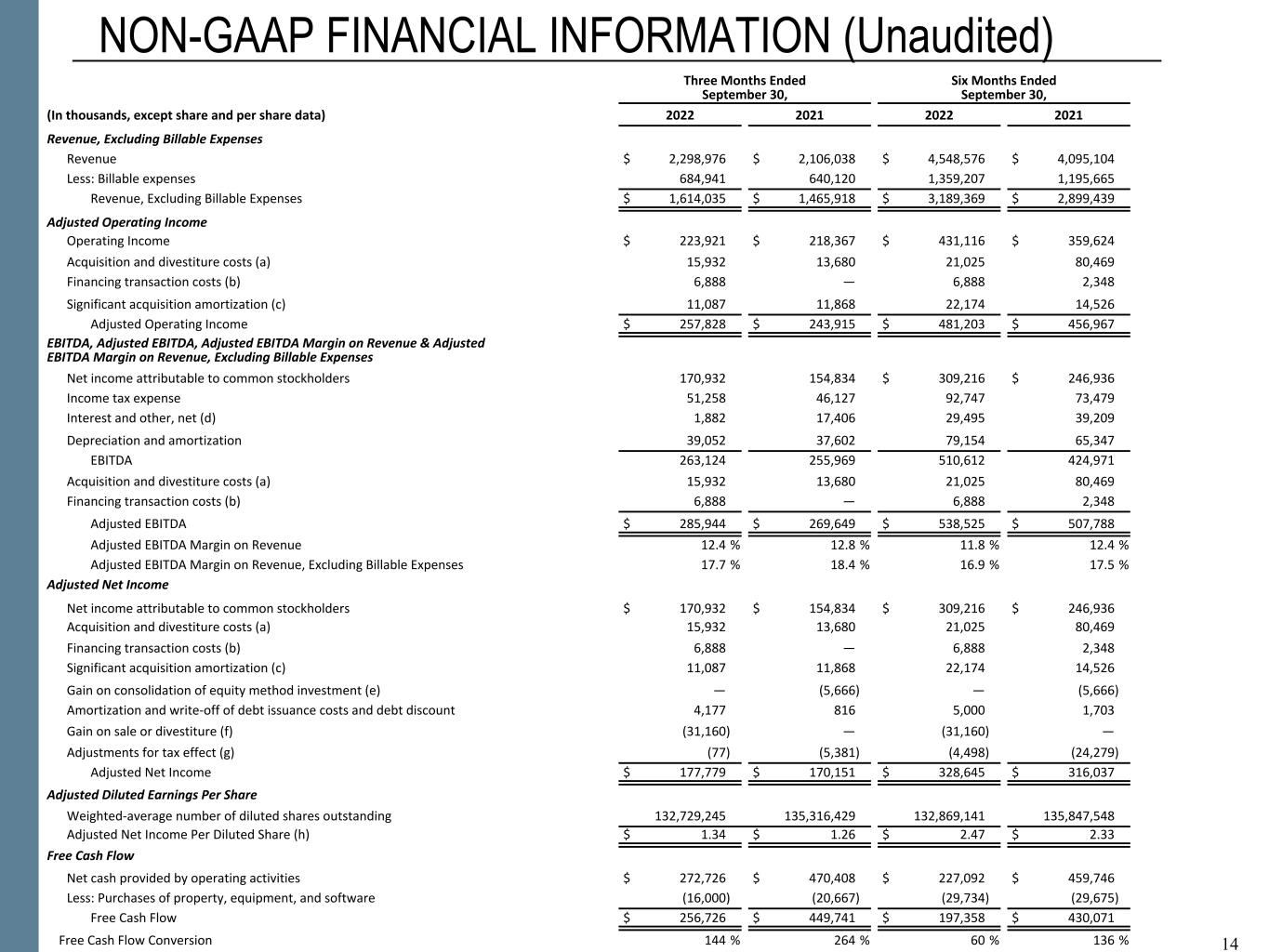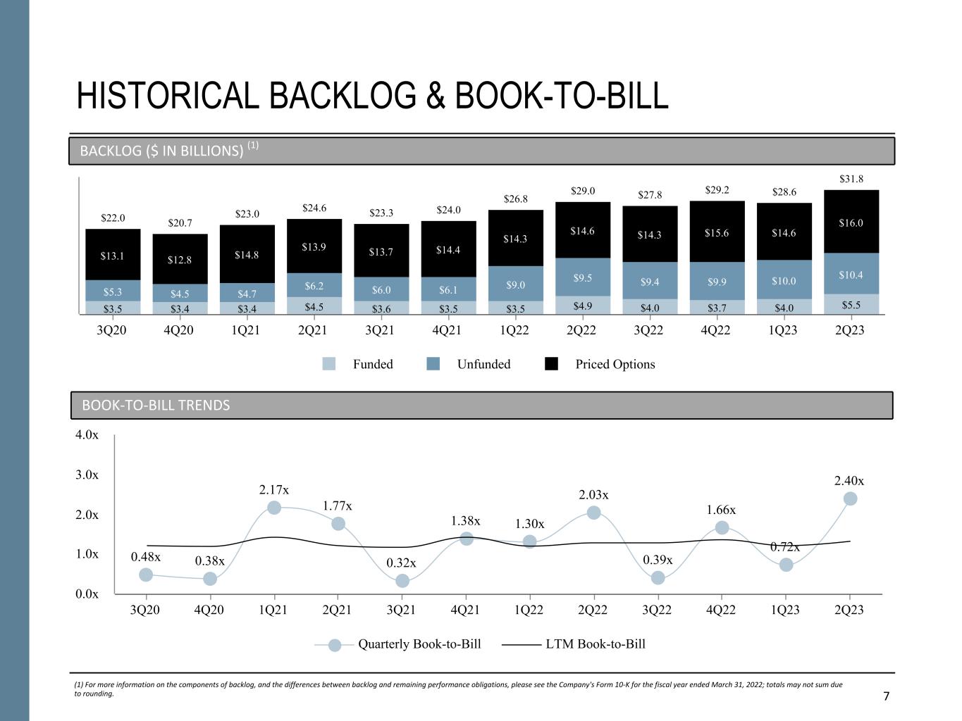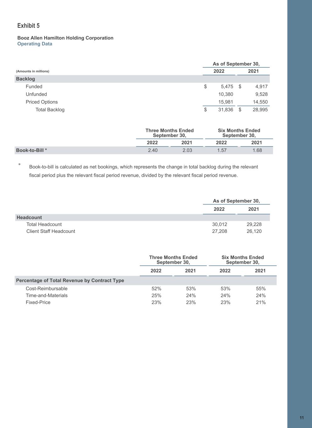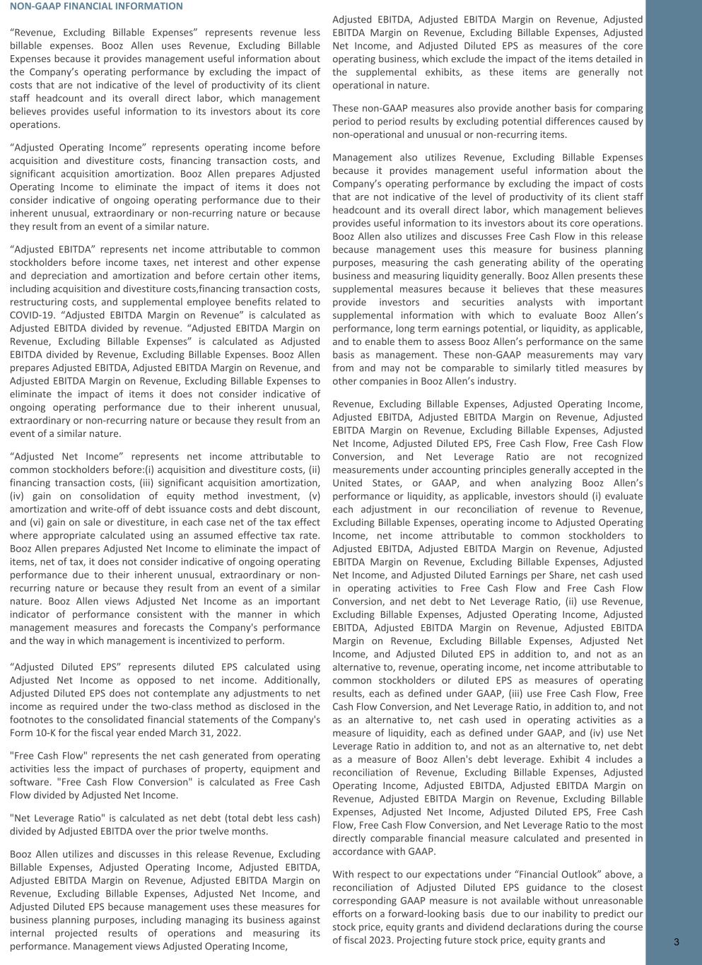 NON-GAAP FINANCIAL INFORMATION “Revenue, Excluding Billable Expenses” represents revenue less billable expenses. Booz Allen uses Revenue, Excluding Billable Expenses because it provides management useful information about the Company’s operating performance by excluding the impact of costs that are not indicative of the level of productivity of its client staff headcount and its overall direct labor, which management believes provides useful information to its investors about its core operations. “Adjusted Operating Income” represents operating income before acquisition and divestiture costs, financing transaction costs, and significant acquisition amortization. Booz Allen prepares Adjusted Operating Income to eliminate the impact of items it does not consider indicative of ongoing operating performance due to their inherent unusual, extraordinary or non-recurring nature or because they result from an event of a similar nature. “Adjusted EBITDA” represents net income attributable to common stockholders before income taxes, net interest and other expense and depreciation and amortization and before certain other items, including acquisition and divestiture costs,financing transaction costs, restructuring costs, and supplemental employee benefits related to COVID-19. “Adjusted EBITDA Margin on Revenue” is calculated as Adjusted EBITDA divided by revenue. “Adjusted EBITDA Margin on Revenue, Excluding Billable Expenses” is calculated as Adjusted EBITDA divided by Revenue, Excluding Billable Expenses. Booz Allen prepares Adjusted EBITDA, Adjusted EBITDA Margin on Revenue, and Adjusted EBITDA Margin on Revenue, Excluding Billable Expenses to eliminate the impact of items it does not consider indicative of ongoing operating performance due to their inherent unusual, extraordinary or non-recurring nature or because they result from an event of a similar nature. “Adjusted Net Income” represents net income attributable to common stockholders before:(i) acquisition and divestiture costs, (ii) financing transaction costs, (iii) significant acquisition amortization, (iv) gain on consolidation of equity method investment, (v) amortization and write-off of debt issuance costs and debt discount, and (vi) gain on sale or divestiture, in each case net of the tax effect where appropriate calculated using an assumed effective tax rate. Booz Allen prepares Adjusted Net Income to eliminate the impact of items, net of tax, it does not consider indicative of ongoing operating performance due to their inherent unusual, extraordinary or non- recurring nature or because they result from an event of a similar nature. Booz Allen views Adjusted Net Income as an important indicator of performance consistent with the manner in which management measures and forecasts the Company's performance and the way in which management is incentivized to perform. “Adjusted Diluted EPS” represents diluted EPS calculated using Adjusted Net Income as opposed to net income. Additionally, Adjusted Diluted EPS does not contemplate any adjustments to net income as required under the two-class method as disclosed in the footnotes to the consolidated financial statements of the Company's Form 10-K for the fiscal year ended March 31, 2022. "Free Cash Flow" represents the net cash generated from operating activities less the impact of purchases of property, equipment and software. "Free Cash Flow Conversion" is calculated as Free Cash Flow divided by Adjusted Net Income. "Net Leverage Ratio" is calculated as net debt (total debt less cash) divided by Adjusted EBITDA over the prior twelve months. Booz Allen utilizes and discusses in this release Revenue, Excluding Billable Expenses, Adjusted Operating Income, Adjusted EBITDA, Adjusted EBITDA Margin on Revenue, Adjusted EBITDA Margin on Revenue, Excluding Billable Expenses, Adjusted Net Income, and Adjusted Diluted EPS because management uses these measures for business planning purposes, including managing its business against internal projected results of operations and measuring its performance. Management views Adjusted Operating Income, Adjusted EBITDA, Adjusted EBITDA Margin on Revenue, Adjusted EBITDA Margin on Revenue, Excluding Billable Expenses, Adjusted Net Income, and Adjusted Diluted EPS as measures of the core operating business, which exclude the impact of the items detailed in the supplemental exhibits, as these items are generally not operational in nature. These non-GAAP measures also provide another basis for comparing period to period results by excluding potential differences caused by non-operational and unusual or non-recurring items. Management also utilizes Revenue, Excluding Billable Expenses because it provides management useful information about the Company’s operating performance by excluding the impact of costs that are not indicative of the level of productivity of its client staff headcount and its overall direct labor, which management believes provides useful information to its investors about its core operations. Booz Allen also utilizes and discusses Free Cash Flow in this release because management uses this measure for business planning purposes, measuring the cash generating ability of the operating business and measuring liquidity generally. Booz Allen presents these supplemental measures because it believes that these measures provide investors and securities analysts with important supplemental information with which to evaluate Booz Allen’s performance, long term earnings potential, or liquidity, as applicable, and to enable them to assess Booz Allen’s performance on the same basis as management. These non-GAAP measurements may vary from and may not be comparable to similarly titled measures by other companies in Booz Allen’s industry. Revenue, Excluding Billable Expenses, Adjusted Operating Income, Adjusted EBITDA, Adjusted EBITDA Margin on Revenue, Adjusted EBITDA Margin on Revenue, Excluding Billable Expenses, A