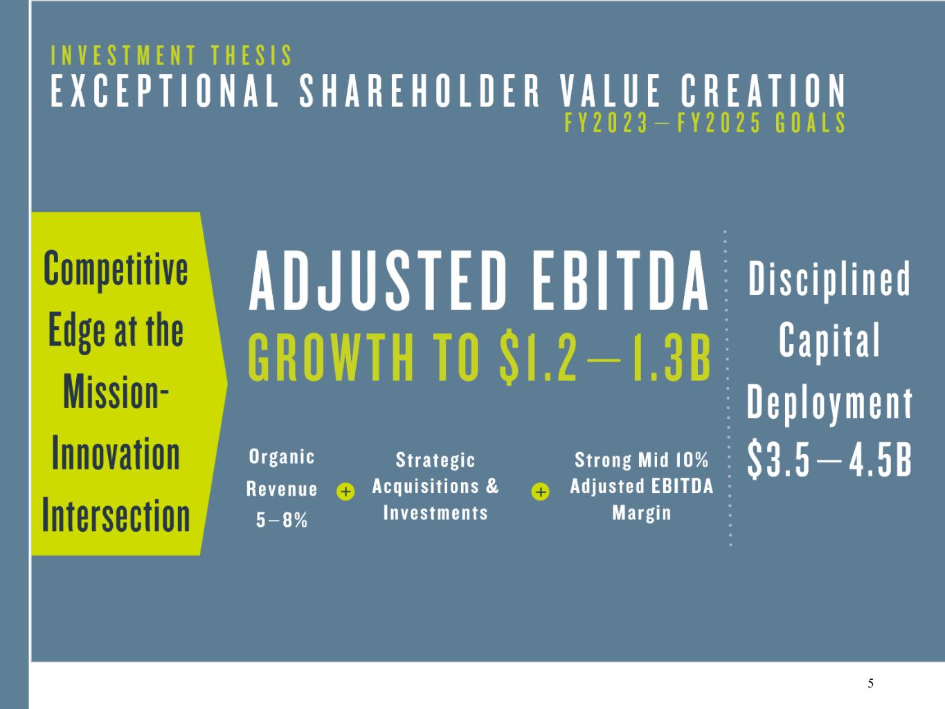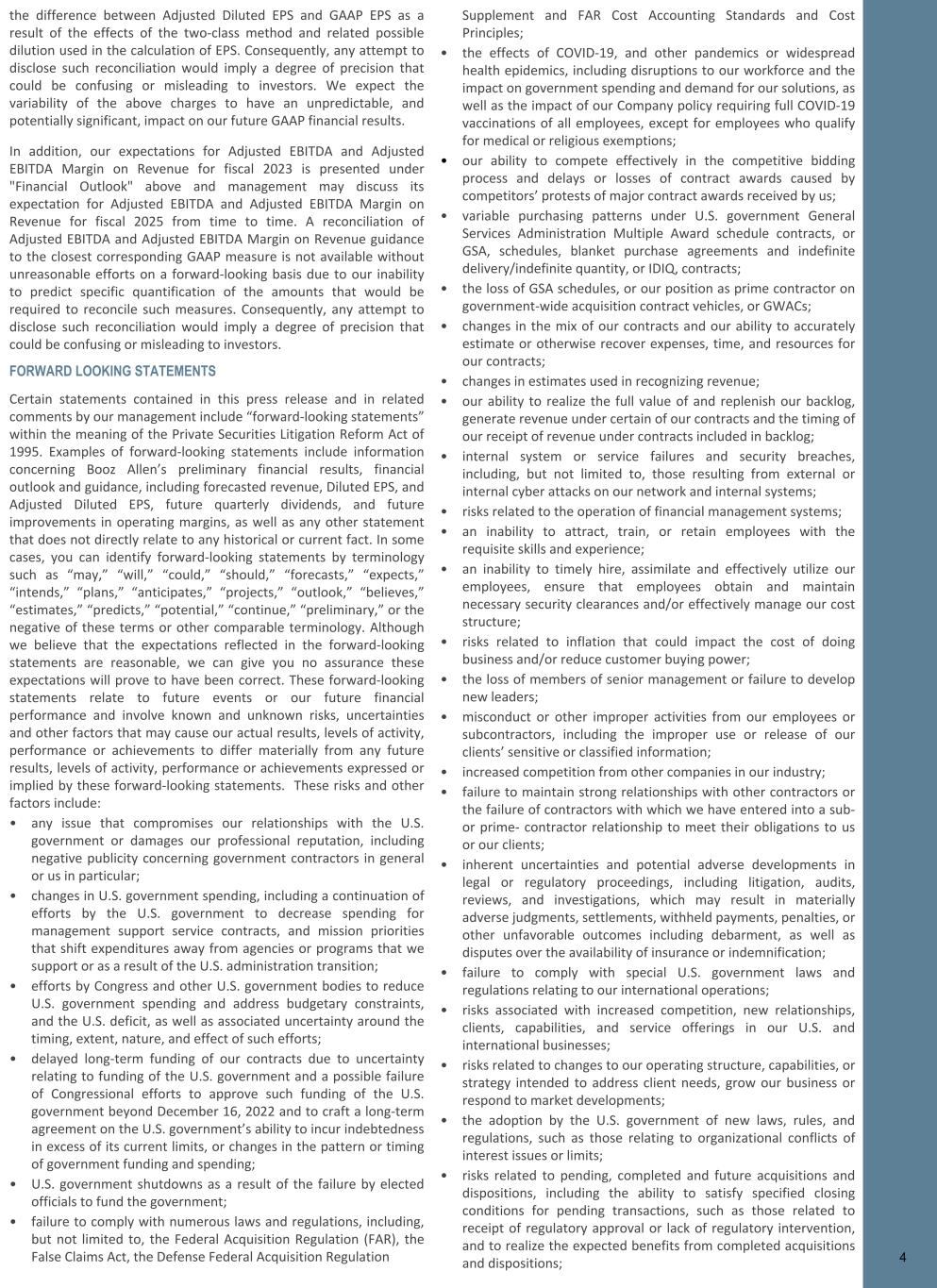 the difference between Adjusted Diluted EPS and GAAP EPS as a result of the effects of the two-class method and related possible dilution used in the calculation of EPS. Consequently, any attempt to disclose such reconciliation would imply a degree of precision that could be confusing or misleading to investors. We expect the variability of the above charges to have an unpredictable, and potentially significant, impact on our future GAAP financial results. In addition, our expectations for Adjusted EBITDA and Adjusted EBITDA Margin on Revenue for fiscal 2023 is presented under "Financial Outlook" above and management may discuss its expectation for Adjusted EBITDA and Adjusted EBITDA Margin on Revenue for fiscal 2025 from time to time. A reconciliation of Adjusted EBITDA and Adjusted EBITDA Margin on Revenue guidance to the closest corresponding GAAP measure is not available without unreasonable efforts on a forward-looking basis due to our inability to predict specific quantification of the amounts that would be required to reconcile such measures. Consequently, any attempt to disclose such reconciliation would imply a degree of precision that could be confusing or misleading to investors. FORWARD LOOKING STATEMENTS Certain statements contained in this press release and in related comments by our management include “forward-looking statements” within the meaning of the Private Securities Litigation Reform Act of 1995. Examples of forward-looking statements include information concerning Booz Allen’s preliminary financial results, financial outlook and guidance, including forecasted revenue, Diluted EPS, and Adjusted Diluted EPS, future quarterly dividends, and future improvements in operating margins, as well as any other statement that does not directly relate to any historical or current fact. In some cases, you can identify forward-looking statements by terminology such as “may,” “will,” “could,” “should,” “forecasts,” “expects,” “intends,” “plans,” “anticipates,” “projects,” “outlook,” “believes,” “estimates,” “predicts,” “potential,” “continue,” “preliminary,” or the negative of these terms or other comparable terminology. Although we believe that the expectations reflected in the forward-looking statements are reasonable, we can give you no assurance these expectations will prove to have been correct. These forward-looking statements relate to future events or our future financial performance and involve known and unknown risks, uncertainties and other factors that may cause our actual results, levels of activity, performance or achievements to differ materially from any future results, levels of activity, performance or achievements expressed or implied by these forward-looking statements. These risks and other factors include: • any issue that compromises our relationships with the U.S. government or damages our professional reputation, including negative publicity concerning government contractors in general or us in particular; • changes in U.S. government spending, including a continuation of efforts by the U.S. government to decrease spending for management support service contracts, and mission priorities that shift expenditures away from agencies or programs that we support or as a result of the U.S. administration transition; • efforts by Congress and other U.S. government bodies to reduce U.S. government spending and address budgetary constraints, and the U.S. deficit, as well as associated uncertainty around the timing, extent, nature, and effect of such efforts; • delayed long-term funding of our contracts due to uncertainty relating to funding of the U.S. government and a possible failure of Congressional efforts to approve such funding of the U.S. government beyond December 16, 2022 and to craft a long-term agreement on the U.S. government’s ability to incur indebtedness in excess of its current limits, or changes in the pattern or timing of government funding and spending; • U.S. government shutdowns as a result of the failure by elected officials to fund the government; • failure to comply with numerous laws and regulations, including, but not limited to, the Federal Acquisition Regulation (FAR), the False Claims Act, the Defense Federal Acquisition Regulation Supplement and FAR Cost Accounting Standards and Cost Principles; • the effects of COVID-19, and other pandemics or widespread health epidemics, including disruptions to our workforce and the impact on government spending and demand for our solutions, as well as the impact of our Company policy requiring full COVID-19 vaccinations of all employees, except for employees who qualify for medical or religious exemptions; • our ability to compete effectively in the competitive bidding process and delays or losses of contract awards caused by competitors’ protests of major contract awards received by us; • variable purchasing patterns under U.S. government General Services Administration Multiple Award schedule contracts, or GSA, schedules, blanket purchase agreements and indefinite delivery/indefinite quantity, or IDIQ, contracts; • the loss of GSA schedules, or our position as prime contractor on government-wide acquisition contract vehicles, or GWACs; • changes in the mix of our contracts and our ability to accurately estimate or otherwise recover expenses, time, and resources for our contracts; • changes in estimates used in recognizing revenue; • our ability to realize the full value of and replenish our backlog, generate revenue under certain of our contracts and the timing of our receipt of revenue under contracts included in backlog; • internal system or service failures and security breaches, including, but not limited to, those resulting from external or internal cyber attacks on our network and internal systems; • risks related to the operation of financial management systems; • an inability to a