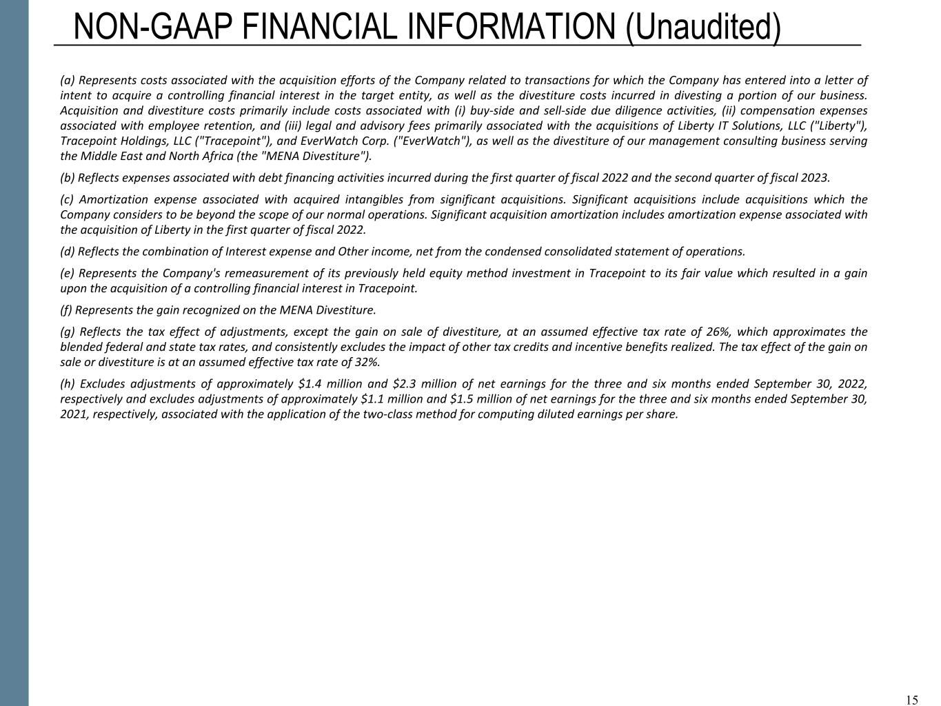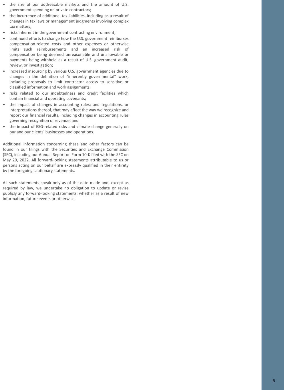 5 • the size of our addressable markets and the amount of U.S. government spending on private contractors; • the incurrence of additional tax liabilities, including as a result of changes in tax laws or management judgments involving complex tax matters; • risks inherent in the government contracting environment; • continued efforts to change how the U.S. government reimburses compensation-related costs and other expenses or otherwise limits such reimbursements and an increased risk of compensation being deemed unreasonable and unallowable or payments being withheld as a result of U.S. government audit, review, or investigation; • increased insourcing by various U.S. government agencies due to changes in the definition of “inherently governmental” work, including proposals to limit contractor access to sensitive or classified information and work assignments; • risks related to our indebtedness and credit facilities which contain financial and operating covenants; • the impact of changes in accounting rules; and regulations, or interpretations thereof, that may affect the way we recognize and report our financial results, including changes in accounting rules governing recognition of revenue; and • the impact of ESG-related risks and climate change generally on our and our clients' businesses and operations. Additional information concerning these and other factors can be found in our filings with the Securities and Exchange Commission (SEC), including our Annual Report on Form 10-K filed with the SEC on May 20, 2022. All forward-looking statements attributable to us or persons acting on our behalf are expressly qualified in their entirety by the foregoing cautionary statements. All such statements speak only as of the date made and, except as required by law, we undertake no obligation to update or revise publicly any forward-looking statements, whether as a result of new information, future events or otherwise. 5