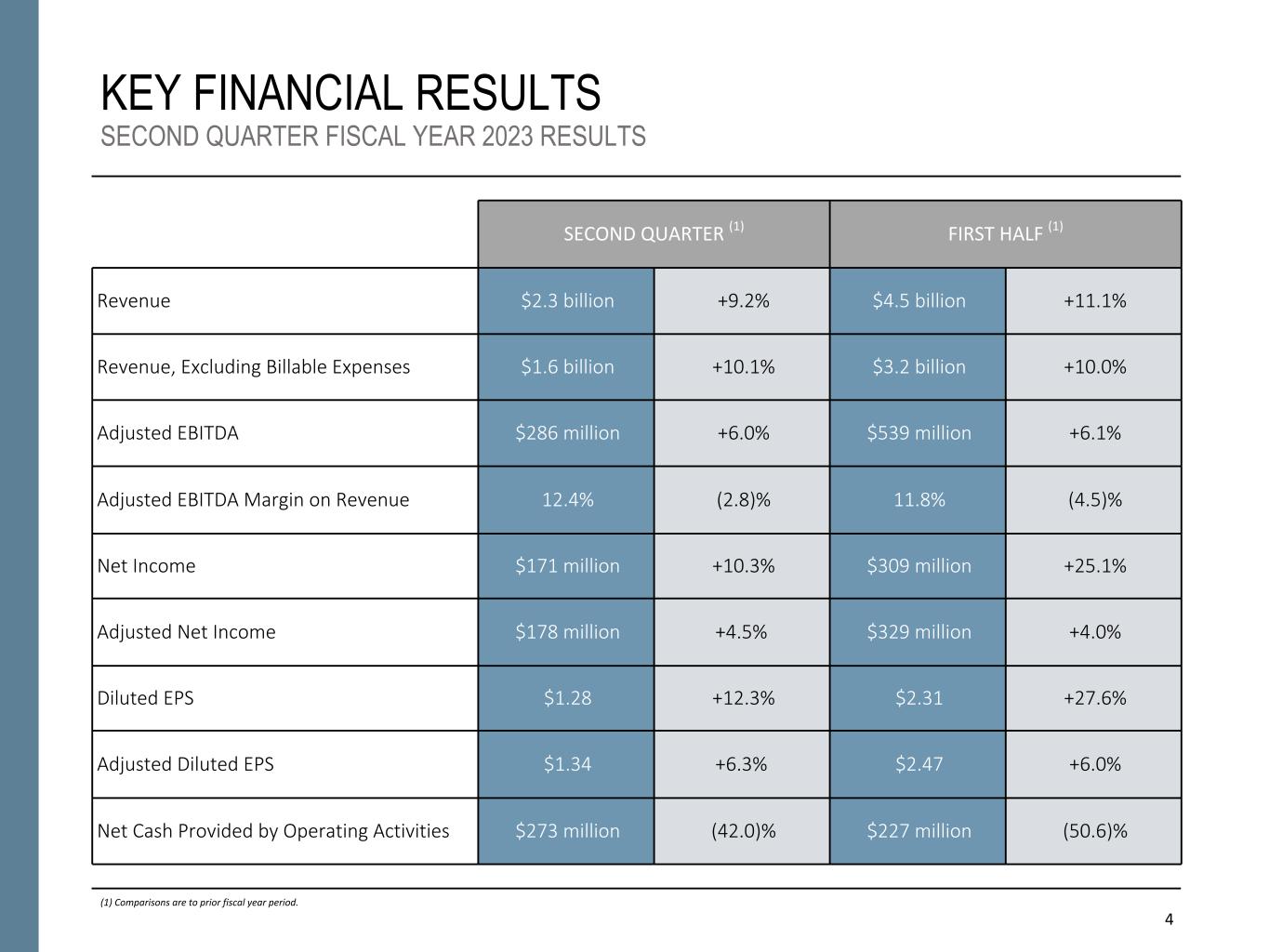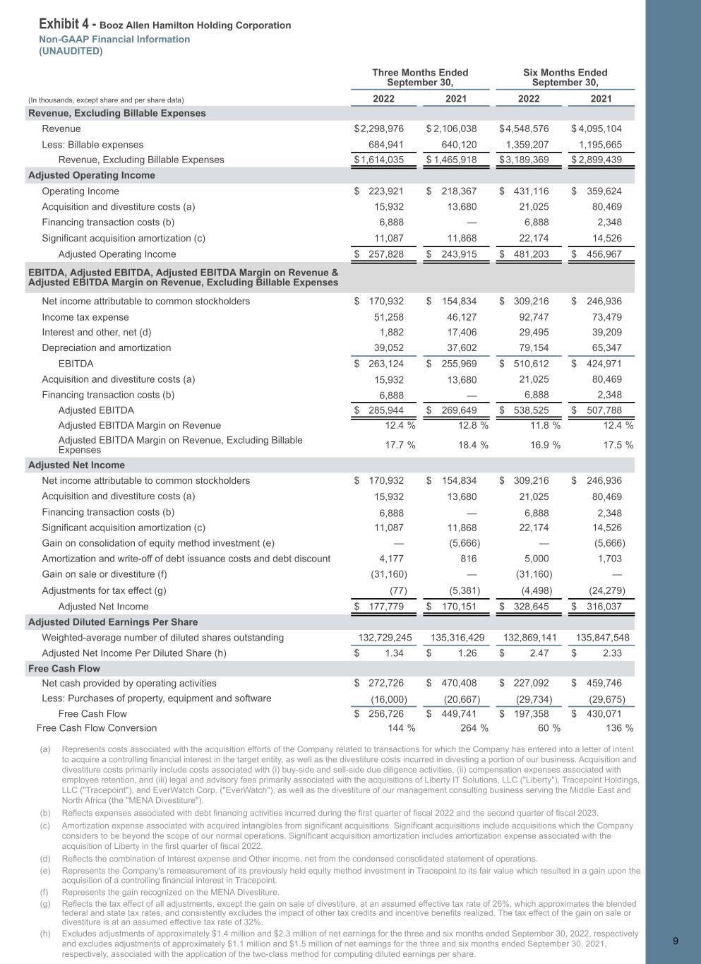 Exhibit 4 - Booz Allen Hamilton Holding Corporation Non-GAAP Financial Information (UNAUDITED) 9 Three Months Ended September 30, Six Months Ended September 30, (In thousands, except share and per share data) 2022 2021 2022 2021 Revenue, Excluding Billable Expenses Revenue $ 2,298,976 $ 2,106,038 $ 4,548,576 $ 4,095,104 Less: Billable expenses 684,941 640,120 1,359,207 1,195,665 Revenue, Excluding Billable Expenses $ 1,614,035 $ 1,465,918 $ 3,189,369 $ 2,899,439 Adjusted Operating Income Operating Income $ 223,921 $ 218,367 $ 431,116 $ 359,624 Acquisition and divestiture costs (a) 15,932 13,680 21,025 80,469 Financing transaction costs (b) 6,888 — 6,888 2,348 Significant acquisition amortization (c) 11,087 11,868 22,174 14,526 Adjusted Operating Income $ 257,828 $ 243,915 $ 481,203 $ 456,967 EBITDA, Adjusted EBITDA, Adjusted EBITDA Margin on Revenue & Adjusted EBITDA Margin on Revenue, Excluding Billable Expenses Net income attributable to common stockholders $ 170,932 $ 154,834 $ 309,216 $ 246,936 Income tax expense 51,258 46,127 92,747 73,479 Interest and other, net (d) 1,882 17,406 29,495 39,209 Depreciation and amortization 39,052 37,602 79,154 65,347 EBITDA $ 263,124 $ 255,969 $ 510,612 $ 424,971 Acquisition and divestiture costs (a) 15,932 13,680 21,025 80,469 Financing transaction costs (b) 6,888 — 6,888 2,348 Adjusted EBITDA $ 285,944 $ 269,649 $ 538,525 $ 507,788 Adjusted EBITDA Margin on Revenue 12.4 % 12.8 % 11.8 % 12.4 % Adjusted EBITDA Margin on Revenue, Excluding Billable Expenses 17.7 % 18.4 % 16.9 % 17.5 % Adjusted Net Income Net income attributable to common stockholders $ 170,932 $ 154,834 $ 309,216 $ 246,936 Acquisition and divestiture costs (a) 15,932 13,680 21,025 80,469 Financing transaction costs (b) 6,888 — 6,888 2,348 Significant acquisition amortization (c) 11,087 11,868 22,174 14,526 Gain on consolidation of equity method investment (e) — (5,666) — (5,666) Amortization and write-off of debt issuance costs and debt discount 4,177 816 5,000 1,703 Gain on sale or divestiture (f) (31,160) — (31,160) — Adjustments for tax effect (g) (77) (5,381) (4,498) (24,279) Adjusted Net Income $ 177,779 $ 170,151 $ 328,645 $ 316,037 Adjusted Diluted Earnings Per Share Weighted-average number of diluted shares outstanding 132,729,245 135,316,429 132,869,141 135,847,548 Adjusted Net Income Per Diluted Share (h) $ 1.34 $ 1.26 $ 2.47 $ 2.33 Free Cash Flow Net cash provided by operating activities $ 272,726 $ 470,408 $ 227,092 $ 459,746 Less: Purchases of property, equipment and software (16,000) (20,667) (29,734) (29,675) Free Cash Flow $ 256,726 $ 449,741 $ 197,358 $ 430,071 Free Cash Flow Conversion 144 % 264 % 60 % 136 % 9 (a) Represents costs associated with the acquisition efforts of the Company related to transactions for which the Company has entered into a letter of intent to acquire a controlling financial interest in the target entity, as well as the divestiture costs incurred in divesting a portion of our business. Acquisition and divestiture costs primarily include costs associated with (i) buy-side and sell-side due diligence activities, (ii) compensation expenses associated with employee retention, and (iii) legal and advisory fees primarily associated with the acquisitions of Liberty IT Solutions, LLC ("Liberty"), Tracepoint Holdings, LLC ("Tracepoint"), and EverWatch Corp. ("EverWatch"), as well as the divestiture of our management consulting business serving the Middle East and North Africa (the "MENA Divestiture"). (b) Reflects expenses associated with debt financing activities incurred during the first quarter of fiscal 2022 and the second quarter of fiscal 2023. (c) Amortization expense associated with acquired intangibles from significant acquisitions. Significant acquisitions include acquisitions which the Company considers to be beyond the scope of our normal operations. Significant acquisition amortization includes amortization expense associated with the acquisition of Liberty in the first quarter of fiscal 2022. (d) Reflects the combination of Interest expense and Other income, net from the condensed consolidated statement of operations. (e) Represents the Company's remeasurement of its previously held equity method investment in Tracepoint to its fair value which resulted in a gain upon the acquisition of a controlling financial interest in Tracepoint. (f) Represents the gain recognized on the MENA Divestiture. (g) Reflects the tax effect of all adjustments, except the gain on sale of divestiture, at an assumed effective tax rate of 26%, which approximates the blended federal and state tax rates, and consistently excludes the impact of other tax credits and incentive benefits realized. The tax effect of the gain on sale or divestiture is at an assumed effective tax rate of 32%. (h) Excludes adjustments of approximately $1.4 million and $2.3 million of net earnings for the three and six months ended September 30, 2022, respectively and excludes adjustments of approximately $1.1 million and $1.5 million of net earnings for the three and six months ended September 30, 2021, respectively, associated with the application of the two-class method for computing diluted earnings per share.