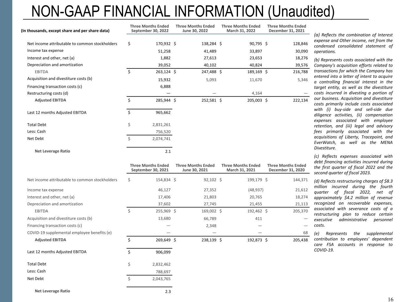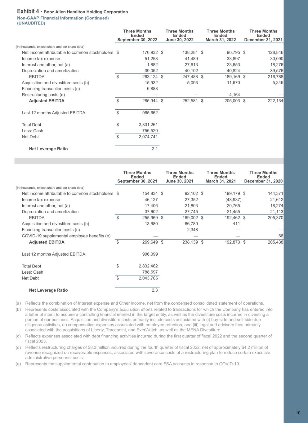 Exhibit 4 - Booz Allen Hamilton Holding Corporation Non-GAAP Financial Information (Continued) (UNAUDITED) 1 0 Three Months Ended September 30, 2022 Three Months Ended June 30, 2022 Three Months Ended March 31, 2022 Three Months Ended December 31, 2021 (In thousands, except share and per share data) Net income attributable to common stockholders $ 170,932 $ 138,284 $ 90,795 $ 128,846 Income tax expense 51,258 41,489 33,897 30,090 Interest and other, net (a) 1,882 27,613 23,653 18,276 Depreciation and amortization 39,052 40,102 40,824 39,576 EBITDA $ 263,124 $ 247,488 $ 189,169 $ 216,788 Acquisition and divestiture costs (b) 15,932 5,093 11,670 5,346 Financing transaction costs (c) 6,888 Restructuring costs (d) — — 4,164 — Adjusted EBITDA $ 285,944 $ 252,581 $ 205,003 $ 222,134 Last 12 months Adjusted EBITDA $ 965,662 Total Debt $ 2,831,261 Less: Cash 756,520 Net Debt $ 2,074,741 Net Leverage Ratio 2.1 Three Months Ended September 30, 2021 Three Months Ended June 30, 2021 Three Months Ended March 31, 2021 Three Months Ended December 31, 2020 (In thousands, except share and per share data) Net income attributable to common stockholders $ 154,834 $ 92,102 $ 199,179 $ 144,371 Income tax expense 46,127 27,352 (48,937) 21,612 Interest and other, net (a) 17,406 21,803 20,765 18,274 Depreciation and amortization 37,602 27,745 21,455 21,113 EBITDA $ 255,969 $ 169,002 $ 192,462 $ 205,370 Acquisition and divestiture costs (b) 13,680 66,789 411 — Financing transaction costs (c) — 2,348 — — COVID-19 supplemental employee benefits (e) — — — 68 Adjusted EBITDA $ 269,649 $ 238,139 $ 192,873 $ 205,438 Last 12 months Adjusted EBITDA 906,099 Total Debt $ 2,832,462 Less: Cash 788,697 Net Debt $ 2,043,765 Net Leverage Ratio 2.3 10 (a) Reflects the combination of Interest expense and Other income, net from the condensed consolidated statement of operations. (b) Represents costs associated with the Company's acquisition efforts related to transactions for which the Company has entered into a letter of intent to acquire a controlling financial interest in the target entity, as well as the divestiture costs incurred in divesting a portion of our business. Acquisition and divestiture costs primarily include costs associated with (i) buy-side and sell-side due diligence activities, (ii) compensation expenses associated with employee retention, and (iii) legal and advisory fees primarily associated with the acquisitions of Liberty, Tracepoint, and EverWatch, as well as the MENA Divestiture. (c) Reflects expenses associated with debt financing activities incurred during the first quarter of fiscal 2022 and the second quarter of fiscal 2023. (d) Reflects restructuring charges of $8.3 million incurred during the fourth quarter of fiscal 2022, net of approximately $4.2 million of revenue recognized on recoverable expenses, associated with severance costs of a restructuring plan to reduce certain executive administrative personnel costs. (e) Represents the supplemental contribution to employees' dependent care FSA accounts in response to COVID-19.