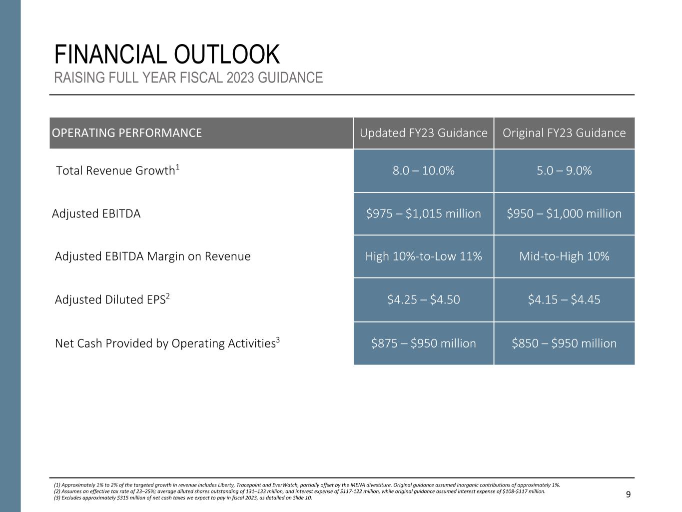 FINANCIAL OUTLOOK The Company is updating its original fiscal year 2023 guidance, as noted in the table below: CONFERENCE CALL INFORMATION Booz Allen Hamilton will host a conference call at 8 a.m. EDT on Friday, October 28, 2022, to discuss the financial results for its second quarter fiscal 2023. Analysts and institutional investors may participate on the call by registering online at investors.boozallen.com. Participants are requested to register a minimum 15 minutes before the start of the call. The conference call will be webcast simultaneously to the public through a link on the investor relations section of the Booz Allen Hamilton website at investors.boozallen.com. A replay of the conference call will be available online at investors.boozallen.com beginning at 11 a.m. EDT on October 28, 2022 and continuing for 30 days. 1 Revenue, Excluding Billable Expenses, Adjusted Operating Income, Adjusted Net Income, Adjusted EBITDA, Adjusted Diluted EPS, Adjusted EBITDA Margin on Revenue and Free Cash Flow are non-GAAP financial measures. See "Non-GAAP Financial Information" below for additional detail. Approximately 1% to 2% of the targeted growth in revenue includes Liberty, Tracepoint and EverWatch, partially offset by the MENA divestiture. Original guidance assumed inorganic contributions of approximately 1%. 2 Assumes an effective tax rate of 23–25%; average diluted shares outstanding of 131–133 million, and interest expense of $117-$122 million, while original guidance assumed interest expense of $108-$117 million. 3 Excludes approximately $315 million of net cash taxes we expect to pay in fiscal year 2023, which includes approximately $140 million associated with our interpretation of the current Section 174 legislation. Inclusive of cash to be paid for income taxes, we anticipate our total Operating Cash Flow for fiscal year 2023 will be between $560 million to $635 million. Original guidance assumed $550 million dollars of cash taxes in fiscal year 2023. 2 For the first half of fiscal 2023, net cash provided by operating activities was $227.1 million, as compared to $459.7 million in the prior year period. Free cash flow1 for the first half of fiscal 2023 was $197.4 million, as compared to $430.1 million in the prior year period. The Company declared a regular quarterly dividend of $0.43 per share, which is payable on December 2, 2022 to stockholders of record on November 15, 2022. ABOUT BOOZ ALLEN HAMILTON For more than 100 years, military, government, and business leaders have turned to Booz Allen Hamilton to solve their most complex problems. As a consulting firm with experts in analytics, digital solutions, engineering, and cyber, we help organizations transform. We are a key partner on some of the most innovative programs for governments worldwide and trusted by their most sensitive agencies. We work shoulder-to-shoulder with clients, using a mission-first approach to choose the right strategy and technology to help them realize their vision. With global headquarters in McLean, Virginia, our firm employs approximately 30,000 people globally as of September 30, 2022, and had revenue of $8.4 billion for the 12 months ended March 31, 2022. To learn more, visit www.boozallen.com. (NYSE: BAH) OPERATING PERFORMANCE UPDATED FISCAL 2023 GUIDANCE ORIGINAL FISCAL 2023 GUIDANCE Revenue Growth1 8.0 – 10.0% 5.0 – 9.0% Adjusted EBITDA1 $975 – $1,015 million $950 – $1,000 million Adjusted EBITDA Margin on Revenue High 10% to Low 11% Mid-to-High 10% Adjusted Diluted EPS2 $4.25 – $4.50 $4.15 – $4.45 Net Cash Provided by Operating Activities3 $875 – $950 million $850 – $950 million FIRST HALF FY23 (changes are compared to prior year period) REVENUE: $4.55B +11.1 % EX. BILLABLE EXPENSES1: $3.19B +10.0 % OPERATING INCOME: $431.1M +19.9 % ADJ. OPERATING INCOME1: $481.2M +5.3 % NET INCOME: $308.9M +25.1 % NET INCOME ATTRIBUTABLE TO COMMON STOCKHOLDERS: $309.2M +25.2 % ADJUSTED NET INCOME1: $328.6M +4.0 % EBITDA: $510.6M +20.2 % ADJUSTED EBITDA1: $538.5M +6.1 % DILUTED EPS: $2.31 up from $1.81 ADJUSTED DILUTED EPS1: $2.47 up from $2.33