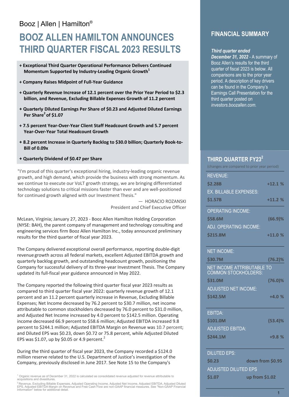 Booz | Allen | Hamilton® BOOZ ALLEN HAMILTON ANNOUNCES THIRD QUARTER FISCAL 2023 RESULTS + Exceptional Third Quarter Operational Performance Delivers Continued Momentum Supported by Industry-Leading Organic Growth1 + Company Raises Midpoint of Full-Year Guidance + Quarterly Revenue Increase of 12.1 percent over the Prior Year Period to $2.3 billion, and Revenue, Excluding Billable Expenses Growth of 11.2 percent + Quarterly Diluted Earnings Per Share of $0.23 and Adjusted Diluted Earnings Per Share2 of $1.07 + 7.5 percent Year-Over-Year Client Staff Headcount Growth and 5.7 percent Year-Over-Year Total Headcount Growth + 8.2 percent Increase in Quarterly Backlog to $30.0 billion; Quarterly Book-to- Bill of 0.09x + Quarterly Dividend of $0.47 per Share "I'm proud of this quarter's exceptional hiring, industry-leading organic revenue growth, and high demand, which provide the business with strong momentum. As we continue to execute our VoLT growth strategy, we are bringing differentiated technology solutions to critical missions faster than ever and are well-positioned for continued growth aligned with our Investment Thesis." — HORACIO ROZANSKI President and Chief Executive Officer McLean, Virginia; January 27, 2023 - Booz Allen Hamilton Holding Corporation (NYSE: BAH), the parent company of management and technology consulting and engineering services firm Booz Allen Hamilton Inc., today announced preliminary results for the third quarter of fiscal year 2023. The Company delivered exceptional overall performance, reporting double-digit revenue growth across all federal markets, excellent Adjusted EBITDA growth and quarterly backlog growth, and outstanding headcount growth, positioning the Company for successful delivery of its three-year Investment Thesis. The Company updated its full-fiscal year guidance announced in May 2022. The Company reported the following third quarter fiscal year 2023 results as compared to third quarter fiscal year 2022: quarterly revenue growth of 12.1 percent and an 11.2 percent quarterly increase in Revenue, Excluding Billable Expenses; Net Income decreased by 76.2 percent to $30.7 million, net income attributable to common stockholders decreased by 76.0 percent to $31.0 million, and Adjusted Net Income increased by 4.0 percent to $142.5 million. Operating income decreased 66.9 percent to $58.6 million; Adjusted EBITDA increased 9.8 percent to $244.1 million; Adjusted EBITDA Margin on Revenue was 10.7 percent; and Diluted EPS was $0.23, down $0.72 or 75.8 percent, while Adjusted Diluted EPS was $1.07, up by $0.05 or 4.9 percent.2 During the third quarter of fiscal year 2023, the Company recorded a $124.0 million reserve related to the U.S. Department of Justice’s investigation of the Company, previously disclosed in June 2017. See Note 15 to the Company's 1 Organic revenue as of December 31, 2022 is calculated as consolidated revenue adjusted for revenue attributable to acquisitions and divestitures. 2 Revenue, Excluding Billable Expenses, Adjusted Operating Income, Adjusted Net Income, Adjusted EBITDA, Adjusted Diluted EPS, Adjusted EBITDA Margin on Revenue and Free Cash Flow are non-GAAP financial measures. See "Non-GAAP Financial Information" below for additional detail. 1 THIRD QUARTER FY232 (changes are compared to prior year period) REVENUE: $2.28B +12.1 % EX. BILLABLE EXPENSES: $1.57B +11.2 % OPERATING INCOME: $58.6M (66.9) % ADJ. OPERATING INCOME: $215.8M +11.0 % NET INCOME: $30.7M (76.2) % NET INCOME ATTRIBUTABLE TO COMMON STOCKHOLDERS: $31.0M (76.0) % ADJUSTED NET INCOME: $142.5M +4.0 % EBITDA: $101.0M (53.4) % ADJUSTED EBITDA: $244.1M +9.8 % DILUTED EPS: $0.23 down from $0.95 ADJUSTED DILUTED EPS $1.07 up from $1.02 FINANCIAL SUMMARY Third quarter ended December 31, 2022 - A summary of Booz Allen’s results for the third quarter of fiscal 2023 is below. All comparisons are to the prior year period. A description of key drivers can be found in the Company’s Earnings Call Presentation for the third quarter posted on investors.boozallen.com.