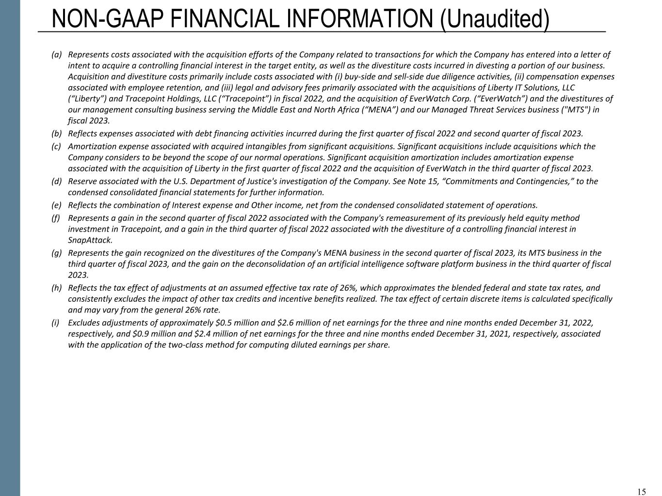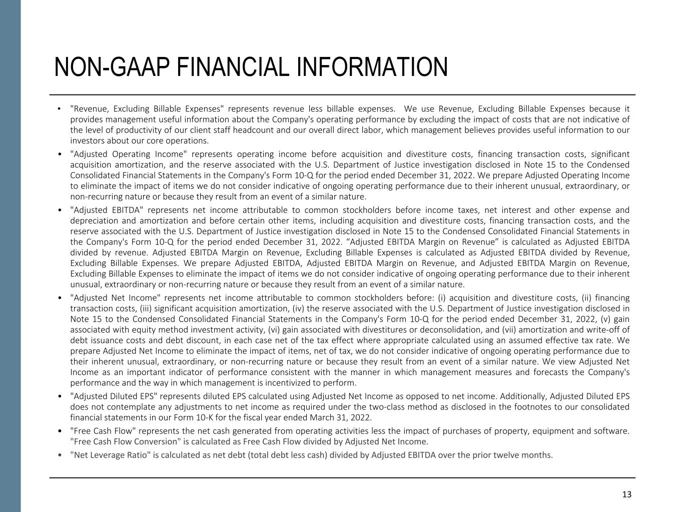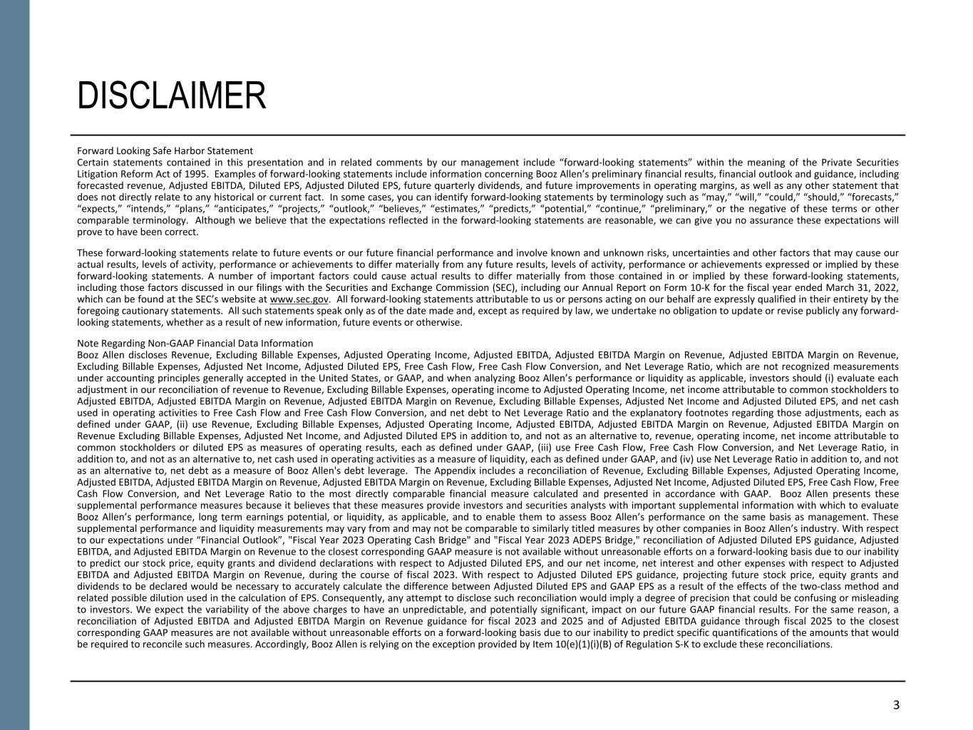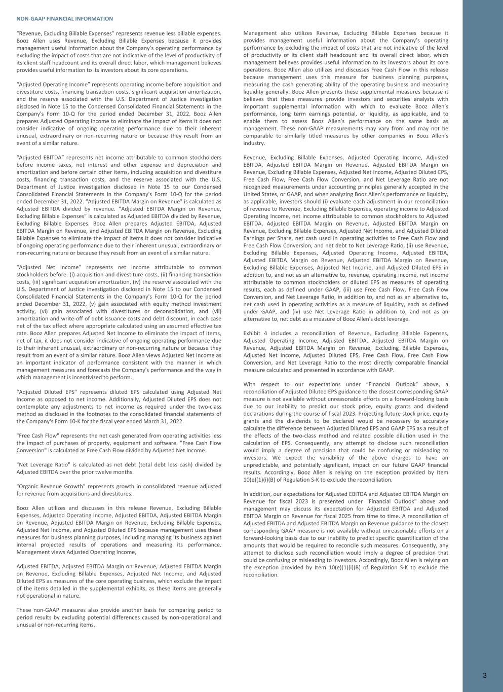 NON-GAAP FINANCIAL INFORMATION “Revenue, Excluding Billable Expenses” represents revenue less billable expenses. Booz Allen uses Revenue, Excluding Billable Expenses because it provides management useful information about the Company’s operating performance by excluding the impact of costs that are not indicative of the level of productivity of its client staff headcount and its overall direct labor, which management believes provides useful information to its investors about its core operations. “Adjusted Operating Income” represents operating income before acquisition and divestiture costs, financing transaction costs, significant acquisition amortization, and the reserve associated with the U.S. Department of Justice investigation disclosed in Note 15 to the Condensed Consolidated Financial Statements in the Company's Form 10-Q for the period ended December 31, 2022. Booz Allen prepares Adjusted Operating Income to eliminate the impact of items it does not consider indicative of ongoing operating performance due to their inherent unusual, extraordinary or non-recurring nature or because they result from an event of a similar nature. “Adjusted EBITDA” represents net income attributable to common stockholders before income taxes, net interest and other expense and depreciation and amortization and before certain other items, including acquisition and divestiture costs, financing transaction costs, and the reserve associated with the U.S. Department of Justice investigation disclosed in Note 15 to our Condensed Consolidated Financial Statements in the Company's Form 10-Q for the period ended December 31, 2022. “Adjusted EBITDA Margin on Revenue” is calculated as Adjusted EBITDA divided by revenue. “Adjusted EBITDA Margin on Revenue, Excluding Billable Expenses” is calculated as Adjusted EBITDA divided by Revenue, Excluding Billable Expenses. Booz Allen prepares Adjusted EBITDA, Adjusted EBITDA Margin on Revenue, and Adjusted EBITDA Margin on Revenue, Excluding Billable Expenses to eliminate the impact of items it does not consider indicative of ongoing operating performance due to their inherent unusual, extraordinary or non-recurring nature or because they result from an event of a similar nature. “Adjusted Net Income” represents net income attributable to common stockholders before: (i) acquisition and divestiture costs, (ii) financing transaction costs, (iii) significant acquisition amortization, (iv) the reserve associated with the U.S. Department of Justice investigation disclosed in Note 15 to our Condensed Consolidated Financial Statements in the Company's Form 10-Q for the period ended December 31, 2022, (v) gain associated with equity method investment activity, (vi) gain associated with divestitures or deconsolidation, and (vii) amortization and write-off of debt issuance costs and debt discount, in each case net of the tax effect where appropriate calculated using an assumed effective tax rate. Booz Allen prepares Adjusted Net Income to eliminate the impact of items, net of tax, it does not consider indicative of ongoing operating performance due to their inherent unusual, extraordinary or non-recurring nature or because they result from an event of a similar nature. Booz Allen views Adjusted Net Income as an important indicator of performance consistent with the manner in which management measures and forecasts the Company's performance and the way in which management is incentivized to perform. “Adjusted Diluted EPS” represents diluted EPS calculated using Adjusted Net Income as opposed to net income. Additionally, Adjusted Diluted EPS does not contemplate any adjustments to net income as required under the two-class method as disclosed in the footnotes to the consolidated financial statements of the Company's Form 10-K for the fiscal year ended March 31, 2022. "Free Cash Flow" represents the net cash generated from operating activities less the impact of purchases of property, equipment and software. "Free Cash Flow Conversion" is calculated as Free Cash Flow divided by Adjusted Net Income. "Net Leverage Ratio" is calculated as net debt (total debt less cash) divided by Adjusted EBITDA over the prior twelve months. "Organic Revenue Growth" represents growth in consolidated revenue adjusted for revenue from acquisitions and divestitures. Booz Allen utilizes and discusses in this release Revenue, Excluding Billable Expenses, Adjusted Operating Income, Adjusted EBITDA, Adjusted EBITDA Margin on Revenue, Adjusted EBITDA Margin on Revenue, Excluding Billable Expenses, Adjusted Net Income, and Adjusted Diluted EPS because management uses these measures for business planning purposes, including managing its business against internal projected results of operations and measuring its performance. Management views Adjusted Operating Income, Adjusted EBITDA, Adjusted EBITDA Margin on Revenue, Adjusted EBITDA Margin on Revenue, Excluding Billable Expenses, Adjusted Net Income, and Adjusted Diluted EPS as measures of the core operating business, which exclude the impact of the items detailed in the supplemental exhibits, as these items are generally not operational in nature. These non-GAAP measures also provide another basis for comparing period to period results by excluding potential differences caused by non-operational and unusual or non-recurring items. Management also utilizes Revenue, Excluding Billable Expenses because it provides management useful information about the Company’s operating performance by excluding the impact of costs that are not indicative of the level of productivity of its client staff headcount and its overall direct labor, which management believes provides useful information to its investors about its core operations. Booz Allen also utilizes and discusses Free Cash Flow in this release because management uses this measure for business planning purposes, measuring the cash generating ability of the operating business and me