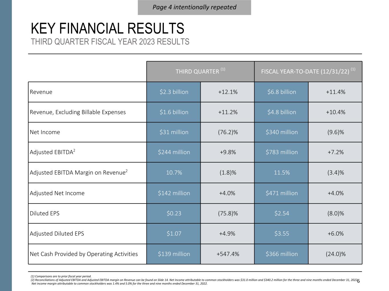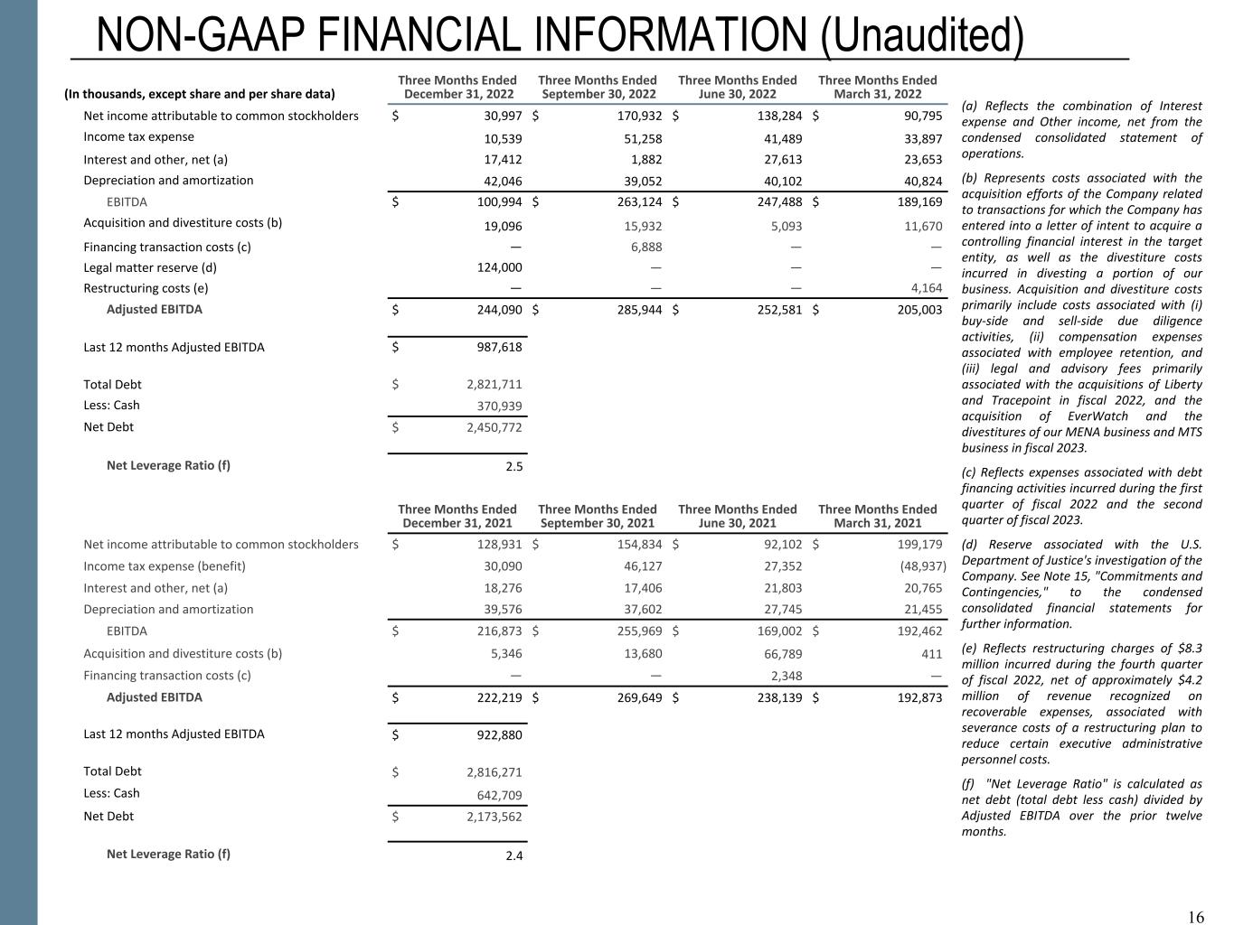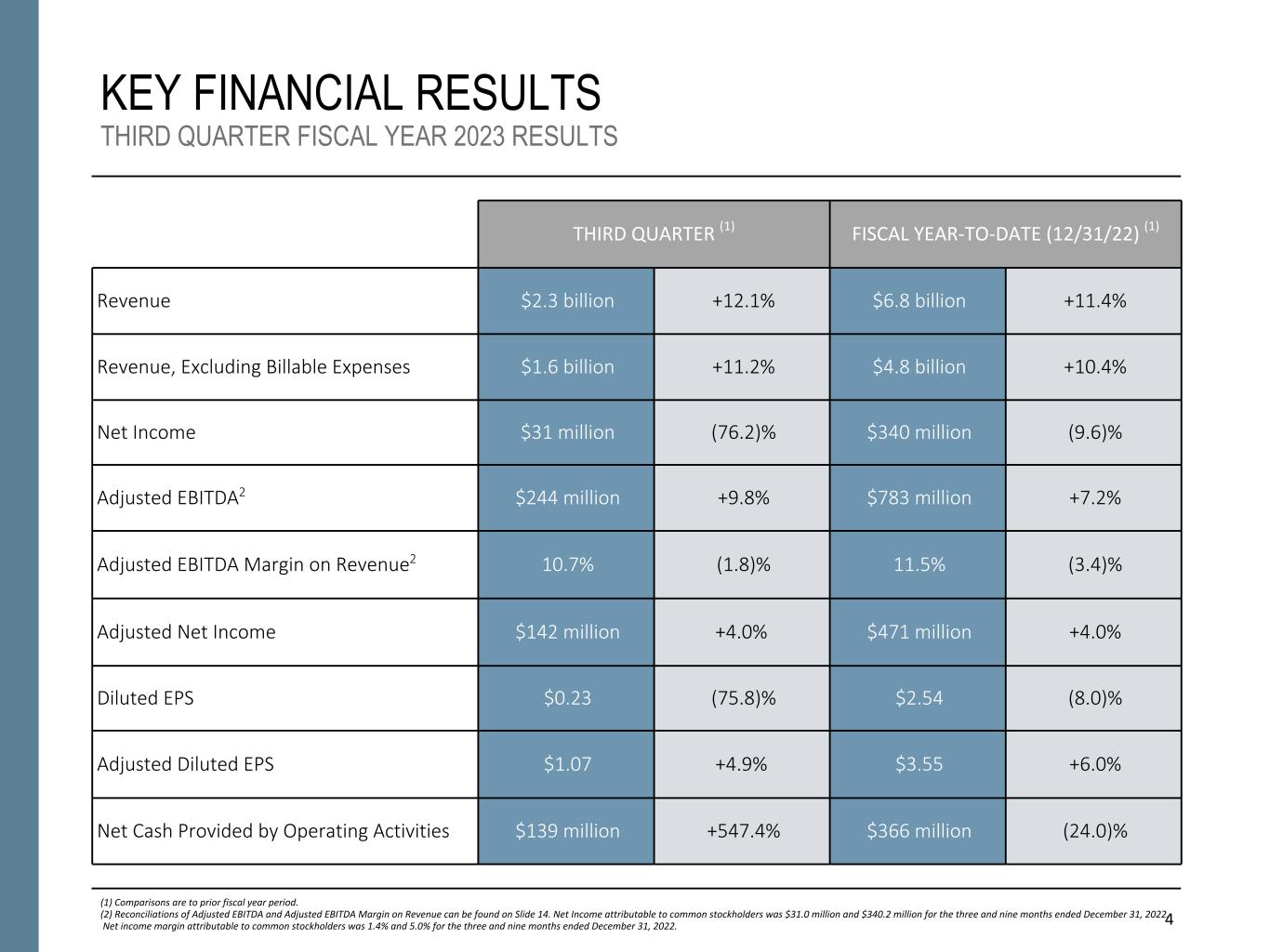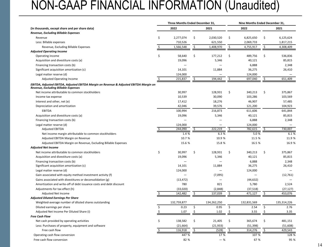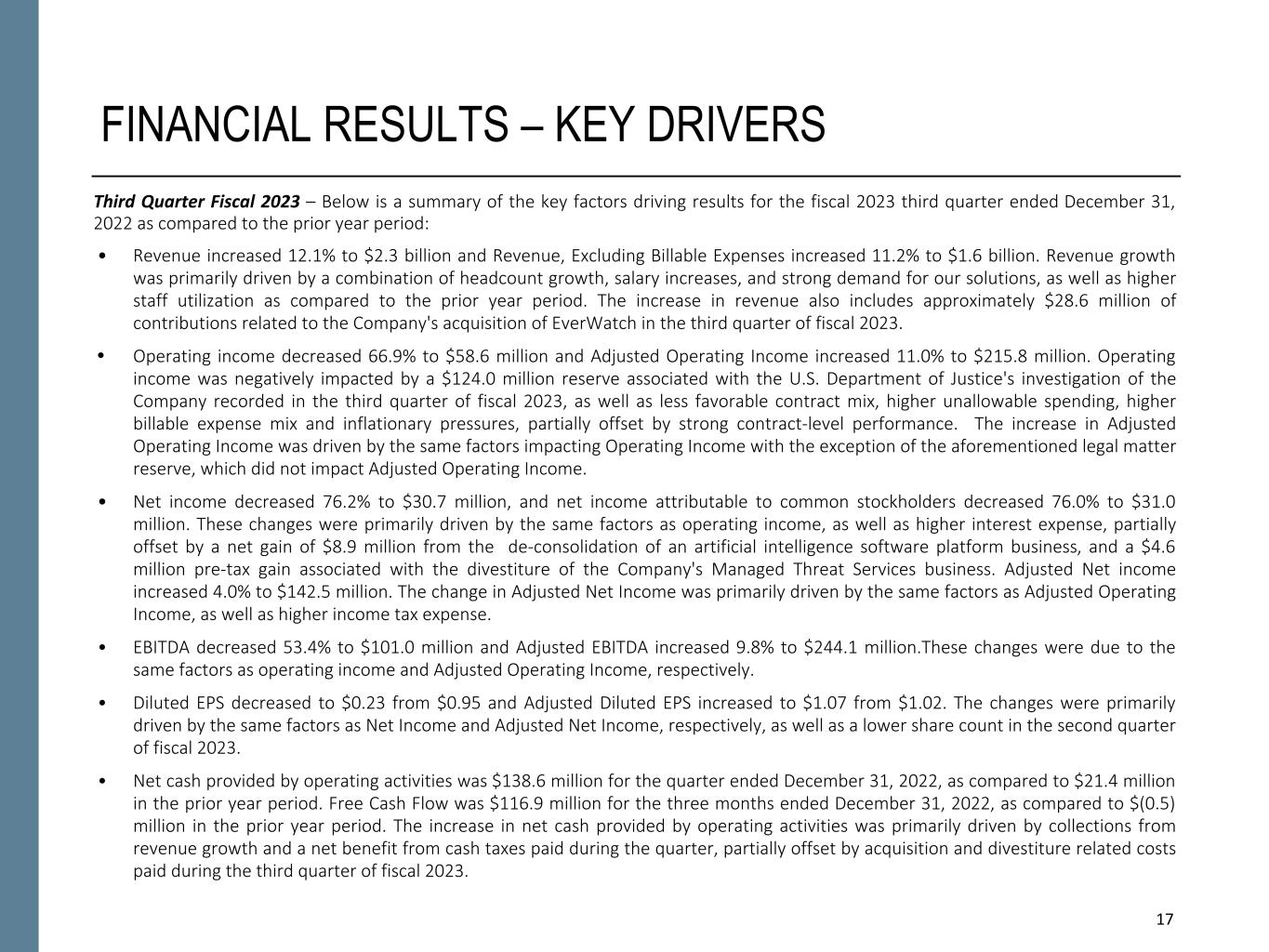 NON-GAAP FINANCIAL INFORMATION “Revenue, Excluding Billable Expenses” represents revenue less billable expenses. Booz Allen uses Revenue, Excluding Billable Expenses because it provides management useful information about the Company’s operating performance by excluding the impact of costs that are not indicative of the level of productivity of its client staff headcount and its overall direct labor, which management believes provides useful information to its investors about its core operations. “Adjusted Operating Income” represents operating income before acquisition and divestiture costs, financing transaction costs, significant acquisition amortization, and the reserve associated with the U.S. Department of Justice investigation disclosed in Note 15 to the Condensed Consolidated Financial Statements in the Company's Form 10-Q for the period ended December 31, 2022. Booz Allen prepares Adjusted Operating Income to eliminate the impact of items it does not consider indicative of ongoing operating performance due to their inherent unusual, extraordinary or non-recurring nature or because they result from an event of a similar nature. “Adjusted EBITDA” represents net income attributable to common stockholders before income taxes, net interest and other expense and depreciation and amortization and before certain other items, including acquisition and divestiture costs, financing transaction costs, and the reserve associated with the U.S. Department of Justice investigation disclosed in Note 15 to our Condensed Consolidated Financial Statements in the Company's Form 10-Q for the period ended December 31, 2022. “Adjusted EBITDA Margin on Revenue” is calculated as Adjusted EBITDA divided by revenue. “Adjusted EBITDA Margin on Revenue, Excluding Billable Expenses” is calculated as Adjusted EBITDA divided by Revenue, Excluding Billable Expenses. Booz Allen prepares Adjusted EBITDA, Adjusted EBITDA Margin on Revenue, and Adjusted EBITDA Margin on Revenue, Excluding Billable Expenses to eliminate the impact of items it does not consider indicative of ongoing operating performance due to their inherent unusual, extraordinary or non-recurring nature or because they result from an event of a similar nature. “Adjusted Net Income” represents net income attributable to common stockholders before: (i) acquisition and divestiture costs, (ii) financing transaction costs, (iii) significant acquisition amortization, (iv) the reserve associated with the U.S. Department of Justice investigation disclosed in Note 15 to our Condensed Consolidated Financial Statements in the Company's Form 10-Q for the period ended December 31, 2022, (v) gain associated with equity method investment activity, (vi) gain associated with divestitures or deconsolidation, and (vii) amortization and write-off of debt issuance costs and debt discount, in each case net of the tax effect where appropriate calculated using an assumed effective tax rate. Booz Allen prepares Adjusted Net Income to eliminate the impact of items, net of tax, it does not consider indicative of ongoing operating performance due to their inherent unusual, extraordinary or non-recurring nature or because they result from an event of a similar nature. Booz Allen views Adjusted Net Income as an important indicator of performance consistent with the manner in which management measures and forecasts the Company's performance and the way in which management is incentivized to perform. “Adjusted Diluted EPS” represents diluted EPS calculated using Adjusted Net Income as opposed to net income. Additionally, Adjusted Diluted EPS does not contemplate any adjustments to net income as required under the two-class method as disclosed in the footnotes to the consolidated financial statements of the Company's Form 10-K for the fiscal year ended March 31, 2022. "Free Cash Flow" represents the net cash generated from operating activities less the impact of purchases of property, equipment and software. "Free Cash Flow Conversion" is calculated as Free Cash Flow divided by Adjusted Net Income. "Net Leverage Ratio" is calculated as net debt (total debt less cash) divided by Adjusted EBITDA over the prior twelve months. "Organic Revenue Growth" represents growth in consolidated revenue adjusted for revenue from acquisitions and divestitures. Booz Allen utilizes and discusses in this release Revenue, Excluding Billable Expenses, Adjusted Operating Income, Adjusted EBITDA, Adjusted EBITDA Margin on Revenue, Adjusted EBITDA Margin on Revenue, Excluding Billable Expenses, Adjusted Net Income, and Adjusted Diluted EPS because management uses these measures for business planning purposes, including managing its business against internal projected results of operations and measuring its performance. Management views Adjusted Operating Income, Adjusted EBITDA, Adjusted EBITDA Margin on Revenue, Adjusted EBITDA Margin on Revenue, Excluding Billable Expenses, Adjusted Net Income, and Adjusted Diluted EPS as measures of the core operating business, which exclude the impact of the items detailed in the supplemental exhibits, as these items are generally not operational in nature. These non-GAAP measures also provide another basis for comparing period to period results by excluding potential differences caused by non-operational and unusual or non-recurring items. Management also utilizes Revenue, Excluding Billable Expenses because it provides management useful information about the Company’s operating performance by excluding the impact of costs that are not indicative of the level of productivity of its client staff headcount and its overall direct labor, which management believes provides useful information to its investors about its core operations. Booz Allen also utilizes and discusses Free Cash Flow in this release because management uses this measure for business planning purposes, measuring the cash generating ability of the operating business and me