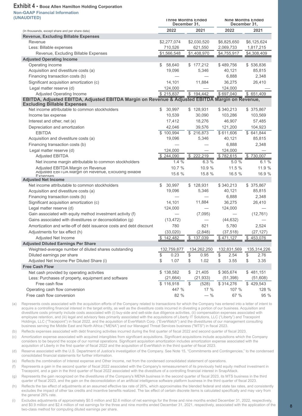 Exhibit 4 - Booz Allen Hamilton Holding Corporation Non-GAAP Financial Information (UNAUDITED) 8 Three Months Ended December 31, Nine Months Ended December 31, (In thousands, except share and per share data) 2022 2021 2022 2021 Revenue, Excluding Billable Expenses Revenue $ 2,277,074 $ 2,030,520 $ 6,825,650 $ 6,125,624 Less: Billable expenses 710,526 621,550 2,069,733 1,817,215 Revenue, Excluding Billable Expenses $ 1,566,548 $ 1,408,970 $ 4,755,917 $ 4,308,409 Adjusted Operating Income Operating income $ 58,640 $ 177,212 $ 489,756 $ 536,836 Acquisition and divestiture costs (a) 19,096 5,346 40,121 85,815 Financing transaction costs (b) — — 6,888 2,348 Significant acquisition amortization (c) 14,101 11,884 36,275 26,410 Legal matter reserve (d) 124,000 — 124,000 — Adjusted Operating Income $ 215,837 $ 194,442 $ 697,040 $ 651,409 EBITDA, Adjusted EBITDA, Adjusted EBITDA Margin on Revenue & Adjusted EBITDA Margin on Revenue, Excluding Billable Expenses Net income attributable to common stockholders $ 30,997 $ 128,931 $ 340,213 $ 375,867 Income tax expense 10,539 30,090 103,286 103,569 Interest and other, net (e) 17,412 18,276 46,907 57,485 Depreciation and amortization 42,046 39,576 121,200 104,923 EBITDA $ 100,994 $ 216,873 $ 611,606 $ 641,844 Acquisition and divestiture costs (a) 19,096 5,346 40,121 85,815 Financing transaction costs (b) — — 6,888 2,348 Legal matter reserve (d) 124,000 — 124,000 — Adjusted EBITDA $ 244,090 $ 222,219 $ 782,615 $ 730,007 Net income margin attributable to common stockholders 1.4 % 6.3 % 5.0 % 6.1 % Adjusted EBITDA Margin on Revenue 10.7 % 10.9 % 11.5 % 11.9 % Adjusted EBITDA Margin on Revenue, Excluding Billable Expenses 15.6 % 15.8 % 16.5 % 16.9 % Adjusted Net Income Net income attributable to common stockholders $ 30,997 $ 128,931 $ 340,213 $ 375,867 Acquisition and divestiture costs (a) 19,096 5,346 40,121 85,815 Financing transaction costs (b) — — 6,888 2,348 Significant acquisition amortization (c) 14,101 11,884 36,275 26,410 Legal matter reserve (d) 124,000 — 124,000 — Gain associated with equity method investment activity (f) — (7,095) — (12,761) Gains associated with divestitures or deconsolidation (g) (13,472) — (44,632) — Amortization and write-off of debt issuance costs and debt discount 780 821 5,780 2,524 Adjustments for tax effect (h) (33,020) (2,848) (37,518) (27,127) Adjusted Net Income $ 142,482 $ 137,039 $ 471,127 $ 453,076 Adjusted Diluted Earnings Per Share Weighted-average number of diluted shares outstanding 132,759,877 134,262,250 132,831,569 135,314,226 Diluted earnings per share $ 0.23 $ 0.95 $ 2.54 $ 2.76 Adjusted Net Income Per Diluted Share (i) $ 1.07 $ 1.02 $ 3.55 $ 3.35 Free Cash Flow Net cash provided by operating activities $ 138,582 $ 21,405 $ 365,674 $ 481,151 Less: Purchases of property, equipment and software (21,664) (21,933) (51,398) (51,608) Free cash flow $ 116,918 $ (528) $ 314,276 $ 429,543 Operating cash flow conversion 447 % 17 % 107 % 128 % Free cash flow conversion 82 % — % 67 % 95 % 8 (a) Represents costs associated with the acquisition efforts of the Company related to transactions for which the Company has entered into a letter of intent to acquire a controlling financial interest in the target entity, as well as the divestiture costs incurred in divesting a portion of our business. Acquisition and divestiture costs primarily include costs associated with (i) buy-side and sell-side due diligence activities, (ii) compensation expenses associated with employee retention, and (iii) legal and advisory fees primarily associated with the acquisitions of Liberty IT Solutions, LLC (“Liberty”) and Tracepoint Holdings, LLC (“Tracepoint”) in fiscal 2022, and the acquisition of EverWatch Corp. (“EverWatch”) and the divestitures of our management consulting business serving the Middle East and North Africa (“MENA”) and our Managed Threat Services business ("MTS") in fiscal 2023. (b) Reflects expenses associated with debt financing activities incurred during the first quarter of fiscal 2022 and second quarter of fiscal 2023. (c) Amortization expense associated with acquired intangibles from significant acquisitions. Significant acquisitions include acquisitions which the Company considers to be beyond the scope of our normal operations. Significant acquisition amortization includes amortization expense associated with the acquisition of Liberty in the first quarter of fiscal 2022 and the acquisition of EverWatch in the third quarter of fiscal 2023. (d) Reserve associated with the U.S. Department of Justice's investigation of the Company. See Note 15, “Commitments and Contingencies,” to the condensed consolidated financial statements for further information. (e) Reflects the combination of Interest expense and Other income, net from the condensed consolidated statement of operations. (f) Represents a gain in the second quarter of fiscal 2022 associated with the Company's remeasurement of its previously held equity method investment in Tracepoint, and a gain in the third quarter of fiscal 2022 associated with the divestiture of a controlling financial interest in SnapAttack. (g) Represents the gain recognized on the divestitures of the Company's MENA business in the second quarter of fiscal 2023, its MTS business in the third quarter of fiscal 2023, and the gain on the deconsolidation of an artificial intelligence software platform business in the third quarter of fiscal 2023. (h) Reflects the tax effect of adjustments at an assumed effective tax rate of 26%, which approximates the blended federal and state tax rates, and consistently excludes the impact of other tax credits and incentive benefits realized. The tax effect of certain discrete items is calculated specifically and may vary from the general 26% rate. (i) Excludes adjustments of approximately $0.5 million and $2.6 million of net earnings for the three and nine months ended December 31, 2022, respectively, and 