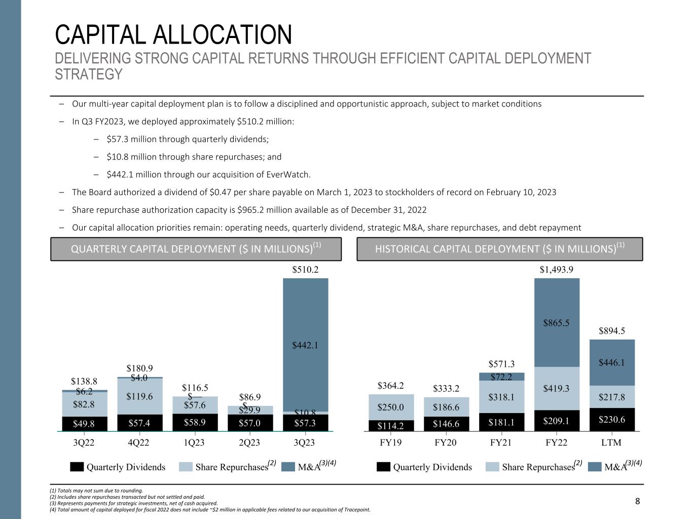 Exhibit 3 Booz Allen Hamilton Holding Corporation Condensed Consolidated Statements of Cash Flows (UNAUDITED) 7 Nine Months Ended December 31, (Amounts in thousands) 2022 2021 Cash flows from operating activities Net income $ 339,563 $ 375,782 Adjustments to reconcile net income to net cash provided by operating activities: Depreciation and amortization 121,200 104,923 Noncash lease expense 41,632 41,718 Stock-based compensation expense 50,992 45,187 Amortization of debt issuance costs 3,329 3,463 Loss on debt extinguishment 10,251 2,515 Gain on dispositions, and other (45,711) (3,564) Gain associated with equity method investment activities — (12,761) Changes in assets and liabilities: Accounts receivable, net (169,375) (150,156) Deferred income taxes and income taxes receivable / payable (206,065) 38,453 Prepaid expenses and other current and long-term assets 178,383 (19,953) Accrued compensation and benefits 2,815 (5,371) Accounts payable and other accrued expenses 79,550 88,529 Other current and long-term liabilities (40,890) (27,614) Net cash provided by operating activities 365,674 481,151 Cash flows from investing activities Purchases of property, equipment, and software (51,398) (51,608) Payments for business acquisitions, net of cash acquired (440,069) (780,213) Payments for cost method investments (2,000) (3,000) Proceeds from sale of businesses 53,409 — Other investing activities — (427) Net cash used in investing activities (440,058) (835,248) Cash flows from financing activities Proceeds from issuance of common stock 18,003 17,240 Stock option exercises 10,705 3,558 Repurchases of common stock (114,075) (315,148) Cash dividends paid (173,216) (151,664) Repayments on revolving credit facility, term loans, and Senior Notes (406,755) (95,162) Net proceeds from debt issuance 414,751 487,027 Proceeds from revolving credit facility — 60,000 Net cash (used in) provided by financing activities (250,587) 5,851 Net decrease in cash and cash equivalents (324,971) (348,246) Cash and cash equivalents––beginning of period 695,910 990,955 Cash and cash equivalents––end of period $ 370,939 $ 642,709 Supplemental disclosures of cash flow information Net cash paid during the period for: Interest $ 67,782 $ 34,185 Income taxes $ 123,214 $ 62,142 7