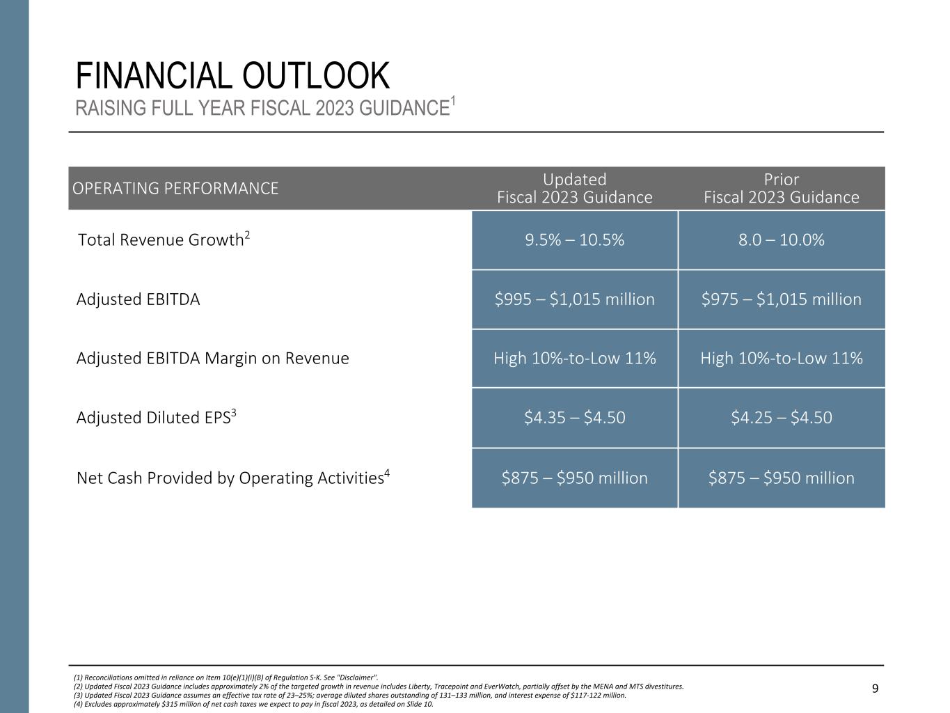 FINANCIAL OUTLOOK The Company is updating its fiscal year 2023 guidance3, as noted in the table below: CONFERENCE CALL INFORMATION Booz Allen Hamilton will host a conference call at 8 a.m. EST on Friday, January 27, 2023, to discuss the financial results for its third quarter fiscal year 2023. Analysts and institutional investors may participate on the call by registering online at investors.boozallen.com. Participants are requested to register a minimum 15 minutes before the start of the call. The conference call will be webcast simultaneously to the public through a link on the investor relations section of the Booz Allen Hamilton website at investors.boozallen.com. A replay of the conference call will be available online at investors.boozallen.com beginning at 11 a.m. EST on January 27, 2023 and continuing for 30 days. 3 Reconciliations omitted in reliance on Item 10(e)(1)(i)(B) of Regulation S-K. See "Non-GAAP Financial Information. 4 Updated Fiscal 2023 Guidance includes approximately 2% of the targeted growth in revenue includes Liberty, Tracepoint and EverWatch, partially offset by the MENA and MTS divestitures. 5 Updated Fiscal 2023 Guidance assumes an effective tax rate of 23–25%; average diluted shares outstanding of 131–133 million, and interest expense of $117-122 million. 6 Excludes approximately $315 million of net cash taxes we expect to pay in fiscal year 2023, which includes approximately $140 million associated with our interpretation of the current Section 174 legislation. Inclusive of cash to be paid for income taxes, we anticipate our total Operating Cash Flow for fiscal year 2023 will be between $560 million to $635 million. 2 Condensed Consolidated Financial Statements as of and for the three and nine months ended December 31, 2022 for additional information regarding this matter. Compared to the third quarter fiscal 2022, the third quarter fiscal 2023 total backlog increased by 8.2 percent to $30.0 billion and the quarterly book-to-bill ratio was 0.09x. As of December 31, 2022, client staff headcount was 1,975 higher than at the end of the prior year period, an increase of 7.5 percent and 1,061 higher than the end of the prior quarter. Total headcount was 1,677 higher than at the end of the prior year period, an increase of 5.7 percent, and 1,118 higher than the end of the prior quarter. For the nine months ended December 31, 2022, net cash provided by operating activities was $365.7 million, as compared to $481.2 million in the prior year period. Free cash flow for the nine months ended December 31, 2022 was $314.3 million, as compared to $429.5 million in the prior year period. The Company declared a regular quarterly dividend of $0.47 per share, which is payable on March 1, 2023 to stockholders of record on February 10, 2023. Additionally, in November 2022, the Company released its Environmental, Social, Governance (ESG) Impact Report demonstrating continued alignment among ESG management, VoLT growth strategy, and sustainable value creation for stakeholders. ABOUT BOOZ ALLEN HAMILTON For more than 100 years, military, government, and business leaders have turned to Booz Allen Hamilton to solve their most complex problems. As a consulting firm with experts in analytics, digital solutions, engineering, and cyber, we help organizations transform. We are a key partner on some of the most innovative programs for governments worldwide and trusted by their most sensitive agencies. We work shoulder-to-shoulder with clients, using a mission-first approach to choose the right strategy and technology to help them realize their vision. With global headquarters in McLean, Virginia, our firm employs approximately 31,100 people globally as of December 31, 2022, and had revenue of $8.4 billion for the 12 months ended March 31, 2022. To learn more, visit www.boozallen.com. (NYSE: BAH) OPERATING PERFORMANCE UPDATED FISCAL 2023 GUIDANCE PRIOR FISCAL 2023 GUIDANCE Revenue Growth4 9.5 – 10.5% 8.0 – 10.0% Adjusted EBITDA $995 – $1,015 million $975 – $1,015 million Adjusted EBITDA Margin on Revenue High 10% to Low 11% High 10% to Low 11% Adjusted Diluted EPS5 $4.35 – $4.50 $4.25 – $4.50 Net Cash Provided by Operating Activities6 $875 – $950 million $875 – $950 million YEAR-TO-DATE FY232 (changes are compared to prior year period) REVENUE: $6.83B +11.4 % EX. BILLABLE EXPENSES: $4.76B +10.4 % OPERATING INCOME: $489.8M (8.8) % ADJ. OPERATING INCOME: $697.0M +7.0 % NET INCOME: $339.6M (9.6) % NET INCOME ATTRIBUTABLE TO COMMON STOCKHOLDERS: $340.2M (9.5) % ADJUSTED NET INCOME: $471.1M +4.0 % EBITDA: $611.6M (4.7) % ADJUSTED EBITDA: $782.6M +7.2 % DILUTED EPS: $2.54 down from $2.76 ADJUSTED DILUTED EPS: $3.55 up from $3.35
