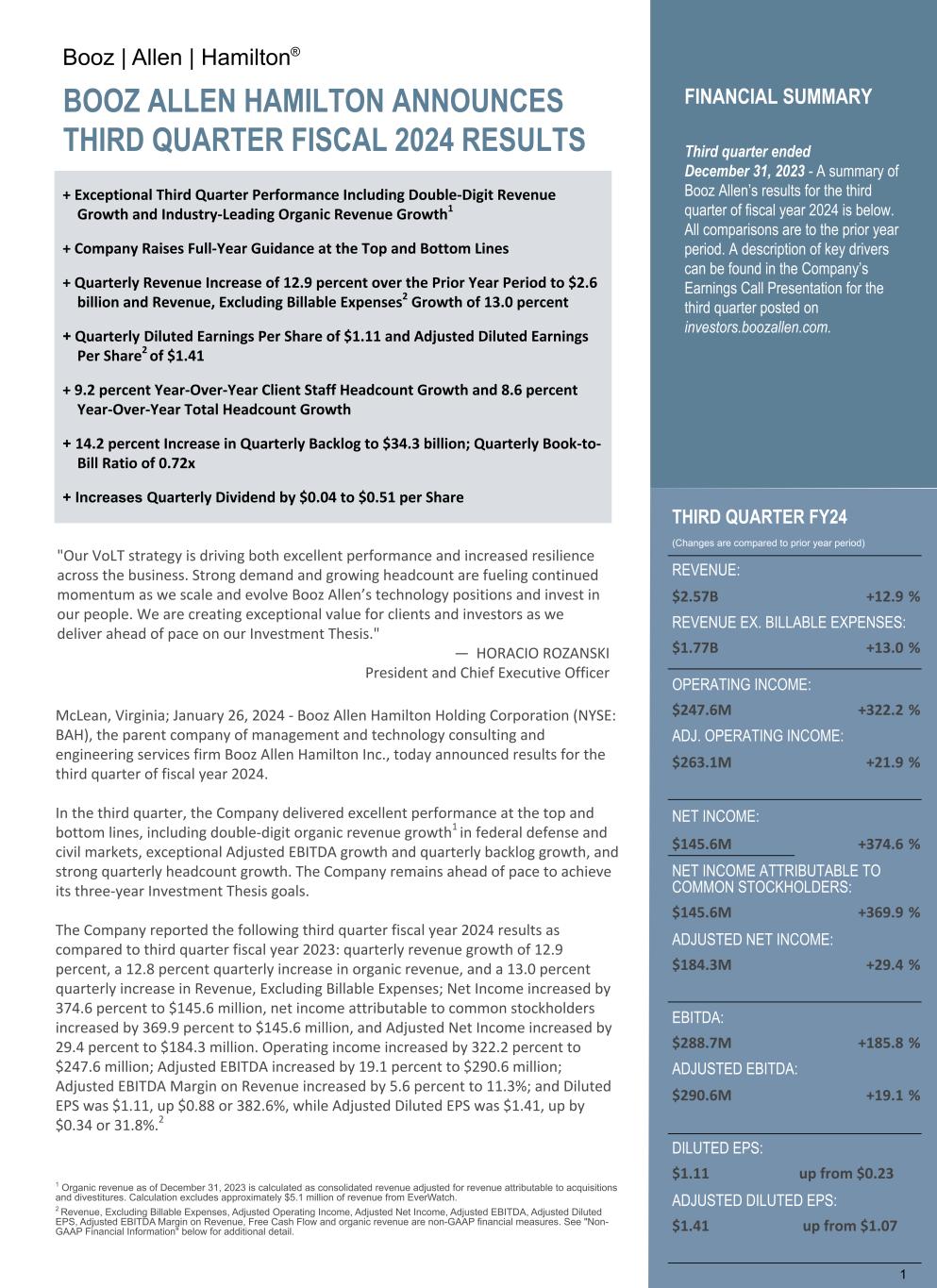 Booz | Allen | Hamilton® BOOZ ALLEN HAMILTON ANNOUNCES THIRD QUARTER FISCAL 2024 RESULTS + Exceptional Third Quarter Performance Including Double-Digit Revenue Growth and Industry-Leading Organic Revenue Growth1 + Company Raises Full-Year Guidance at the Top and Bottom Lines + Quarterly Revenue Increase of 12.9 percent over the Prior Year Period to $2.6 billion and Revenue, Excluding Billable Expenses2 Growth of 13.0 percent + Quarterly Diluted Earnings Per Share of $1.11 and Adjusted Diluted Earnings Per Share2 of $1.41 + 9.2 percent Year-Over-Year Client Staff Headcount Growth and 8.6 percent Year-Over-Year Total Headcount Growth + 14.2 percent Increase in Quarterly Backlog to $34.3 billion; Quarterly Book-to- Bill Ratio of 0.72x + Increases Quarterly Dividend by $0.04 to $0.51 per Share "Our VoLT strategy is driving both excellent performance and increased resilience across the business. Strong demand and growing headcount are fueling continued momentum as we scale and evolve Booz Allen’s technology positions and invest in our people. We are creating exceptional value for clients and investors as we deliver ahead of pace on our Investment Thesis." — HORACIO ROZANSKI President and Chief Executive Officer McLean, Virginia; January 26, 2024 - Booz Allen Hamilton Holding Corporation (NYSE: BAH), the parent company of management and technology consulting and engineering services firm Booz Allen Hamilton Inc., today announced results for the third quarter of fiscal year 2024. In the third quarter, the Company delivered excellent performance at the top and bottom lines, including double-digit organic revenue growth1 in federal defense and civil markets, exceptional Adjusted EBITDA growth and quarterly backlog growth, and strong quarterly headcount growth. The Company remains ahead of pace to achieve its three-year Investment Thesis goals. The Company reported the following third quarter fiscal year 2024 results as compared to third quarter fiscal year 2023: quarterly revenue growth of 12.9 percent, a 12.8 percent quarterly increase in organic revenue, and a 13.0 percent quarterly increase in Revenue, Excluding Billable Expenses; Net Income increased by 374.6 percent to $145.6 million, net income attributable to common stockholders increased by 369.9 percent to $145.6 million, and Adjusted Net Income increased by 29.4 percent to $184.3 million. Operating income increased by 322.2 percent to $247.6 million; Adjusted EBITDA increased by 19.1 percent to $290.6 million; Adjusted EBITDA Margin on Revenue increased by 5.6 percent to 11.3%; and Diluted EPS was $1.11, up $0.88 or 382.6%, while Adjusted Diluted EPS was $1.41, up by $0.34 or 31.8%.2 1 Organic revenue as of December 31, 2023 is calculated as consolidated revenue adjusted for revenue attributable to acquisitions and divestitures. Calculation excludes approximately $5.1 million of revenue from EverWatch. 2 Revenue, Excluding Billable Expenses, Adjusted Operating Income, Adjusted Net Income, Adjusted EBITDA, Adjusted Diluted EPS, Adjusted EBITDA Margin on Revenue, Free Cash Flow and organic revenue are non-GAAP financial measures. See "Non- GAAP Financial Information" below for additional detail. 1 THIRD QUARTER FY24 (Changes are compared to prior year period) REVENUE: $2.57B +12.9 % REVENUE EX. BILLABLE EXPENSES: $1.77B +13.0 % OPERATING INCOME: $247.6M +322.2 % ADJ. OPERATING INCOME: $263.1M +21.9 % NET INCOME: $145.6M +374.6 % NET INCOME ATTRIBUTABLE TO COMMON STOCKHOLDERS: $145.6M +369.9 % ADJUSTED NET INCOME: $184.3M +29.4 % EBITDA: $288.7M +185.8 % ADJUSTED EBITDA: $290.6M +19.1 % DILUTED EPS: $1.11 up from $0.23 ADJUSTED DILUTED EPS: $1.41 up from $1.07 FINANCIAL SUMMARY Third quarter ended December 31, 2023 - A summary of Booz Allen’s results for the third quarter of fiscal year 2024 is below. All comparisons are to the prior year period. A description of key drivers can be found in the Company’s Earnings Call Presentation for the third quarter posted on investors.boozallen.com.
