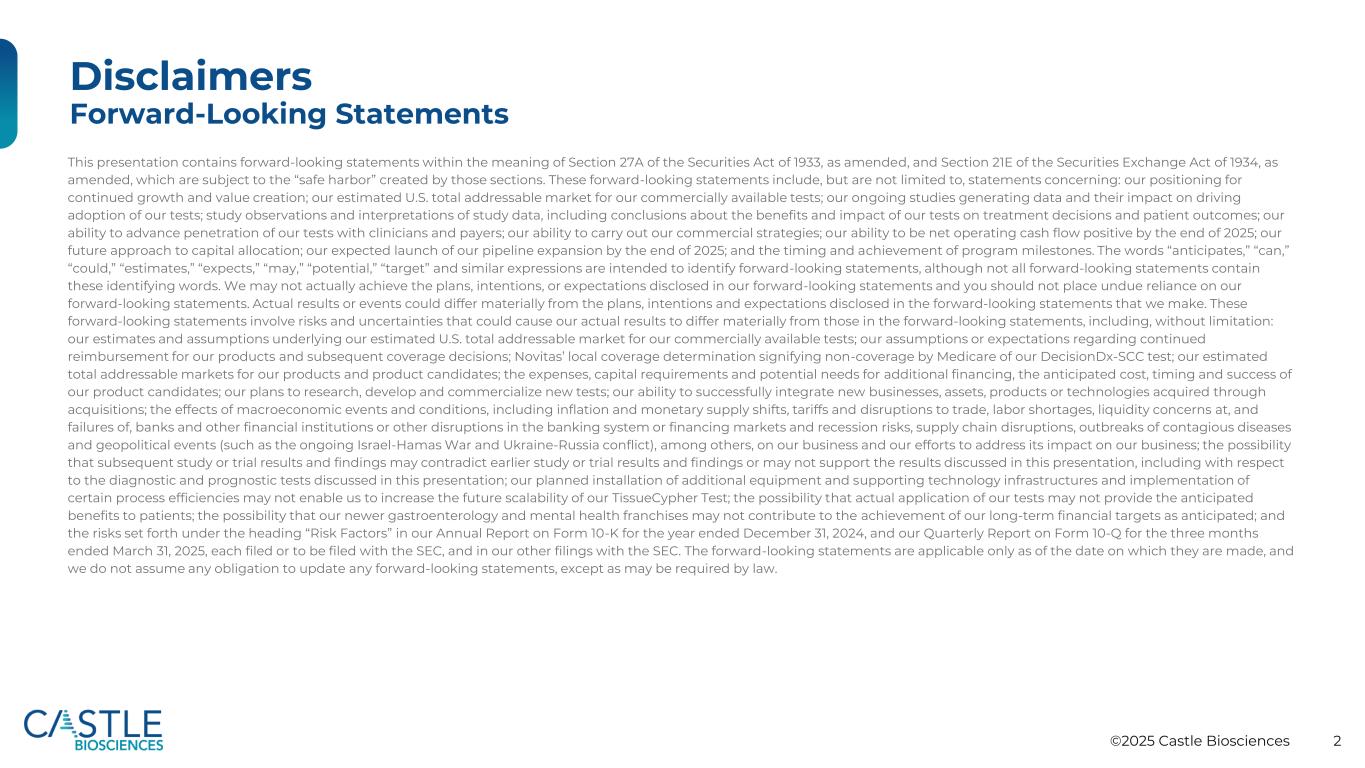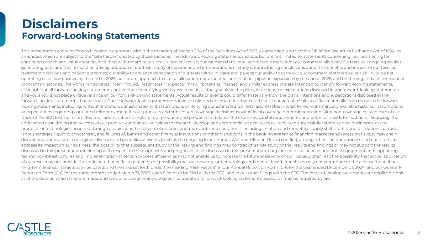 本プレスリリースに記載されている検査、当社が計画している追加設備とそれを支える技術基盤の導入、および特定のプロセス効率化の実施により、当社のTissueCypher検査の将来的な拡張性を高めることができない可能性、当社の検査を実際に適用しても前述のような利益が患者にもたらされない可能性;2024年12月31日に終了した年度の年次報告書(Form 10-K)および2025年3月31日に終了した四半期の四半期報告書(Form 10-Q)(それぞれSECに提出済みまたは提出予定)、ならびにSECへのその他の提出書類に記載されている「リスク要因」の見出しに記載されているリスク。将来予想に関する記述は、それが作成された時点においてのみ適用されるものであり、法律で義務付けられている場合を除き、当社は将来予想に関する記述を更新する義務を負いません。
