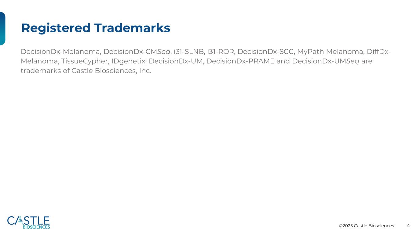 DecisionDx-Melanoma、DecisionDx-CMSeq、i31-SLNB、i31-ROR、DecisionDx-SCC、MyPath Melanoma、DiffDx-Melanoma、TissueCypher、IDgenetix、DecisionDx-UM、DecisionDx-PRAMEおよびDecisionDx-UMSeqはCastle Biosciences, Inc.の商標です。