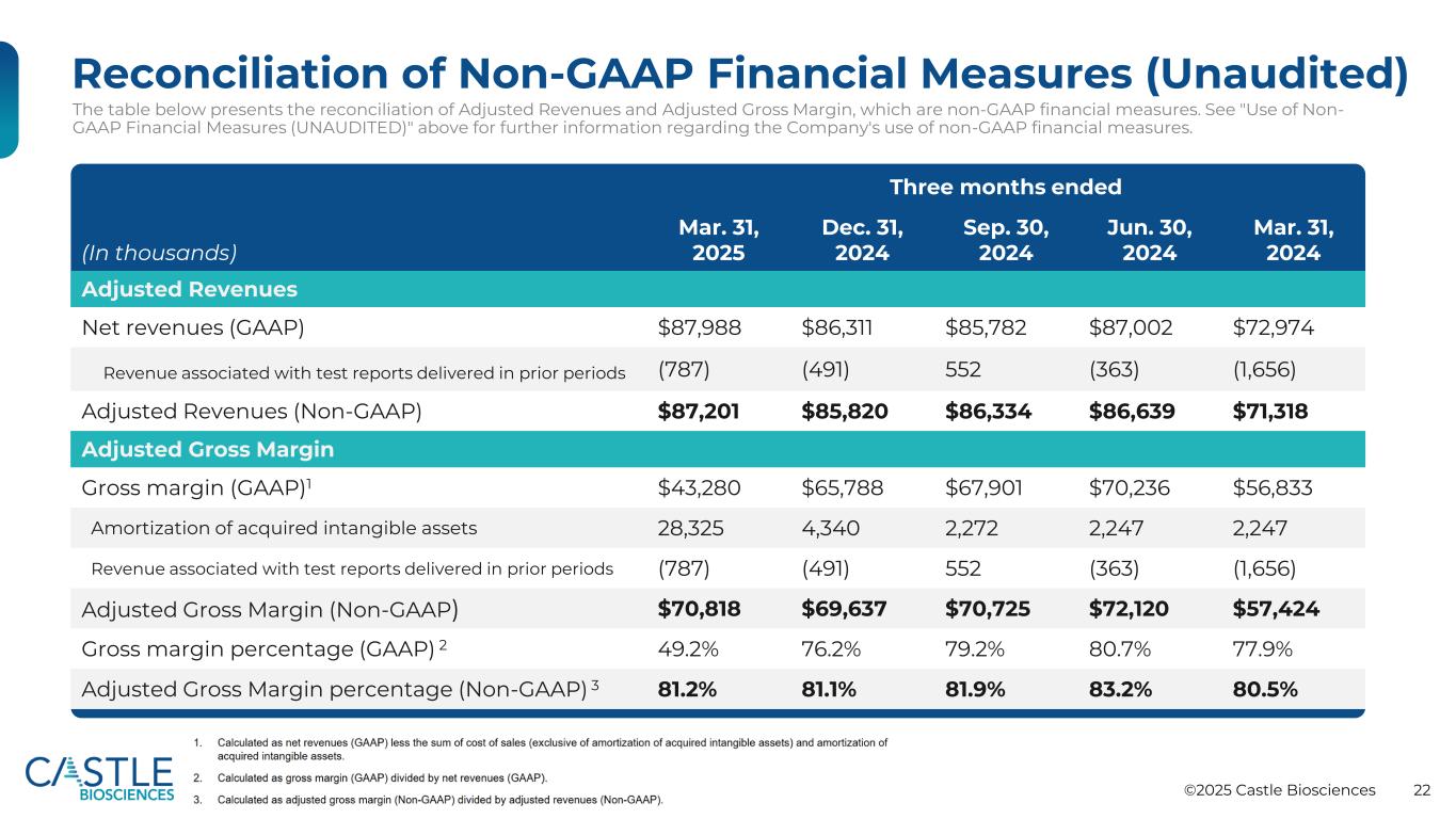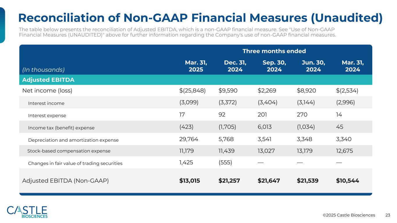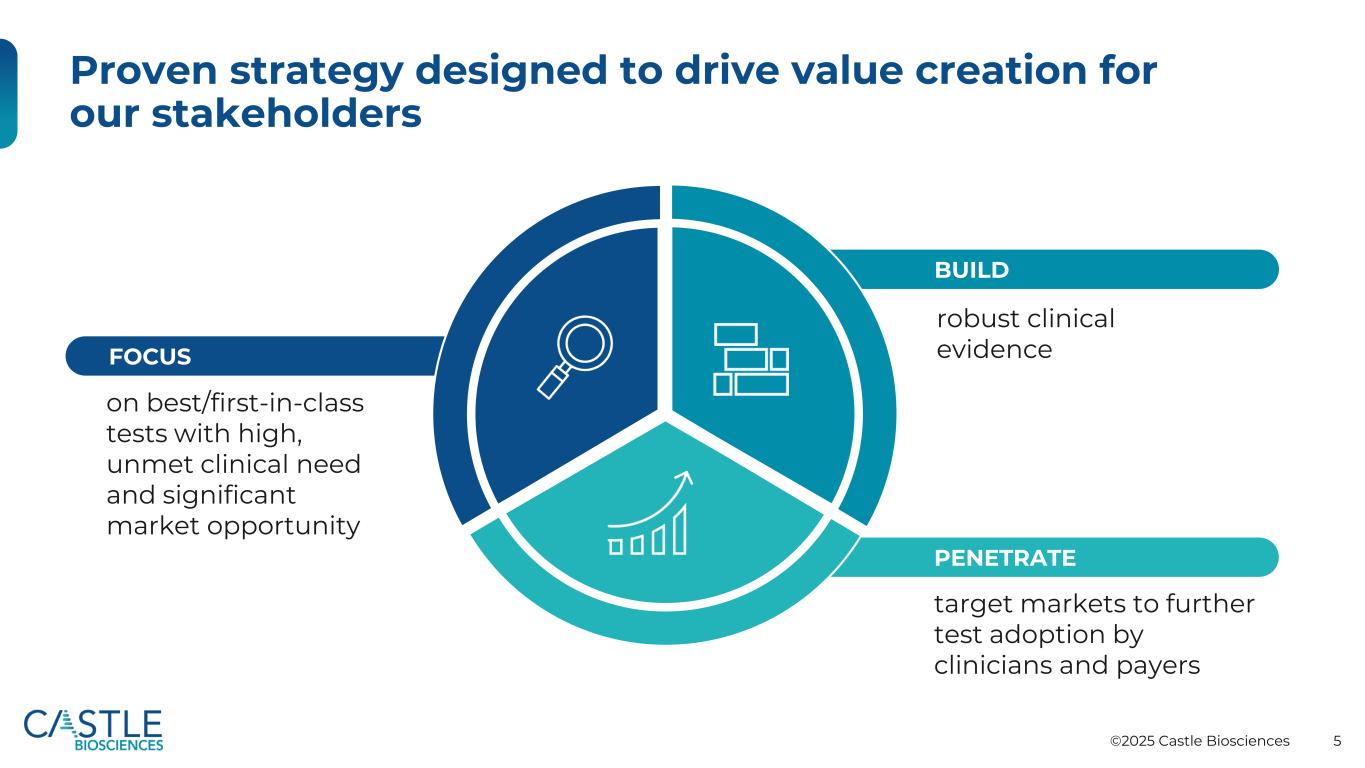 テキサス州フレンズウッド発--2025年5月5日--患者ケアの指針となる革新的な検査を通じて健康を改善するキャッスル・バイオサイエンシズ社(Nasdaq: CSTL)は本日、2025年3月31日を期末とする第1四半期の業績を発表しました。「当社の継続的な成功は、当社の検査から臨床医が受ける高い臨床的価値と、治療領域全体にわたる一貫した実行力とチームワークの両方を反映していると考えています。