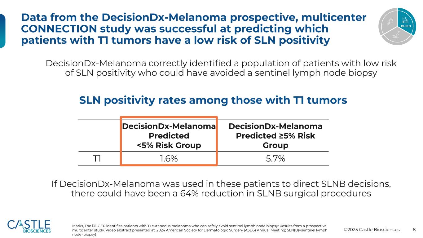 -DecisionDx-Melanoma:当社は、メラノーマ患者の SLNB の意思決定に当社の DecisionDx-Melanoma 検査が大きな影響を与えることを実証するプロスペクティブな多施設共同 試験 DECIDE 試験の報告を共有する 2 つの論文が、World Journal of Surgical Oncology and Cancer Medicine 誌に最近掲載されたことを発表した。先行研究と同様に、DecisionDx-Melanoma は、センチネルリンパ節(SLN)陽性のリスクが 5%未満で、SLNB 手術の見送りを安全に検討でき、病勢進行の可能性も低い患者を正確に特定できることを、Castle 社の DECIDE 試験の結果は裏付けています。詳細は2025年4月3日のニュースリリースを参照。