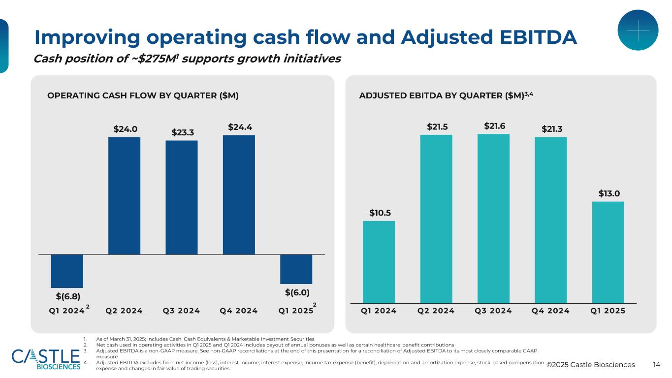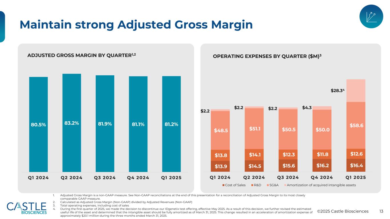 -売上総利益率は49%、調整後売上総利益率は81%であった(前年同期はそれぞれ78%、81%)。2025年第1四半期の売上総利益率は、2025年3月31日に終了した3ヵ月間に約2,010万ドルの償却費の前倒しという一時的な調整を行ったことが大きく影響しています。2025年第1四半期中、当社は2025年5月をもってIDgenetix試験の提供を中止する決定を下しました。この変更により、IDgenetixの見積残存耐用年数が変更されました。