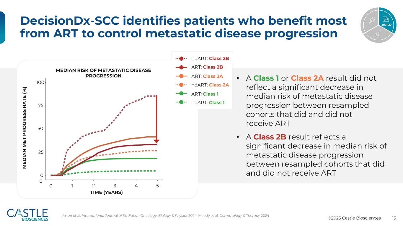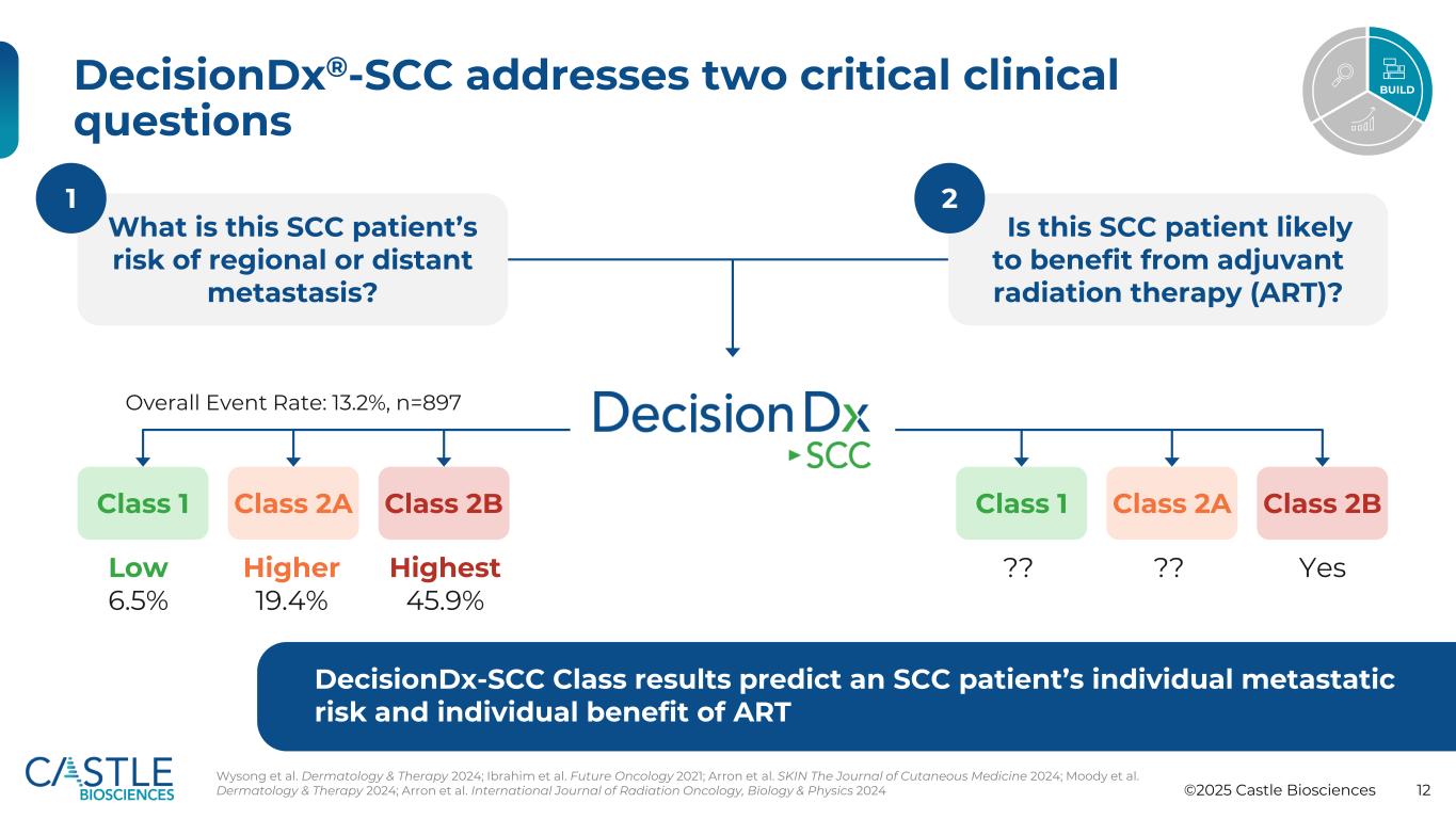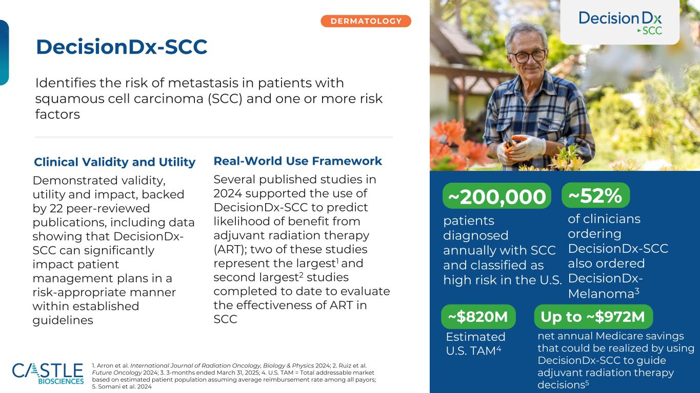 -DecisionDx-SCC:当社はまた、オーランドで開催されたNCCN2025年次総会で、DecisionDx-SCC検査に関する新しいデータを発表し、その演題は同総会でトップ5演題に選ばれた。具体的には、DecisionDx-SCC検査をNCCNガイドラインのブリガム・アンド・ウィメンズ病院(BWH)の病期分類と統合することで、予後予測精度をどのように改善できるかを評価した研究である。1つ以上のNCCN高リスク因子または超高リスク因子を有する高リスクSCC患者1,412人の新しい多施設複合コホートの解析から、DecisionDx-SCCはNCCN高リスクおよび超高リスク患者集団における転移リスク層別化を有意に改善することが示された(p<0.001)。この検査はBWH病期分類のリスク予測精度を有意に改善した(p<0.001)。より広範なNCCNリスク層別化と比較すると、DecisionDx-SCCをBWH病期分類と組み合わせた場合、Class 1(低リスク)の検査結果は転移リスクが約2倍減少し、Class 2B(高リスク)の検査結果は低病期(BWH T1/T2a)のNCCN高リスク患者においてリスクが5倍以上増加した。これらの知見は、DecisionDx-SCCを確立された病期分類法と併用することで、リスク評価を大幅に精緻化し、患者の予測される転移リスクに基づいて、より正確で個別化された治療方針の決定を可能にすることを示している。詳細については、2025年3月28日のニュースリリースを参照。