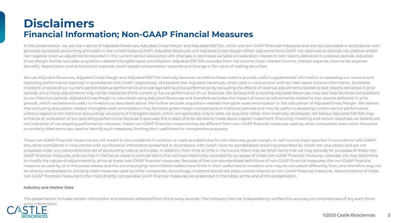 キャッスル・バイオサイエンシズは、2025 年における総収益のガイダンスを引き上げました。2025年の総収益は、従来予想の2億8,000万ドル~2億9,500万ドルに対し、2億8,700万ドル~2億9,700万ドルを見込んでいます。
