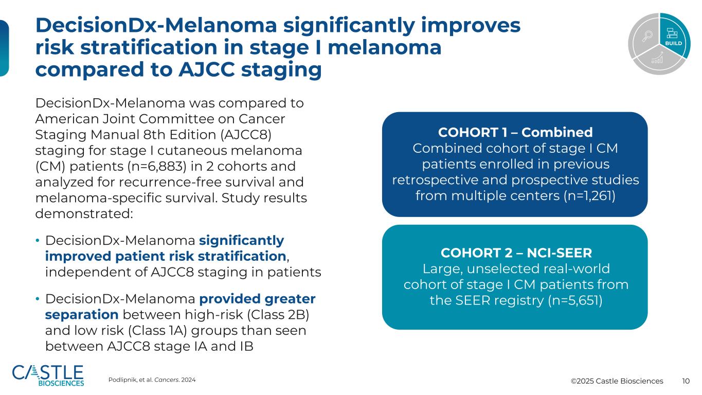 -DecisionDx-Melanoma:さらに、3月7日から11日までフロリダ州オーランドで開催された2025年AAD年次総会で、皮膚がん患者に対するDecisionDx-Melanoma検査の新しいデータを発表した。米国国立がん研究所(National Cancer Institute)のSEER Program Registriesとの共同研究によるポスター発表では、DecisionDx-Melanoma検査のリスク層別化性能の最新の検証が行われた。臨床治療の一環として DecisionDx-Melanoma 検査を受けた約 10,000 名の患者からなる大規模な非選択実臨床コホートにおいて、本検査は AJCC8 病期を超える独立した有意なリスク層別化を提供し、検査を受けなかったマッチングした患者との比較で生存率の改善と の関連を実証した。詳細については、2025年3月7日のニュースリリースを参照。