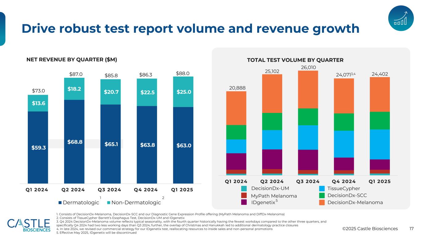 2025年第1四半期、中核収益ドライバー(DecisionDx®-Melanoma、DecisionDx®-SCC、TissueCypher®)の総検査報告数は2024年第1四半期比で33%増加