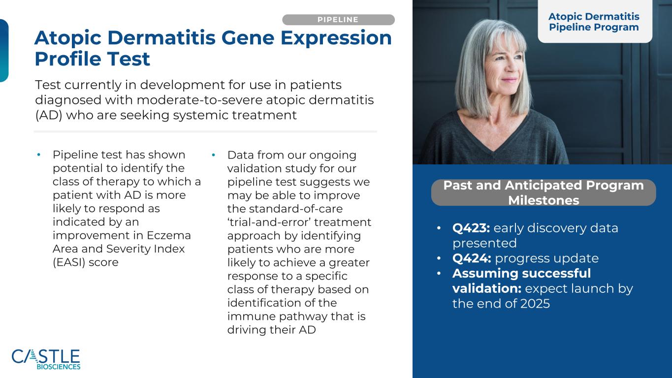 キャッスルの現在のポートフォリオは、皮膚がん、バレット食道、精神疾患、ブドウ膜黒色腫の検査で構成されている。さらに当社は、生物学的製剤による治療を希望する中等度から重度のアトピー性皮膚炎患者の全身療法選択の指針として開発中の検査を含め、これらの疾患や臨床ニーズの高い他の疾患の検査について、積極的な研究開発プログラムを実施している。詳細については、www.CastleBiosciences.com、LinkedIn、Facebook、X、Instagramで当社とつながろう。