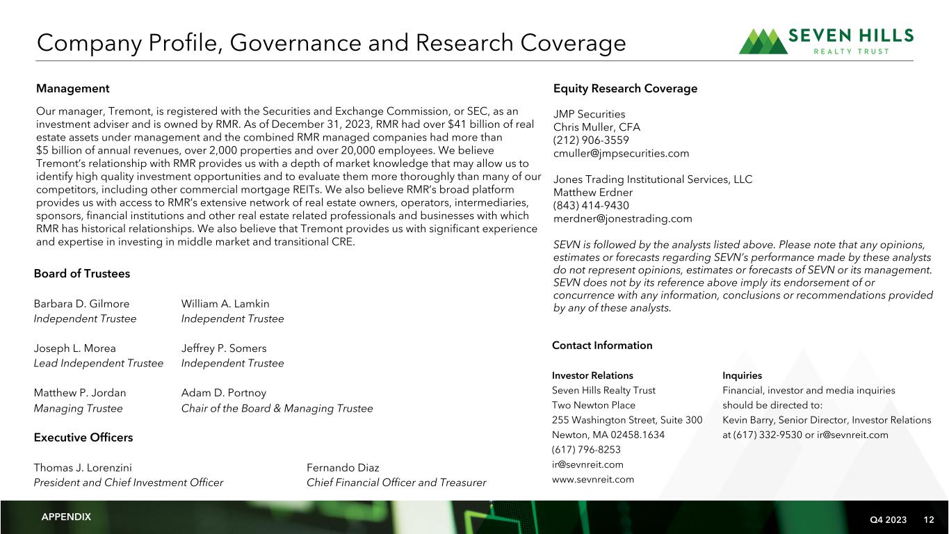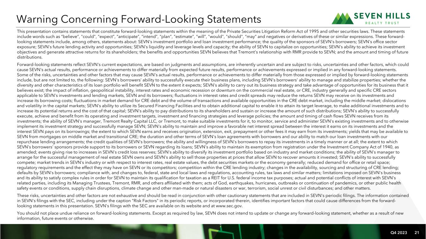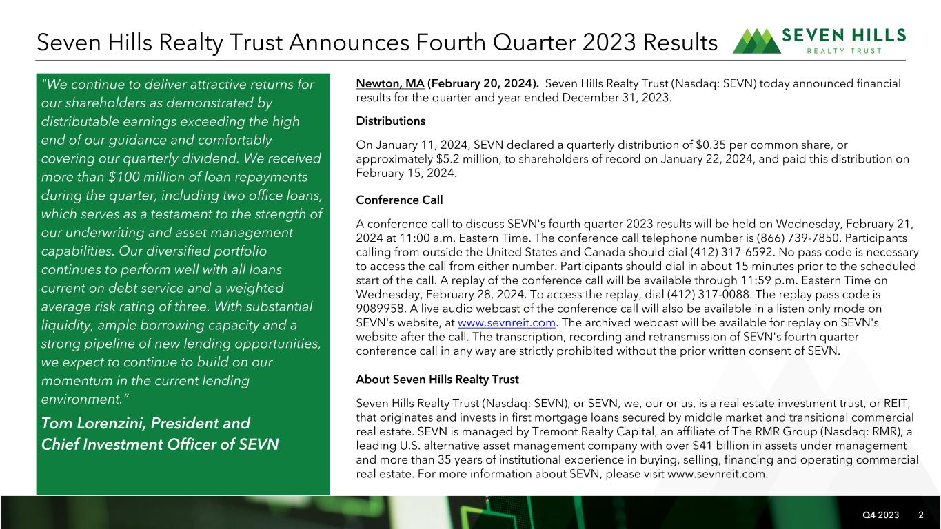 Q4 2023 2 Seven Hills Realty Trust Announces Fourth Quarter 2023 Results "We continue to deliver attractive returns for our shareholders as demonstrated by distributable earnings exceeding the high end of our guidance and comfortably covering our quarterly dividend. We received more than $100 million of loan repayments during the quarter, including two office loans, which serves as a testament to the strength of our underwriting and asset management capabilities. Our diversified portfolio continues to perform well with all loans current on debt service and a weighted average risk rating of three. With substantial liquidity, ample borrowing capacity and a strong pipeline of new lending opportunities, we expect to continue to build on our momentum in the current lending environment.” Tom Lorenzini, President and Chief Investment Officer of SEVN Conference Call A conference call to discuss SEVN's fourth quarter 2023 results will be held on Wednesday, February 21, 2024 at 11:00 a.m. Eastern Time. The conference call telephone number is (866) 739-7850. Participants calling from outside the United States and Canada should dial (412) 317-6592. No pass code is necessary to access the call from either number. Participants should dial in about 15 minutes prior to the scheduled start of the call. A replay of the conference call will be available through 11:59 p.m. Eastern Time on Wednesday, February 28, 2024. To access the replay, dial (412) 317-0088. The replay pass code is 9089958. A live audio webcast of the conference call will also be available in a listen only mode on SEVN's website, at www.sevnreit.com. The archived webcast will be available for replay on SEVN's website after the call. The transcription, recording and retransmission of SEVN's fourth quarter conference call in any way are strictly prohibited without the prior written consent of SEVN. Distributions On January 11, 2024, SEVN declared a quarterly distribution of $0.35 per common share, or approximately $5.2 million, to shareholders of record on January 22, 2024, and paid this distribution on February 15, 2024. About Seven Hills Realty Trust Seven Hills Realty Trust (Nasdaq: SEVN), or SEVN, we, our or us, is a real estate investment trust, or REIT, that originates and invests in first mortgage loans secured by middle market and transitional commercial real estate. SEVN is managed by Tremont Realty Capital, an affiliate of The RMR Group (Nasdaq: RMR), a leading U.S. alternative asset management company with over $41 billion in assets under management and more than 35 years of institutional experience in buying, selling, financing and operating commercial real estate. For more information about SEVN, please visit www.sevnreit.com. Newton, MA (February 20, 2024). Seven Hills Realty Trust (Nasdaq: SEVN) today announced financial results for the quarter and year ended December 31, 2023.