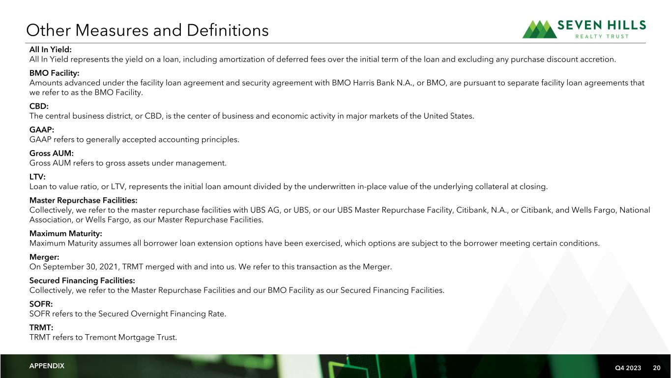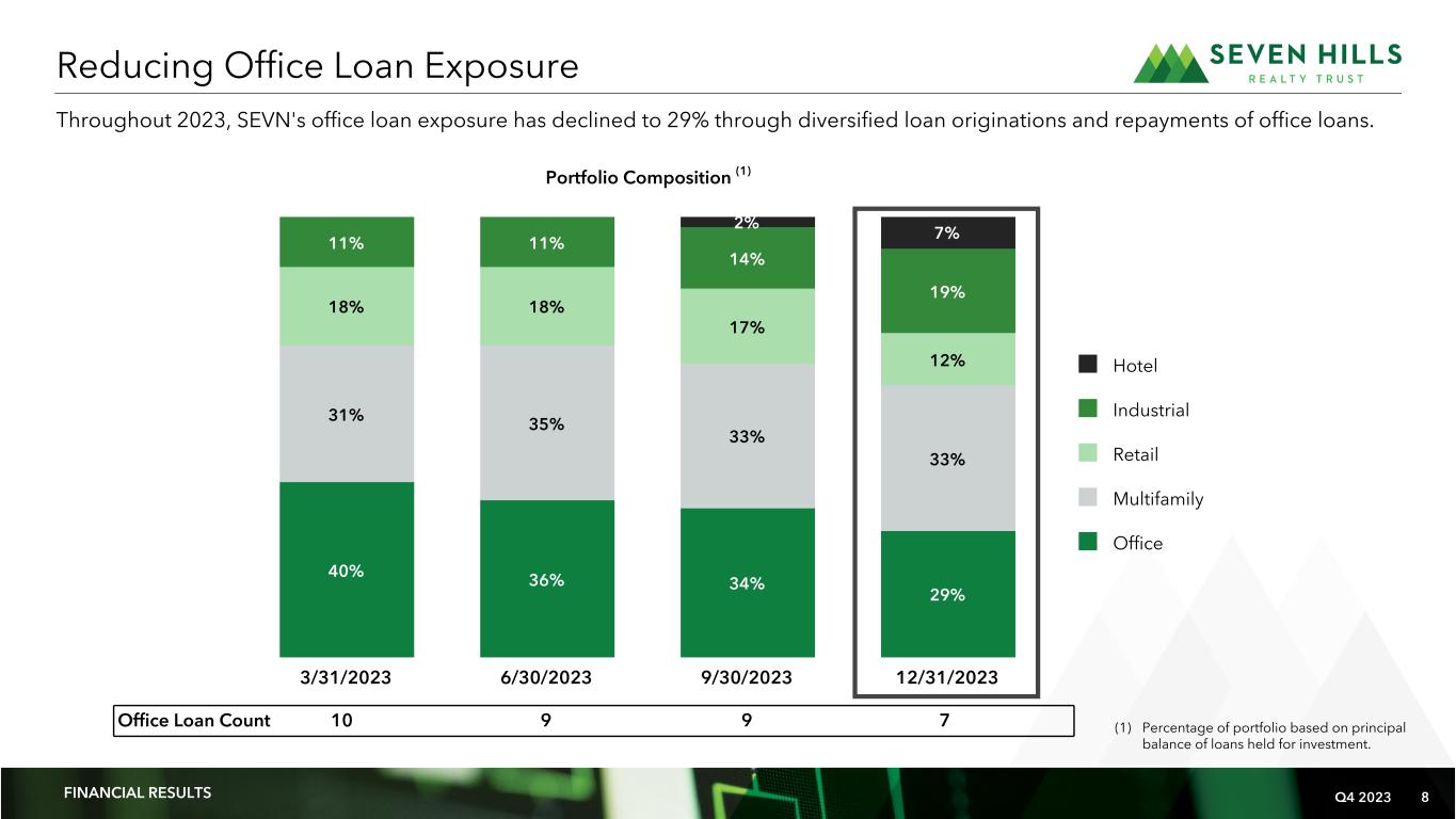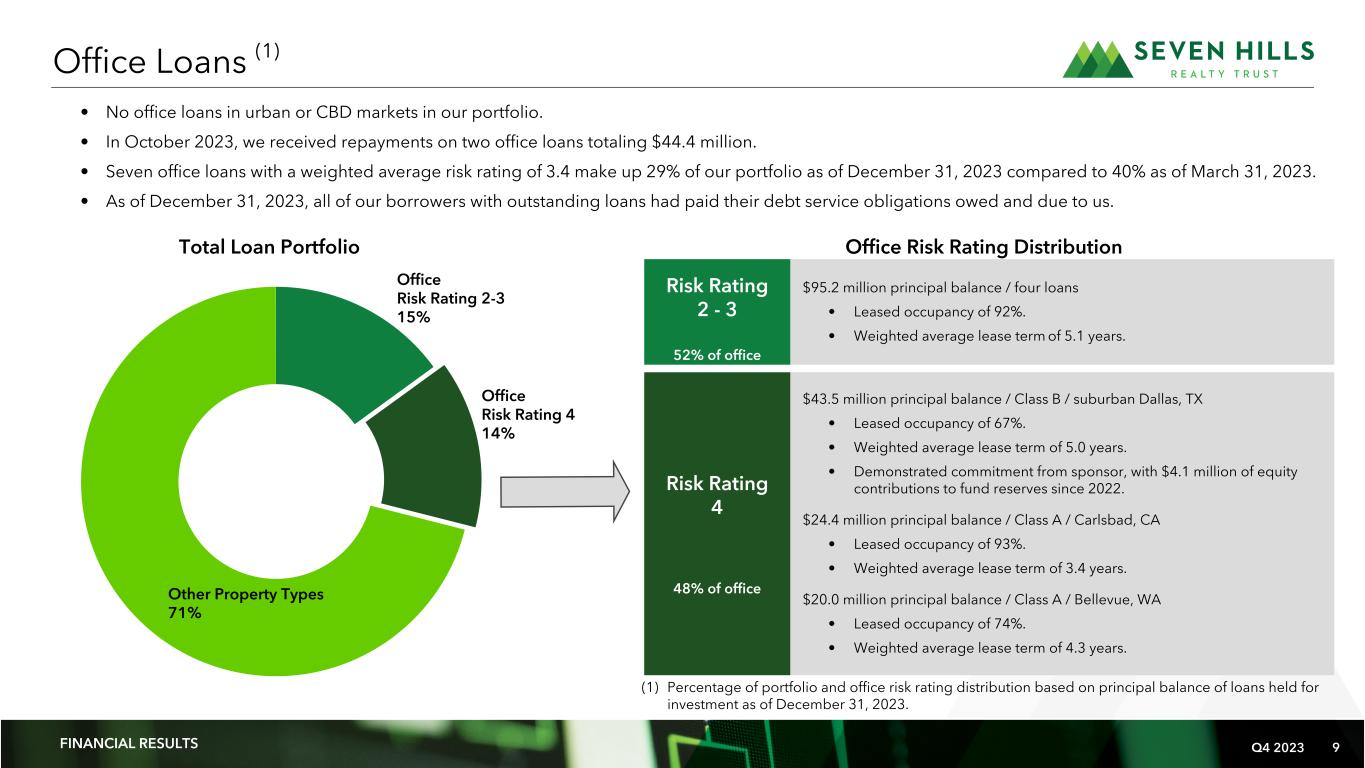 Q4 2023 2 Seven Hills Realty Trust Announces Fourth Quarter 2023 Results "We continue to deliver attractive returns for our shareholders as demonstrated by distributable earnings exceeding the high end of our guidance and comfortably covering our quarterly dividend. We received more than $100 million of loan repayments during the quarter, including two office loans, which serves as a testament to the strength of our underwriting and asset management capabilities. Our diversified portfolio continues to perform well with all loans current on debt service and a weighted average risk rating of three. With substantial liquidity, ample borrowing capacity and a strong pipeline of new lending opportunities, we expect to continue to build on our momentum in the current lending environment.” Tom Lorenzini, President and Chief Investment Officer of SEVN Conference Call A conference call to discuss SEVN's fourth quarter 2023 results will be held on Wednesday, February 21, 2024 at 11:00 a.m. Eastern Time. The conference call telephone number is (866) 739-7850. Participants calling from outside the United States and Canada should dial (412) 317-6592. No pass code is necessary to access the call from either number. Participants should dial in about 15 minutes prior to the scheduled start of the call. A replay of the conference call will be available through 11:59 p.m. Eastern Time on Wednesday, February 28, 2024. To access the replay, dial (412) 317-0088. The replay pass code is 9089958. A live audio webcast of the conference call will also be available in a listen only mode on SEVN's website, at www.sevnreit.com. The archived webcast will be available for replay on SEVN's website after the call. The transcription, recording and retransmission of SEVN's fourth quarter conference call in any way are strictly prohibited without the prior written consent of SEVN. Distributions On January 11, 2024, SEVN declared a quarterly distribution of $0.35 per common share, or approximately $5.2 million, to shareholders of record on January 22, 2024, and paid this distribution on February 15, 2024. About Seven Hills Realty Trust Seven Hills Realty Trust (Nasdaq: SEVN), or SEVN, we, our or us, is a real estate investment trust, or REIT, that originates and invests in first mortgage loans secured by middle market and transitional commercial real estate. SEVN is managed by Tremont Realty Capital, an affiliate of The RMR Group (Nasdaq: RMR), a leading U.S. alternative asset management company with over $41 billion in assets under management and more than 35 years of institutional experience in buying, selling, financing and operating commercial real estate. For more information about SEVN, please visit www.sevnreit.com. Newton, MA (February 20, 2024). Seven Hills Realty Trust (Nasdaq: SEVN) today announced financial results for the quarter and year ended December 31, 2023.