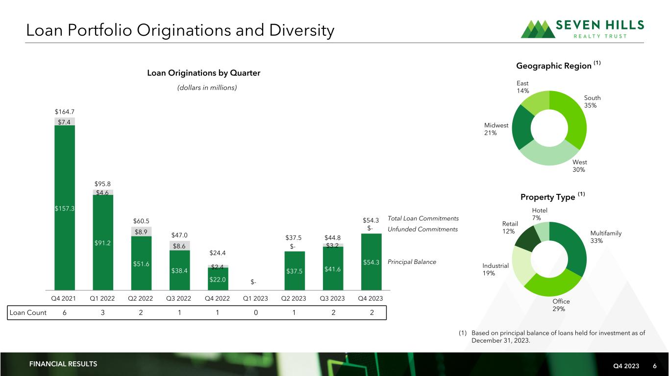 Q4 2023 5 $675.2 $675.2 $729.5 $730.2 $629.9 $54.3 $0.7 $100.3 $45.2 $40.4 Q3 2023 Loan Portfolio Originations Fundings Repayments Q4 2023 Loan Portfolio Fourth Quarter 2023 Loan Portfolio Activity (dollars in millions) Total Loan Commitments (dollars in thousands) Fourth Quarter Originations As of December 31, 2023 Number of loans 2 24 Average loan commitment $27,125 $27,929 Total loan commitments $54,250 $670,293 Unfunded loan commitments $0 $40,401 Principal balance $54,250 $629,892 Weighted average coupon rate 9.05% 9.19% Weighted average All In Yield 9.45% 9.64% Weighted average Maximum Maturity 4.9 3.0 Weighted average LTV 55% 68% Weighted average floor 4.00% 1.36% Weighted average risk rating 3.0 3.0 Principal Balance Loan Portfolio Summary FINANCIAL RESULTS $720.4 Unfunded Commitments $670.3