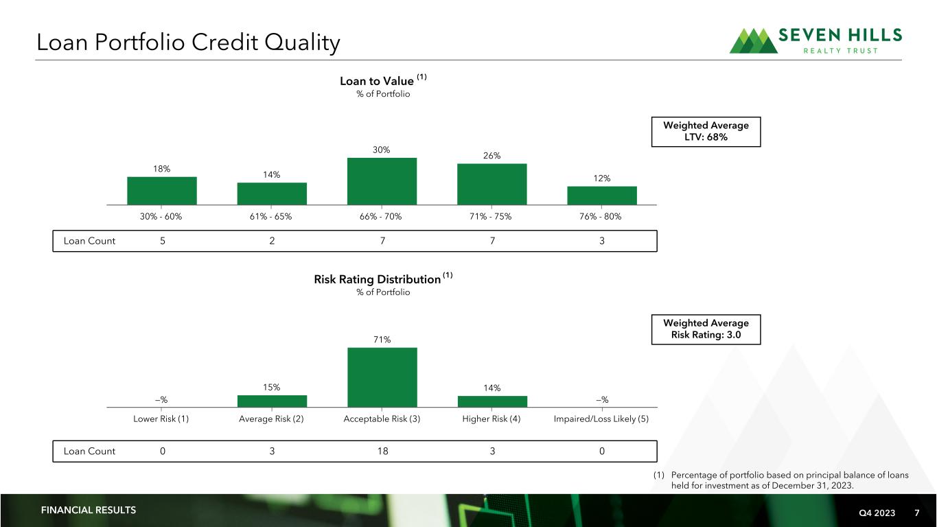 Q4 2023 6 Retail South 35% West 30% Midwest 21% East 14% Multifamily 33% Office 29% Industrial 19% Retail 12% Hotel 7% Geographic Region (1) Property Type (1) (dollars in millions) Loan Portfolio Originations and Diversity (1) Based on principal balance of loans held for investment as of December 31, 2023. $157.3 $91.2 $51.6 $38.4 $22.0 $37.5 $41.6 $54.3 $7.4 $4.6 $8.9 $8.6 $2.4 $3.2 $164.7 $95.8 $60.5 $47.0 $24.4 $44.8 Q4 2021 Q1 2022 Q2 2022 Q3 2022 Q4 2022 Q1 2023 Q2 2023 Q3 2023 Q4 2023 Total Loan Commitments Principal Balance Loan Originations by Quarter FINANCIAL RESULTS Unfunded Commitments Loan Count 6 3 2 1 1 0 1 2 2 $- $- $- $37.5 $54.3