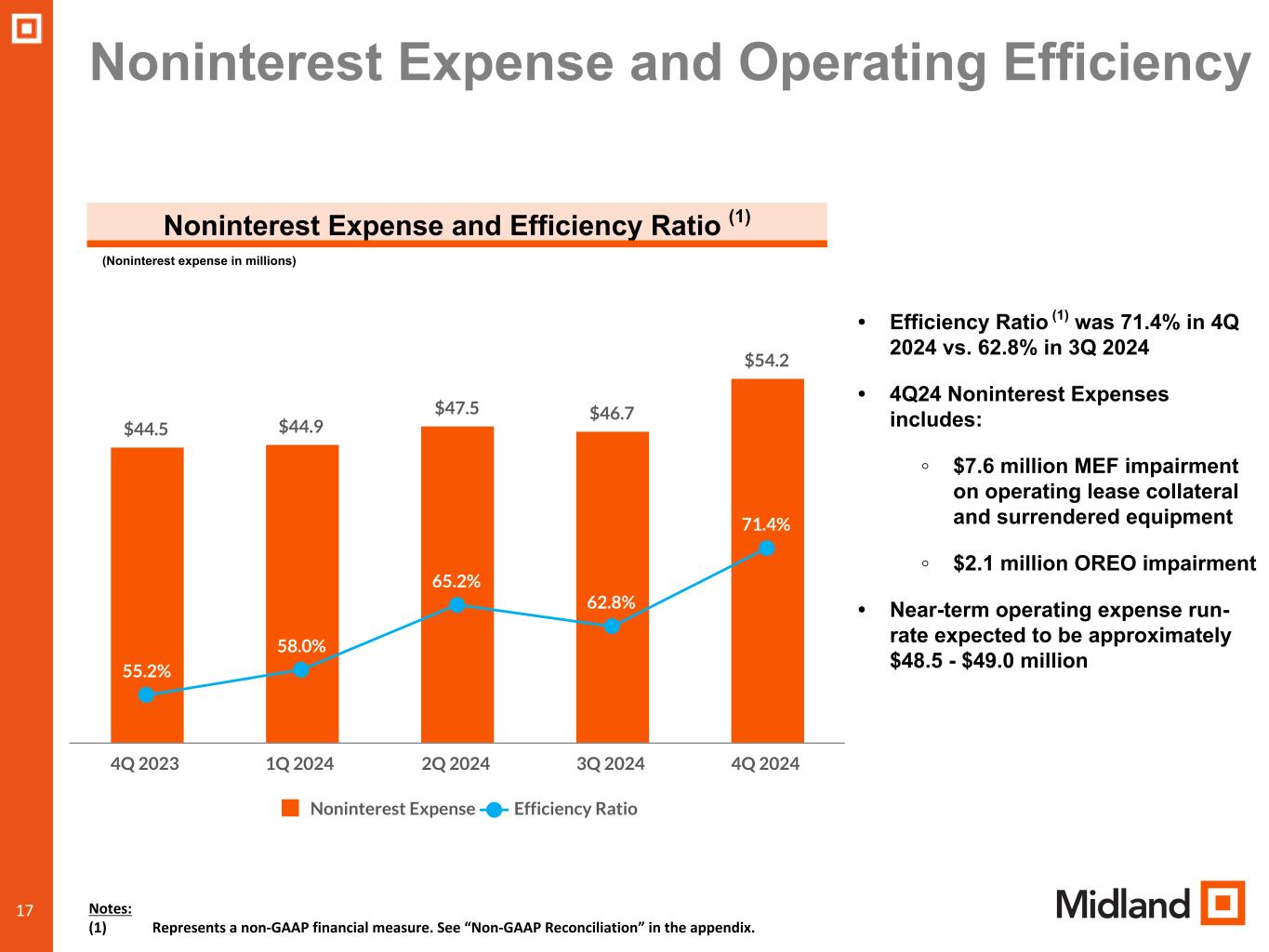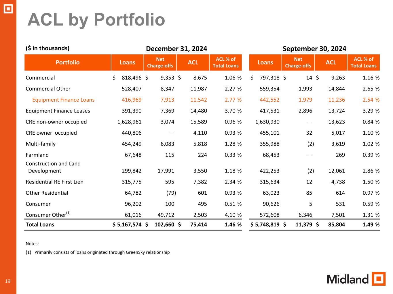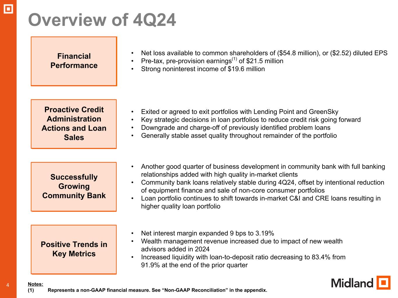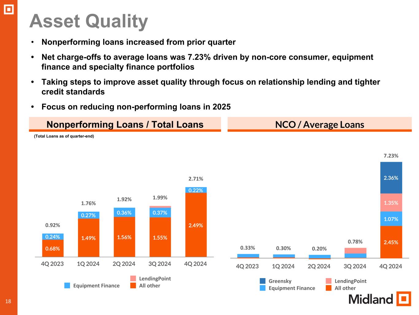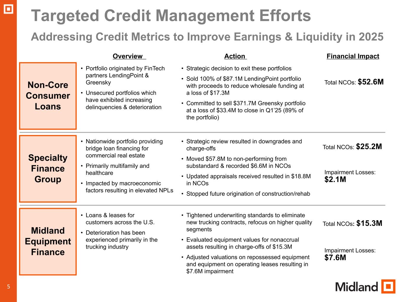 During the fourth quarter of 2024, the Company took several actions to address its credit quality issues and exit its non-core consumer loan portfolios. Our deteriorating credit quality issues were primarily within three sectors of our business: non-core consumer loans, Specialty Finance Group, and Midland Equipment Financing.