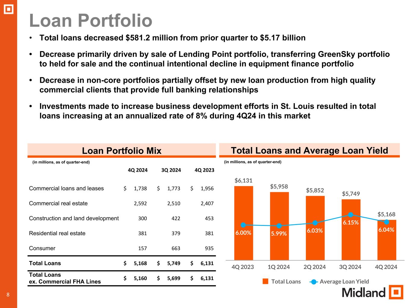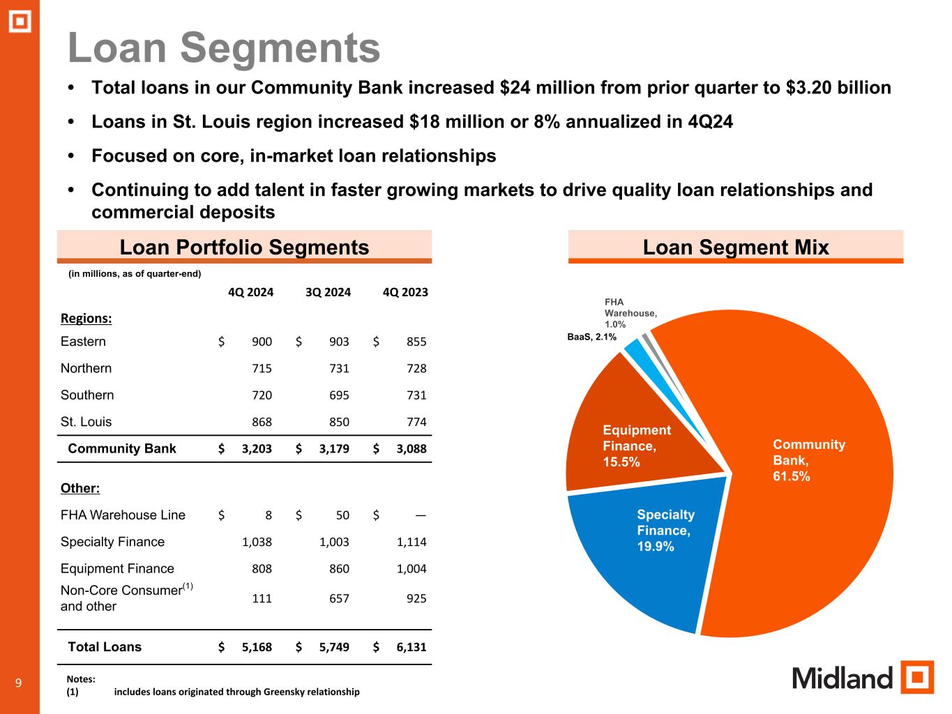 During the fourth quarter of 2024, outstanding loans declined by $581.2 million, or 10.1%, from September 30, 2024, primarily as a result of the Company’s decision to sell the Greensky and LendingPoint consumer loan portfolios, and the continuation of the Company’s plan to decrease its equipment financing portfolio to focus on commercial loan opportunities in our community banking regions.