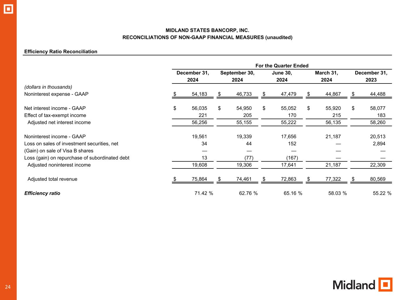 •Total risk-based capital ratio of 13.38%, compared to 13.98% at September 30, 2024 and 13.20% at December 31, 2023