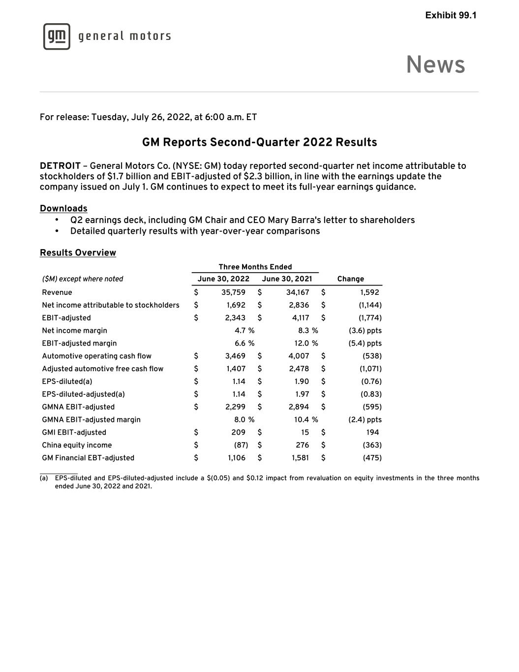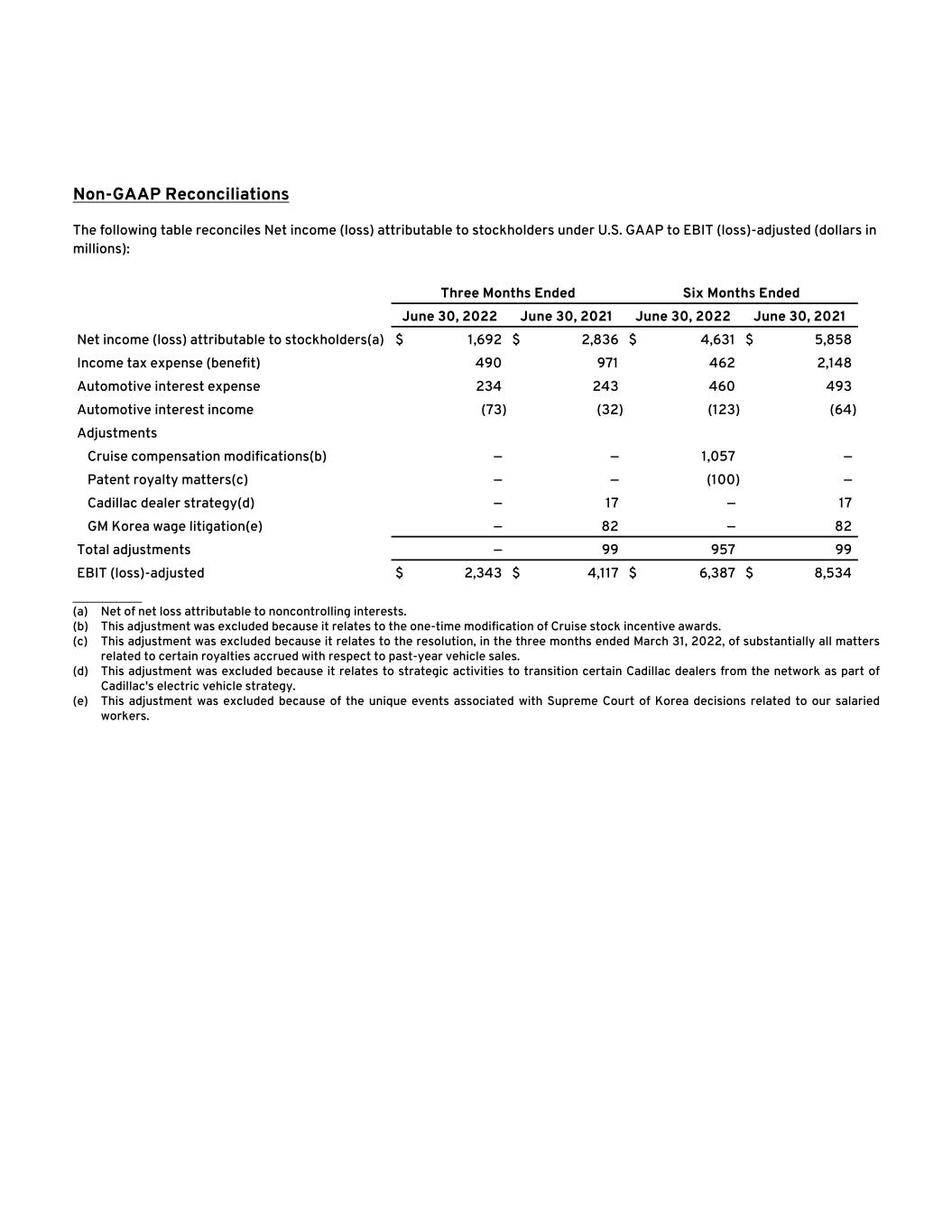 General Motors Company's (GM) non-GAAP measures include: earnings before interest and taxes (EBIT)-adjusted, presented net of noncontrolling interests; earnings before income taxes (EBT)-adjusted for our General Motors Financial Company, Inc. (GM Financial) segment; earnings per share (EPS)-diluted-adjusted; effective tax rate-adjusted (ETR-adjusted); return on invested capital-adjusted (ROIC-adjusted) and adjusted automotive free cash flow. GM's calculation of these non-GAAP measures may not be comparable to similarly titled measures of other companies due to potential differences between companies in the method of calculation. As a result, the use of these non-GAAP measures has limitations and should not be considered superior to, in isolation from, or as a substitute for, related U.S. GAAP measures.