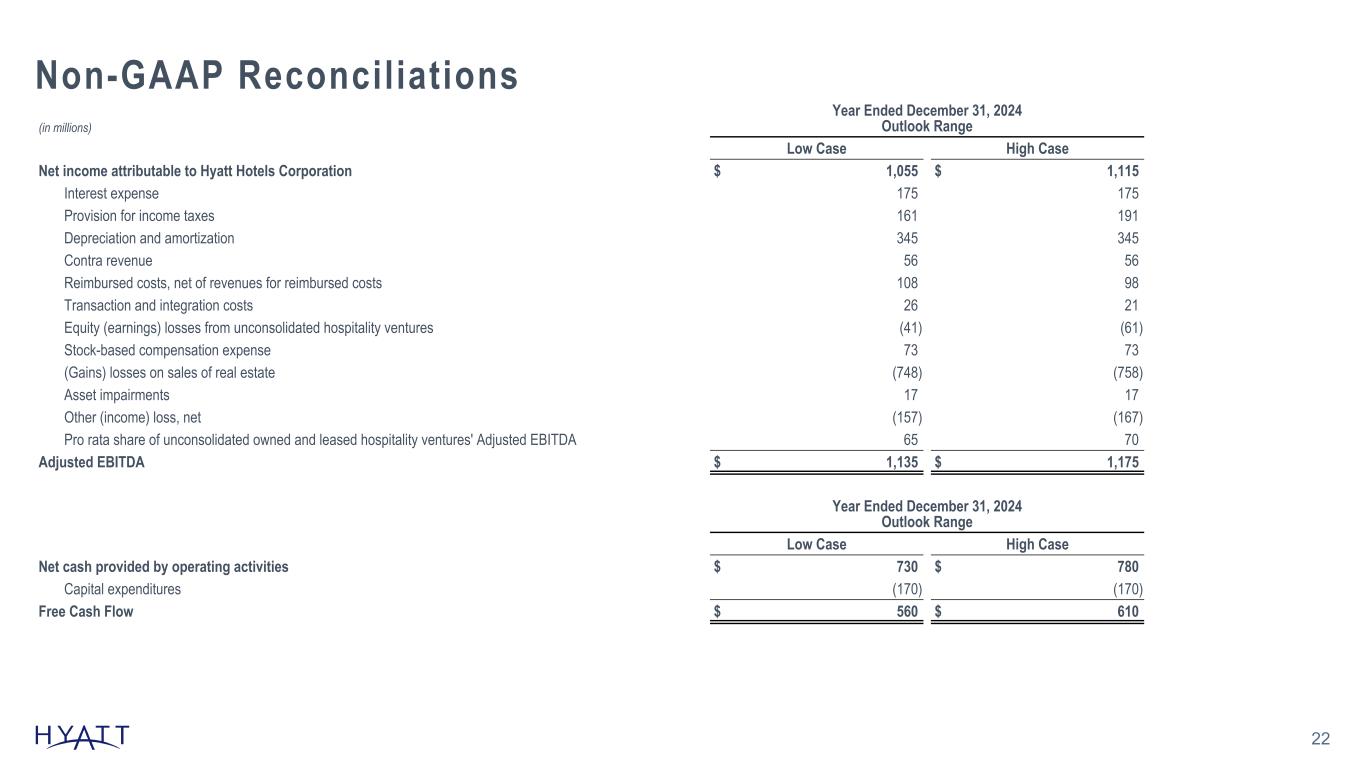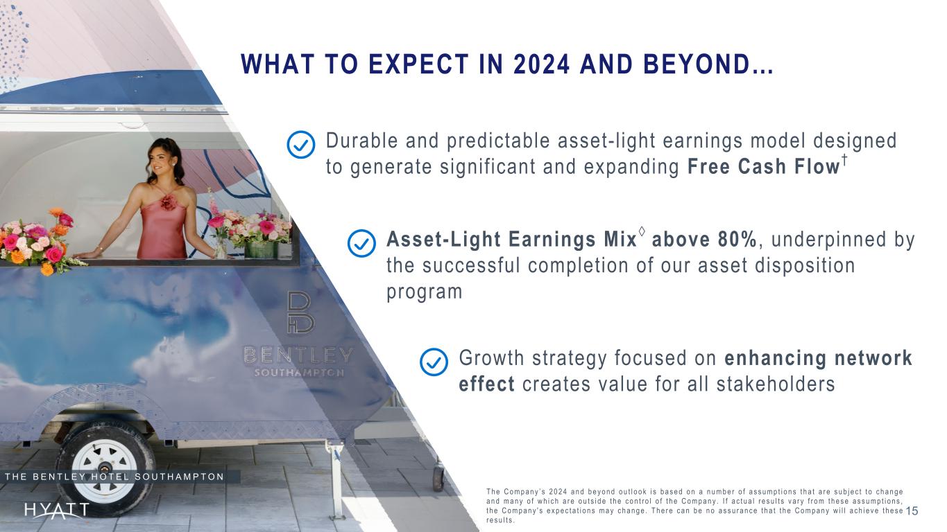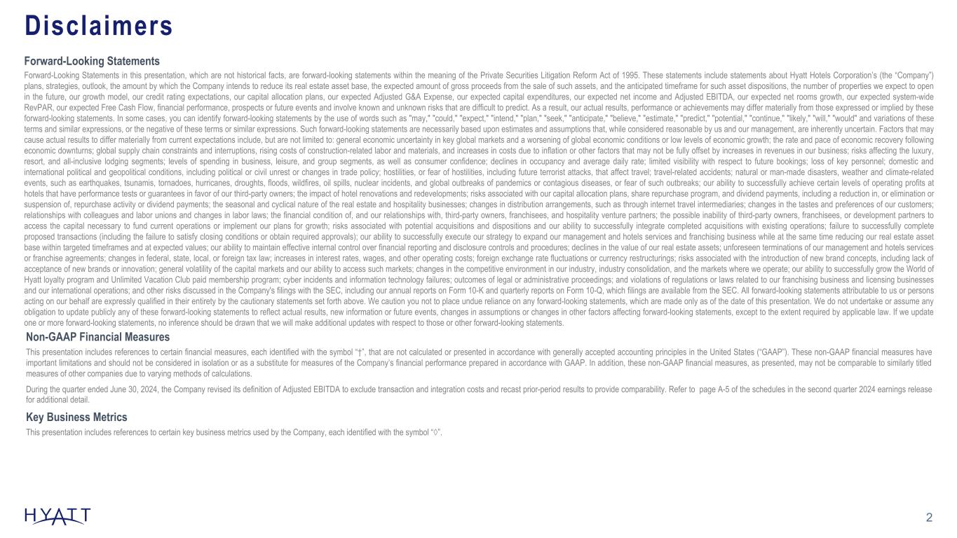 No disposition or acquisition activity beyond what has been completed as of the date of this release has been included in the 2024 Outlook. The Company's 2024 Outlook is based on a number of assumptions that are subject to change and many of which are outside the control of the Company. If actual results vary from these assumptions, the Company's expectations may change. There can be no assurance that Hyatt will achieve these results.