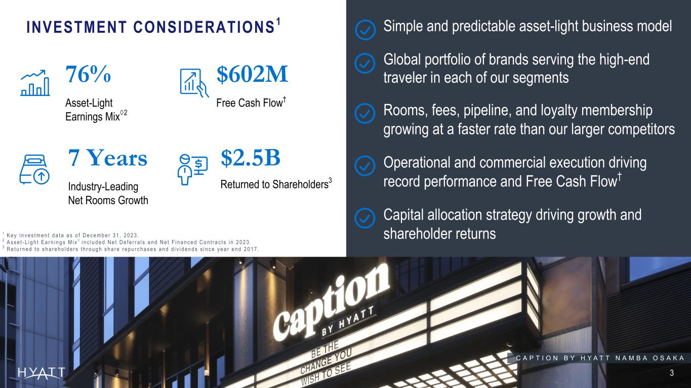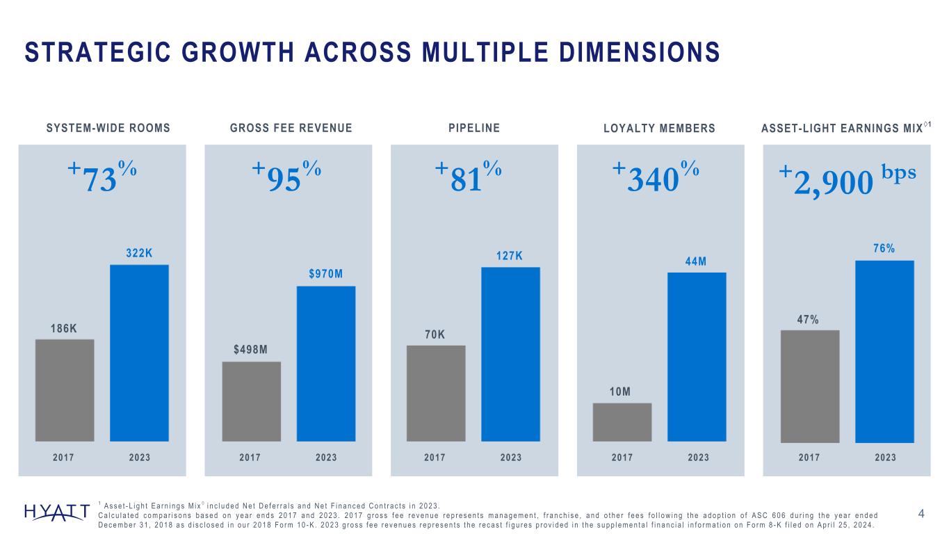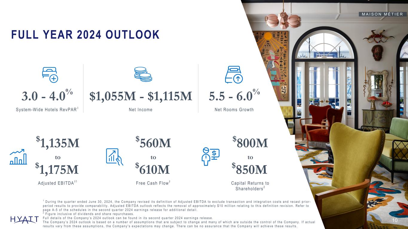No disposition or acquisition activity beyond what has been completed as of the date of this release has been included in the 2024 Outlook. The Company's 2024 Outlook is based on a number of assumptions that are subject to change and many of which are outside the control of the Company. If actual results vary from these assumptions, the Company's expectations may change. There can be no assurance that Hyatt will achieve these results.