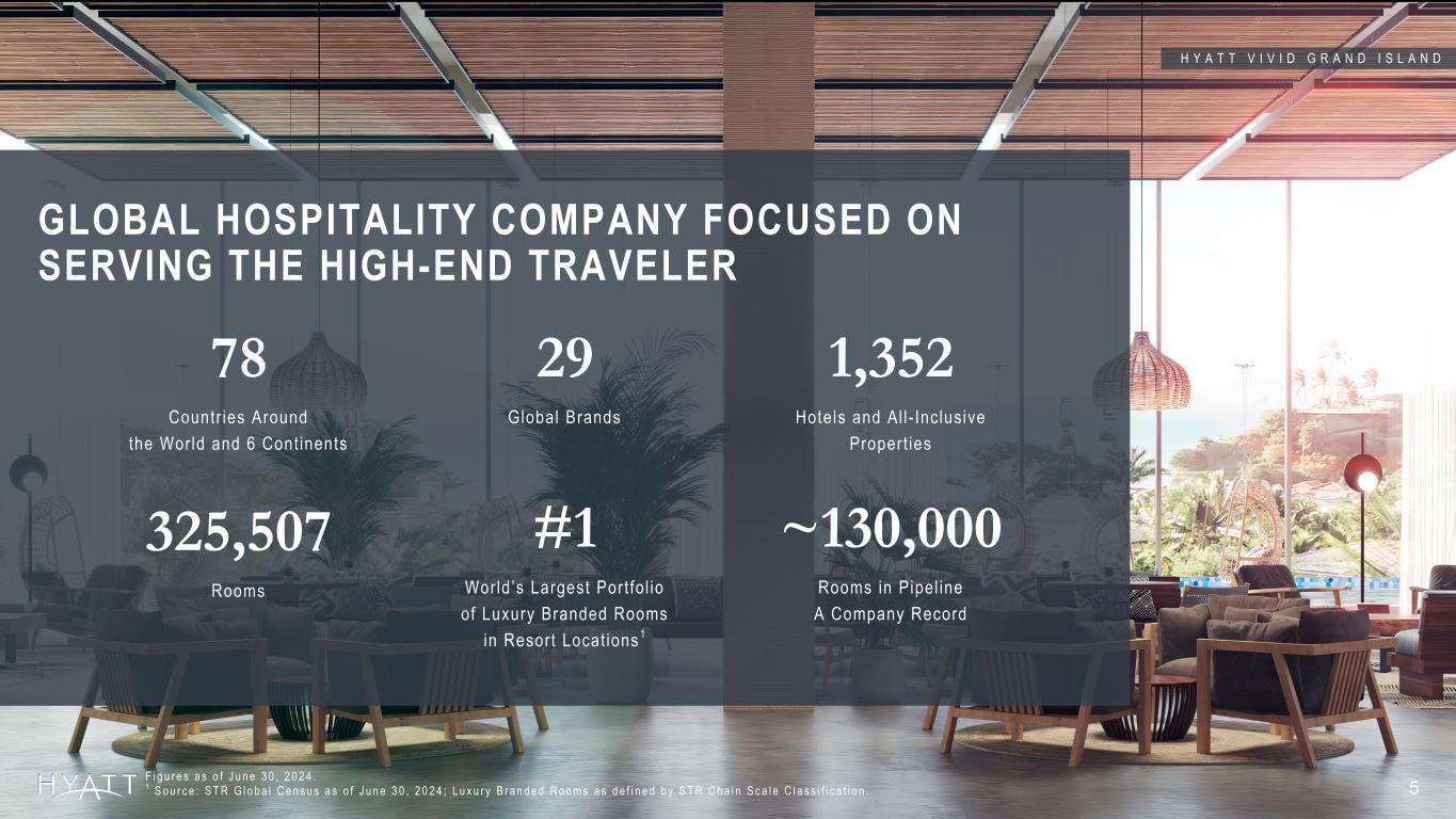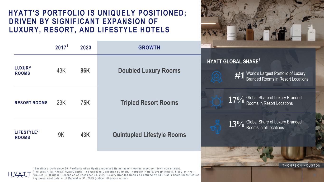 •Acquired the me and all hotels brand from Lindner Hotels AG on June 28, 2024. There are six me and all hotels with over 1,000 rooms currently open in Germany which joined Hyatt through the strategic collaboration with Lindner Hotels AG in 2022. The me and all hotels brand has a healthy pipeline with an additional 1,000 rooms in the executed pipeline and more development deals in various stages of negotiation.