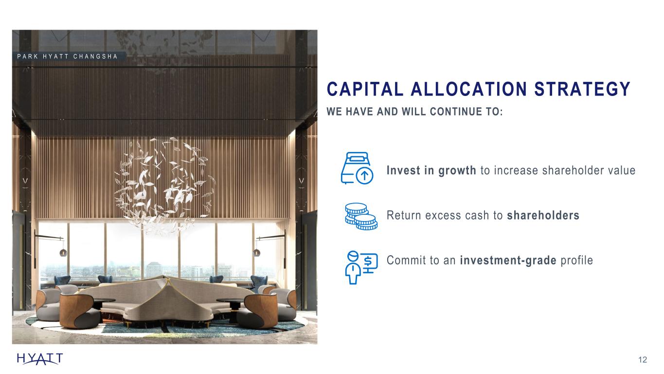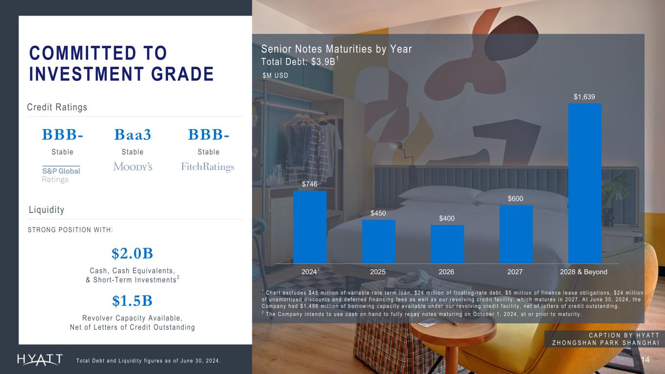 •Total liquidity of approximately $3.5 billion with $1,957 million of cash and cash equivalents and short-term investments, and borrowing availability of $1,496 million under Hyatt's revolving credit facility, net of letters of credit outstanding.