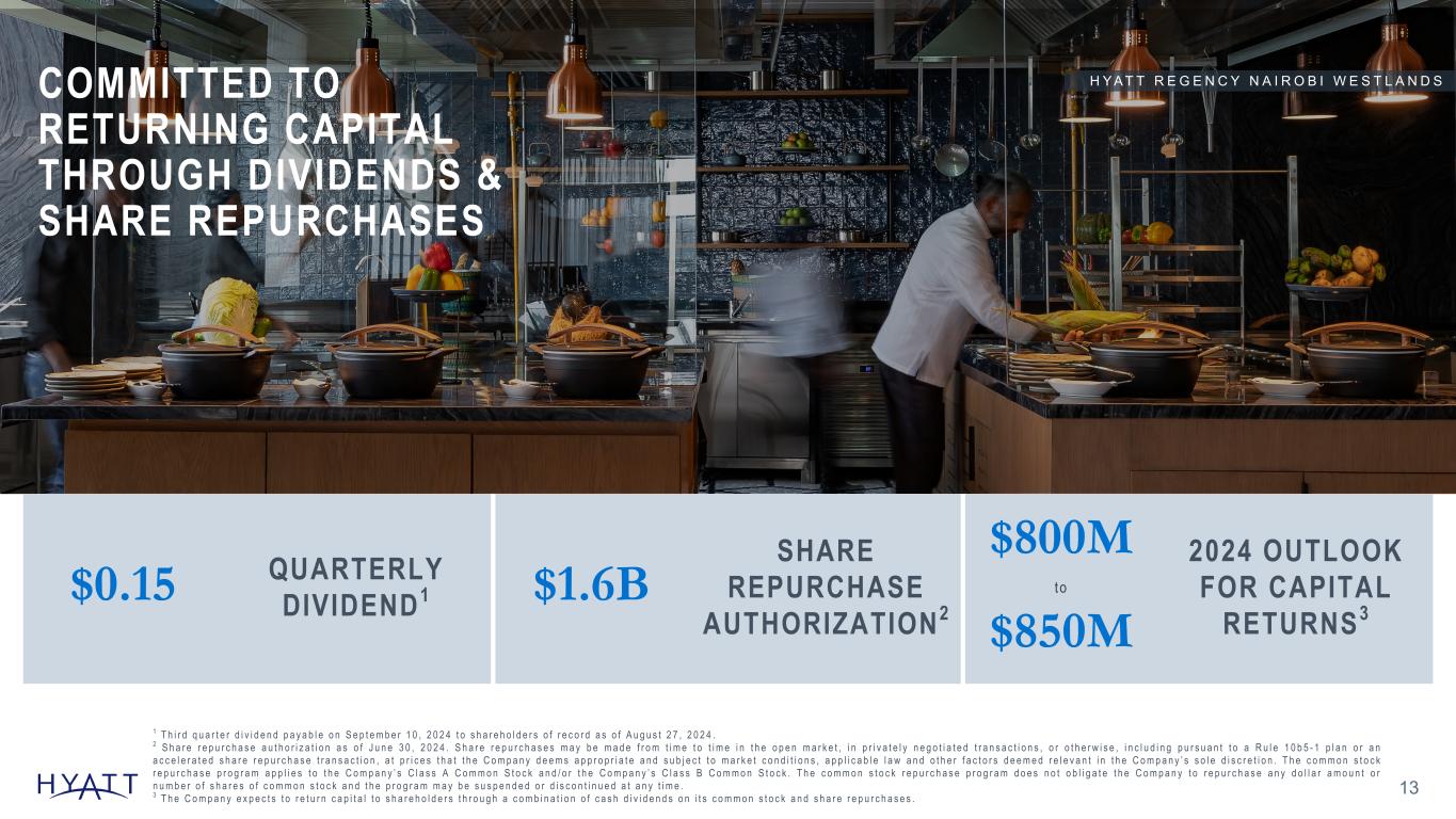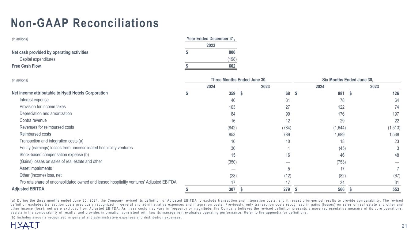 (b) Contribution from sold owned and leased hotels represents the Adjusted EBITDA contribution in each period for hotels that have been sold as of June 30, 2024 and entered into long-term management or franchise agreements, and excludes fee income retained upon sale. Hotels that have been sold include Hyatt Regency Aruba Resort Spa and Casino (1Q24), Park Hyatt Zurich (2Q24), Hyatt Regency San Antonio Riverwalk (2Q24), and Hyatt Regency Green Bay (2Q24).