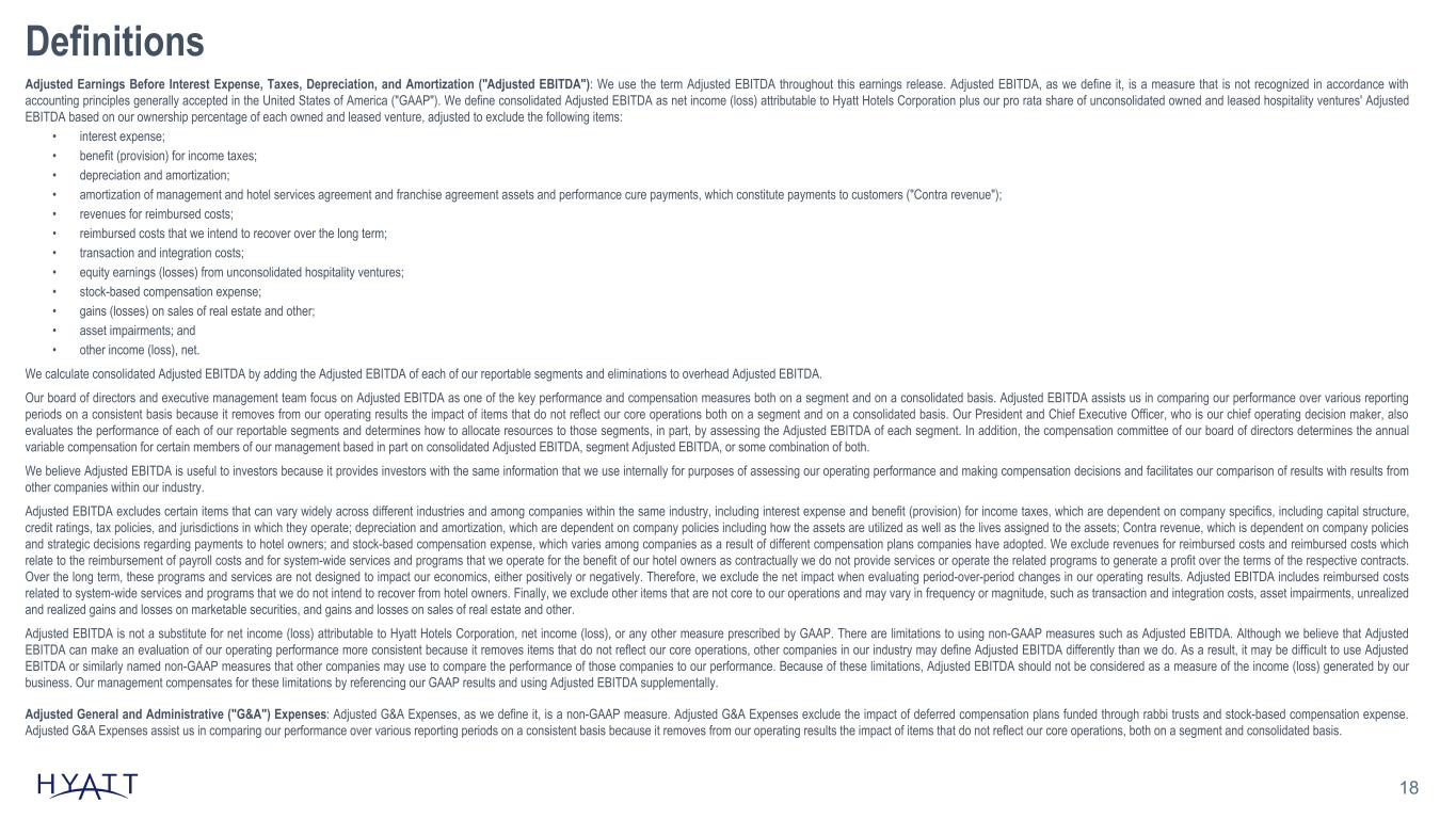 We use the term Adjusted EBITDA throughout this earnings release. Adjusted EBITDA, as we define it, is a measure that is not recognized in accordance with accounting principles generally accepted in the United States of America ("GAAP"). We define consolidated Adjusted EBITDA as net income (loss) attributable to Hyatt Hotels Corporation plus our pro rata share of unconsolidated owned and leased hospitality ventures' Adjusted EBITDA based on our ownership percentage of each owned and leased venture, adjusted to exclude the following items: