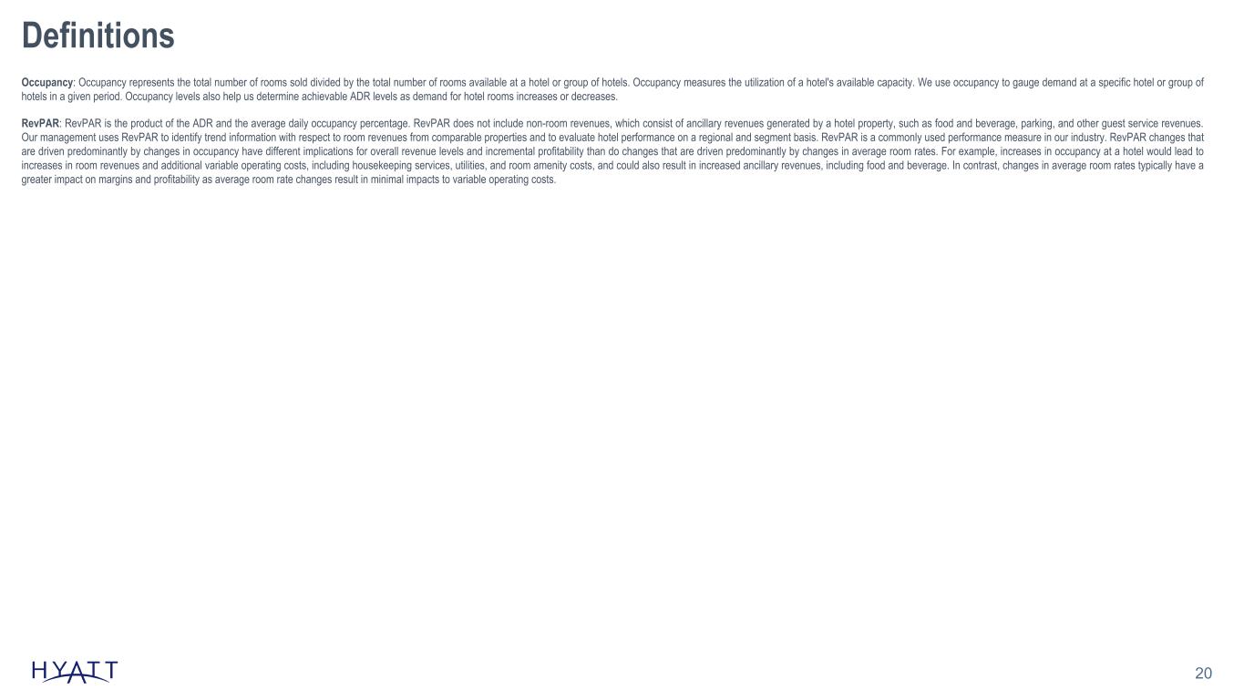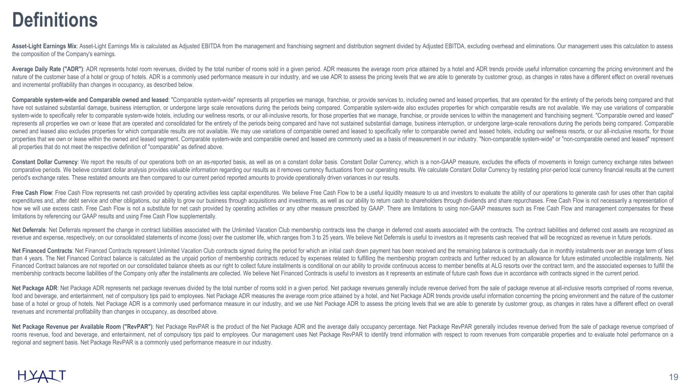 "Comparable system-wide" represents all properties we manage, franchise, or provide services to, including owned and leased properties, that are operated for the entirety of the periods being compared and that have not sustained substantial damage, business interruption, or undergone large scale renovations during the periods being compared. Comparable system-wide also excludes properties for which comparable results are not available. We may use variations of comparable system-wide to specifically refer to comparable system-wide hotels, including our wellness resorts, or our all-inclusive resorts, for those properties that we manage, franchise, or provide services to within the management and franchising segment. "Comparable owned and leased" represents all properties we own or lease that are operated and consolidated for the entirety of the periods being compared and have not sustained substantial damage, business interruption, or undergone large-scale renovations during the periods being compared. Comparable owned and leased also excludes properties for which comparable results are not available. We may use variations of comparable owned and leased to specifically refer to comparable owned and leased hotels, including our wellness resorts, or our all-inclusive resorts, for those properties that we own or lease within the owned and leased segment. Comparable system-wide and comparable owned and leased are commonly used as a basis of measurement in our industry. "Non-comparable system-wide" or "non-comparable owned and leased" represent all properties that do not meet the respective definition of "comparable" as defined above.