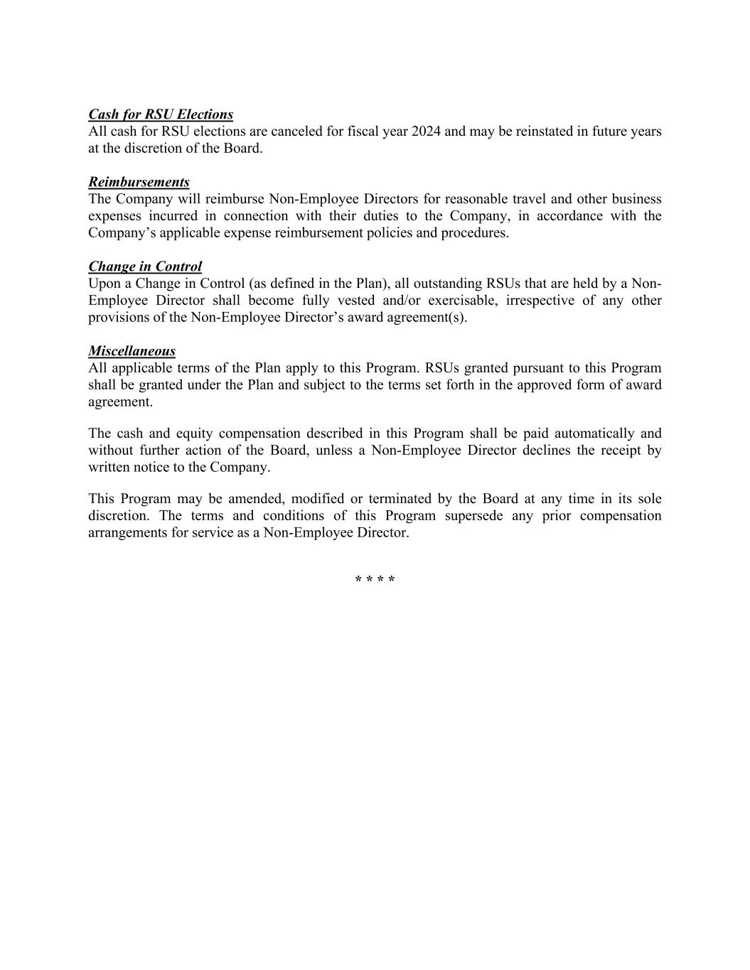 Cash for RSU Elections All cash for RSU elections are canceled for fiscal year 2024 and may be reinstated in future years at the discretion of the Board. Reimbursements The Company will reimburse Non-Employee Directors for reasonable travel and other business expenses incurred in connection with their duties to the Company, in accordance with the Company’s applicable expense reimbursement policies and procedures. Change in Control Upon a Change in Control (as defined in the Plan), all outstanding RSUs that are held by a Non- Employee Director shall become fully vested and/or exercisable, irrespective of any other provisions of the Non-Employee Director’s award agreement(s). Miscellaneous All applicable terms of the Plan apply to this Program. RSUs granted pursuant to this Program shall be granted under the Plan and subject to the terms set forth in the approved form of award agreement. The cash and equity compensation described in this Program shall be paid automatically and without further action of the Board, unless a Non-Employee Director declines the receipt by written notice to the Company. This Program may be amended, modified or terminated by the Board at any time in its sole discretion. The terms and conditions of this Program supersede any prior compensation arrangements for service as a Non-Employee Director. * * * *