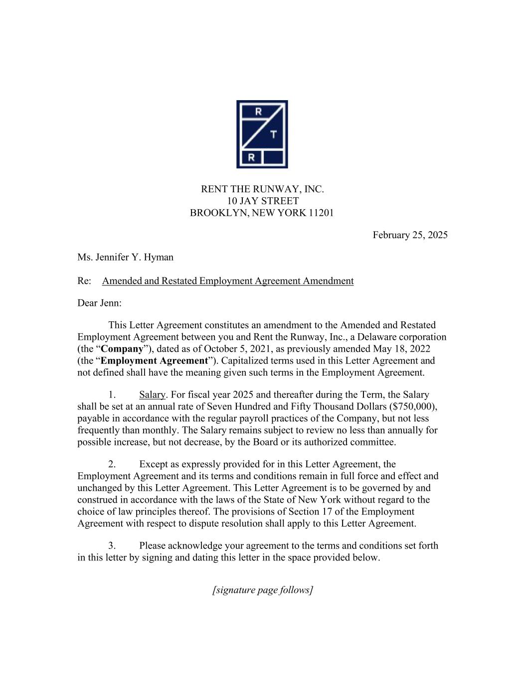 Ms. Jennifer Y. Hyman RENT THE RUNWAY, INC. 10 JAY STREET BROOKLYN, NEW YORK 11201 February 25, 2025 Re: Amended and Restated Employment Agreement Amendment Dear Jenn: This Letter Agreement constitutes an amendment to the Amended and Restated Employment Agreement between you and Rent the Runway, Inc., a Delaware corporation (the “Company”), dated as of October 5, 2021, as previously amended May 18, 2022 (the “Employment Agreement”). Capitalized terms used in this Letter Agreement and not defined shall have the meaning given such terms in the Employment Agreement. 1. Salary. For fiscal year 2025 and thereafter during the Term, the Salary shall be set at an annual rate of Seven Hundred and Fifty Thousand Dollars ($750,000), payable in accordance with the regular payroll practices of the Company, but not less frequently than monthly. The Salary remains subject to review no less than annually for possible increase, but not decrease, by the Board or its authorized committee. 2. Except as expressly provided for in this Letter Agreement, the Employment Agreement and its terms and conditions remain in full force and effect and unchanged by this Letter Agreement. This Letter Agreement is to be governed by and construed in accordance with the laws of the State of New York without regard to the choice of law principles thereof. The provisions of Section 17 of the Employment Agreement with respect to dispute resolution shall apply to this Letter Agreement. 3. Please acknowledge your agreement to the terms and conditions set forth in this letter by signing and dating this letter in the space provided below. [signature page follows]