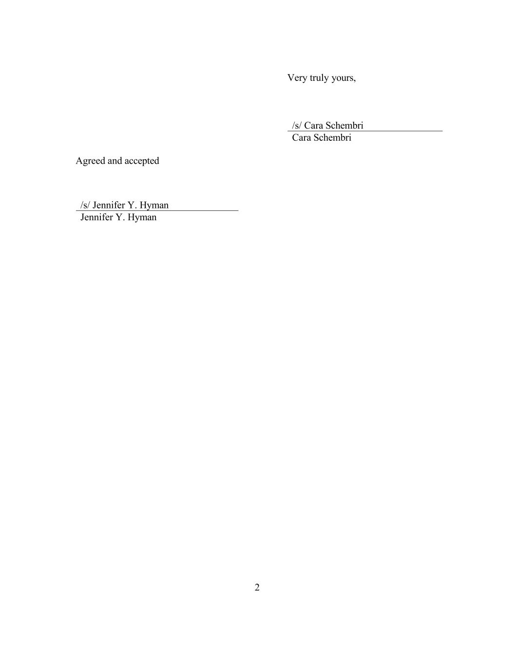 Very truly yours, /s/ Cara Schembri Cara Schembri Agreed and accepted /s/ Jennifer Y. Hyman Jennifer Y. Hyman 2