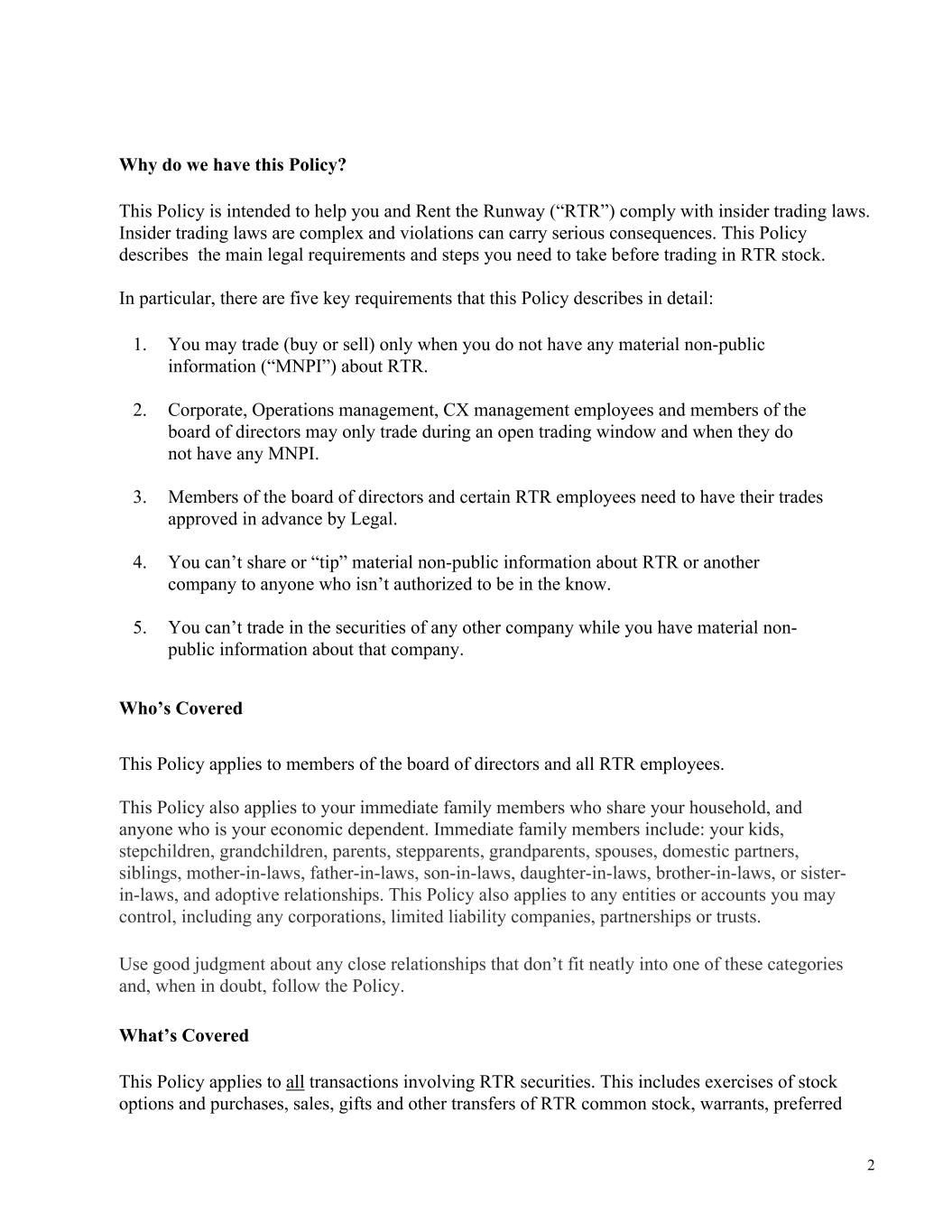 2 Why do we have this Policy? This Policy is intended to help you and Rent the Runway (“RTR”) comply with insider trading laws. Insider trading laws are complex and violations can carry serious consequences. This Policy describes the main legal requirements and steps you need to take before trading in RTR stock. In particular, there are five key requirements that this Policy describes in detail: 1. You may trade (buy or sell) only when you do not have any material non-public information (“MNPI”) about RTR. 2. Corporate, Operations management, CX management employees and members of the board of directors may only trade during an open trading window and when they do not have any MNPI. 3. Members of the board of directors and certain RTR employees need to have their trades approved in advance by Legal. 4. You can’t share or “tip” material non-public information about RTR or another company to anyone who isn’t authorized to be in the know. 5. You can’t trade in the securities of any other company while you have material non- public information about that company. Who’s Covered This Policy applies to members of the board of directors and all RTR employees. This Policy also applies to your immediate family members who share your household, and anyone who is your economic dependent. Immediate family members include: your kids, stepchildren, grandchildren, parents, stepparents, grandparents, spouses, domestic partners, siblings, mother-in-laws, father-in-laws, son-in-laws, daughter-in-laws, brother-in-laws, or sister- in-laws, and adoptive relationships. This Policy also applies to any entities or accounts you may control, including any corporations, limited liability companies, partnerships or trusts. Use good judgment about any close relationships that don’t fit neatly into one of these categories and, when in doubt, follow the Policy. What’s Covered This Policy applies to all transactions involving RTR securities. This includes exercises of stock options and purchases, sales, gifts and other transfers of RTR common stock, warrants, preferred