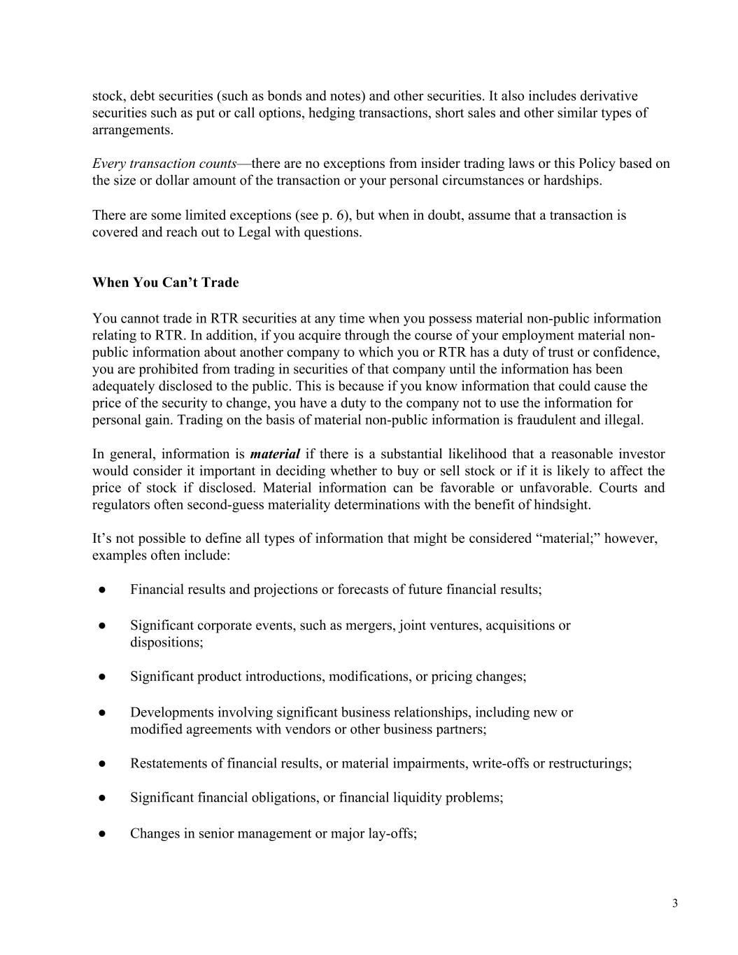 3 stock, debt securities (such as bonds and notes) and other securities. It also includes derivative securities such as put or call options, hedging transactions, short sales and other similar types of arrangements. Every transaction counts—there are no exceptions from insider trading laws or this Policy based on the size or dollar amount of the transaction or your personal circumstances or hardships. There are some limited exceptions (see p. 6), but when in doubt, assume that a transaction is covered and reach out to Legal with questions. When You Can’t Trade You cannot trade in RTR securities at any time when you possess material non-public information relating to RTR. In addition, if you acquire through the course of your employment material non- public information about another company to which you or RTR has a duty of trust or confidence, you are prohibited from trading in securities of that company until the information has been adequately disclosed to the public. This is because if you know information that could cause the price of the security to change, you have a duty to the company not to use the information for personal gain. Trading on the basis of material non-public information is fraudulent and illegal. In general, information is material if there is a substantial likelihood that a reasonable investor would consider it important in deciding whether to buy or sell stock or if it is likely to affect the price of stock if disclosed. Material information can be favorable or unfavorable. Courts and regulators often second-guess materiality determinations with the benefit of hindsight. It’s not possible to define all types of information that might be considered “material;” however, examples often include: ● Financial results and projections or forecasts of future financial results; ● Significant corporate events, such as mergers, joint ventures, acquisitions or dispositions; ● Significant product introductions, modifications, or pricing changes; ● Developments involving significant business relationships, including new or modified agreements with vendors or other business partners; ● Restatements of financial results, or material impairments, write-offs or restructurings; ● Significant financial obligations, or financial liquidity problems; ● Changes in senior management or major lay-offs;
