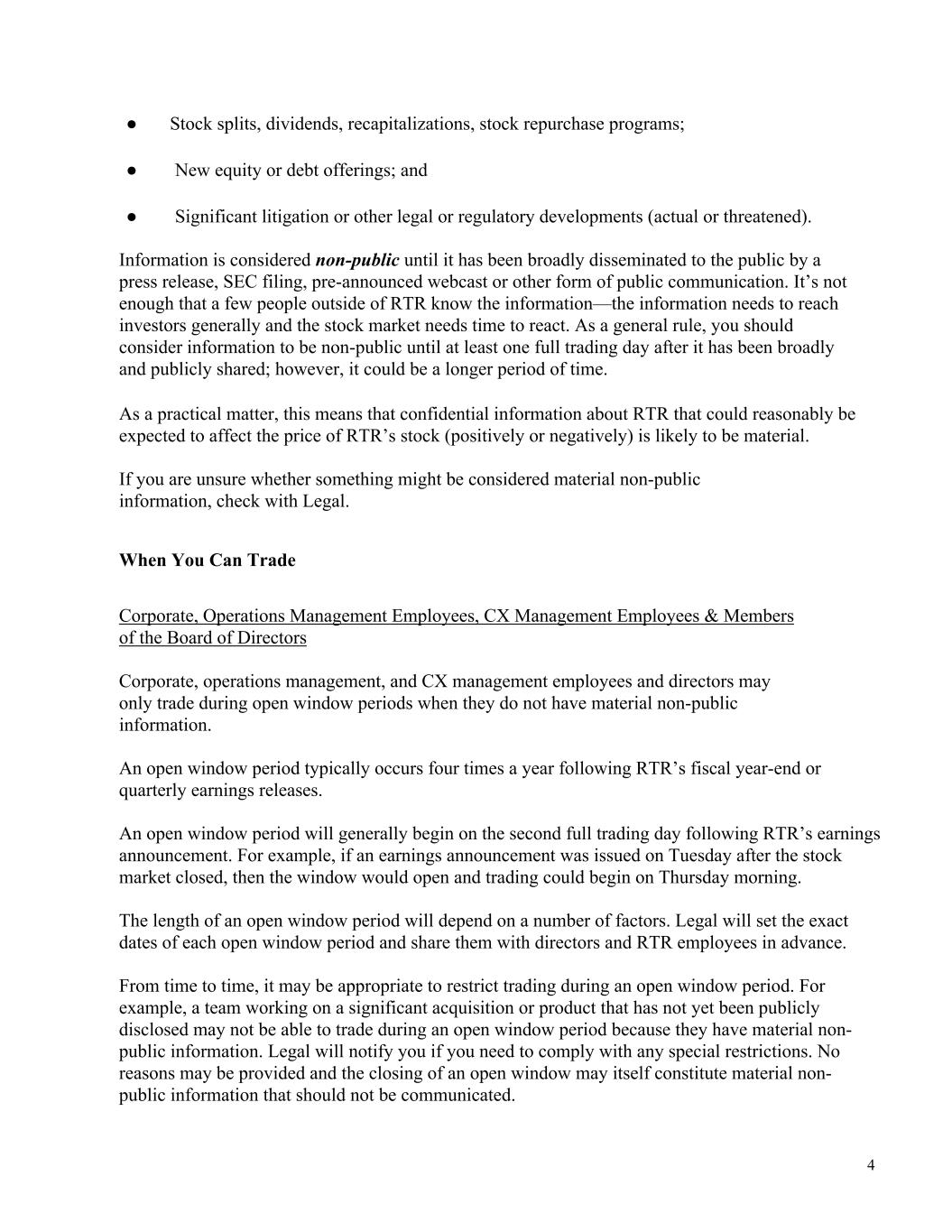 4 ● Stock splits, dividends, recapitalizations, stock repurchase programs; ● New equity or debt offerings; and ● Significant litigation or other legal or regulatory developments (actual or threatened). Information is considered non-public until it has been broadly disseminated to the public by a press release, SEC filing, pre-announced webcast or other form of public communication. It’s not enough that a few people outside of RTR know the information—the information needs to reach investors generally and the stock market needs time to react. As a general rule, you should consider information to be non-public until at least one full trading day after it has been broadly and publicly shared; however, it could be a longer period of time. As a practical matter, this means that confidential information about RTR that could reasonably be expected to affect the price of RTR’s stock (positively or negatively) is likely to be material. If you are unsure whether something might be considered material non-public information, check with Legal. When You Can Trade Corporate, Operations Management Employees, CX Management Employees & Members of the Board of Directors Corporate, operations management, and CX management employees and directors may only trade during open window periods when they do not have material non-public information. An open window period typically occurs four times a year following RTR’s fiscal year-end or quarterly earnings releases. An open window period will generally begin on the second full trading day following RTR’s earnings announcement. For example, if an earnings announcement was issued on Tuesday after the stock market closed, then the window would open and trading could begin on Thursday morning. The length of an open window period will depend on a number of factors. Legal will set the exact dates of each open window period and share them with directors and RTR employees in advance. From time to time, it may be appropriate to restrict trading during an open window period. For example, a team working on a significant acquisition or product that has not yet been publicly disclosed may not be able to trade during an open window period because they have material non- public information. Legal will notify you if you need to comply with any special restrictions. No reasons may be provided and the closing of an open window may itself constitute material non- public information that should not be communicated.