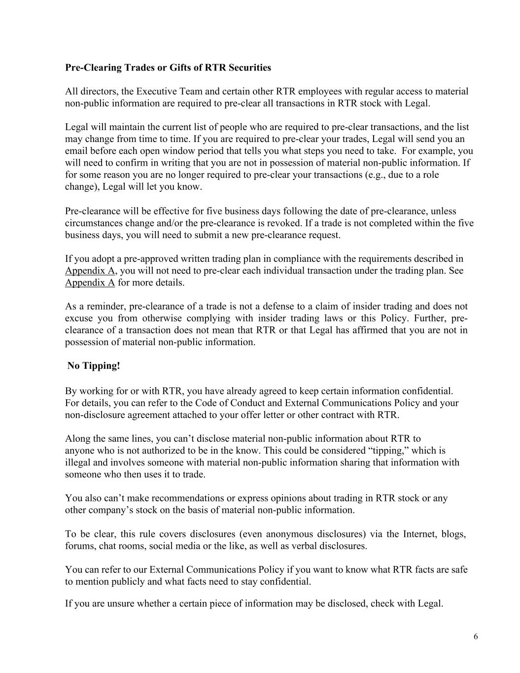 6 Pre-Clearing Trades or Gifts of RTR Securities All directors, the Executive Team and certain other RTR employees with regular access to material non-public information are required to pre-clear all transactions in RTR stock with Legal. Legal will maintain the current list of people who are required to pre-clear transactions, and the list may change from time to time. If you are required to pre-clear your trades, Legal will send you an email before each open window period that tells you what steps you need to take. For example, you will need to confirm in writing that you are not in possession of material non-public information. If for some reason you are no longer required to pre-clear your transactions (e.g., due to a role change), Legal will let you know. Pre-clearance will be effective for five business days following the date of pre-clearance, unless circumstances change and/or the pre-clearance is revoked. If a trade is not completed within the five business days, you will need to submit a new pre-clearance request. If you adopt a pre-approved written trading plan in compliance with the requirements described in Appendix A, you will not need to pre-clear each individual transaction under the trading plan. See Appendix A for more details. As a reminder, pre-clearance of a trade is not a defense to a claim of insider trading and does not excuse you from otherwise complying with insider trading laws or this Policy. Further, pre- clearance of a transaction does not mean that RTR or that Legal has affirmed that you are not in possession of material non-public information. No Tipping! By working for or with RTR, you have already agreed to keep certain information confidential. For details, you can refer to the Code of Conduct and External Communications Policy and your non-disclosure agreement attached to your offer letter or other contract with RTR. Along the same lines, you can’t disclose material non-public information about RTR to anyone who is not authorized to be in the know. This could be considered “tipping,” which is illegal and involves someone with material non-public information sharing that information with someone who then uses it to trade. You also can’t make recommendations or express opinions about trading in RTR stock or any other company’s stock on the basis of material non-public information. To be clear, this rule covers disclosures (even anonymous disclosures) via the Internet, blogs, forums, chat rooms, social media or the like, as well as verbal disclosures. You can refer to our External Communications Policy if you want to know what RTR facts are safe to mention publicly and what facts need to stay confidential. If you are unsure whether a certain piece of information may be disclosed, check with Legal.