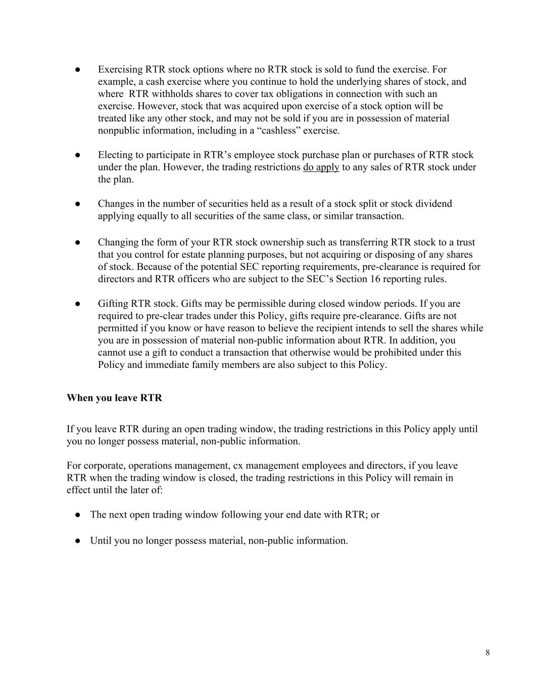 8 ● Exercising RTR stock options where no RTR stock is sold to fund the exercise. For example, a cash exercise where you continue to hold the underlying shares of stock, and where RTR withholds shares to cover tax obligations in connection with such an exercise. However, stock that was acquired upon exercise of a stock option will be treated like any other stock, and may not be sold if you are in possession of material nonpublic information, including in a “cashless” exercise. ● Electing to participate in RTR’s employee stock purchase plan or purchases of RTR stock under the plan. However, the trading restrictions do apply to any sales of RTR stock under the plan. ● Changes in the number of securities held as a result of a stock split or stock dividend applying equally to all securities of the same class, or similar transaction. ● Changing the form of your RTR stock ownership such as transferring RTR stock to a trust that you control for estate planning purposes, but not acquiring or disposing of any shares of stock. Because of the potential SEC reporting requirements, pre-clearance is required for directors and RTR officers who are subject to the SEC’s Section 16 reporting rules. ● Gifting RTR stock. Gifts may be permissible during closed window periods. If you are required to pre-clear trades under this Policy, gifts require pre-clearance. Gifts are not permitted if you know or have reason to believe the recipient intends to sell the shares while you are in possession of material non-public information about RTR. In addition, you cannot use a gift to conduct a transaction that otherwise would be prohibited under this Policy and immediate family members are also subject to this Policy. When you leave RTR If you leave RTR during an open trading window, the trading restrictions in this Policy apply until you no longer possess material, non-public information. For corporate, operations management, cx management employees and directors, if you leave RTR when the trading window is closed, the trading restrictions in this Policy will remain in effect until the later of: ● The next open trading window following your end date with RTR; or ● Until you no longer possess material, non-public information.