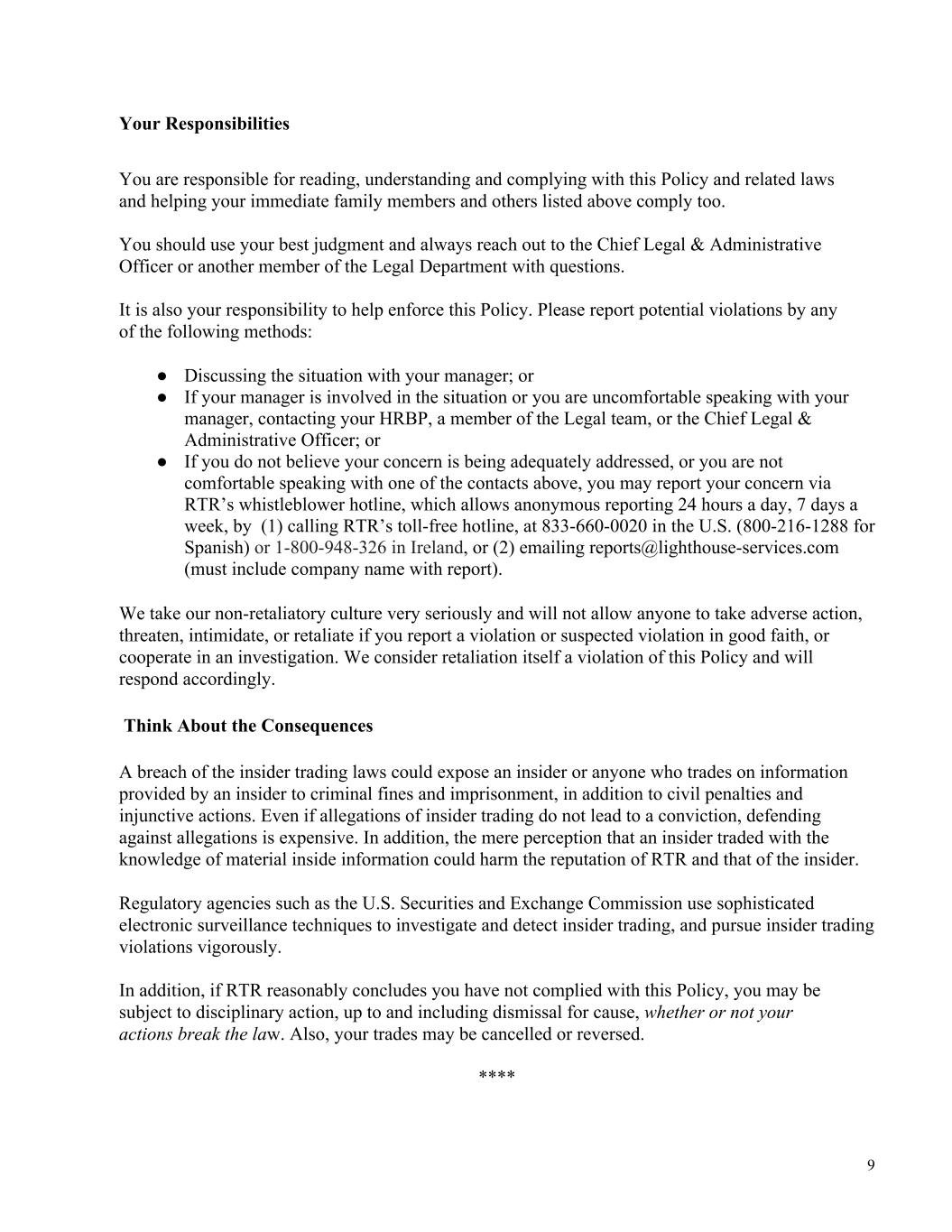 9 Your Responsibilities You are responsible for reading, understanding and complying with this Policy and related laws and helping your immediate family members and others listed above comply too. You should use your best judgment and always reach out to the Chief Legal & Administrative Officer or another member of the Legal Department with questions. It is also your responsibility to help enforce this Policy. Please report potential violations by any of the following methods: ● Discussing the situation with your manager; or ● If your manager is involved in the situation or you are uncomfortable speaking with your manager, contacting your HRBP, a member of the Legal team, or the Chief Legal & Administrative Officer; or ● If you do not believe your concern is being adequately addressed, or you are not comfortable speaking with one of the contacts above, you may report your concern via RTR’s whistleblower hotline, which allows anonymous reporting 24 hours a day, 7 days a week, by (1) calling RTR’s toll-free hotline, at 833-660-0020 in the U.S. (800-216-1288 for Spanish) or 1-800-948-326 in Ireland, or (2) emailing reports@lighthouse-services.com (must include company name with report). We take our non-retaliatory culture very seriously and will not allow anyone to take adverse action, threaten, intimidate, or retaliate if you report a violation or suspected violation in good faith, or cooperate in an investigation. We consider retaliation itself a violation of this Policy and will respond accordingly. Think About the Consequences A breach of the insider trading laws could expose an insider or anyone who trades on information provided by an insider to criminal fines and imprisonment, in addition to civil penalties and injunctive actions. Even if allegations of insider trading do not lead to a conviction, defending against allegations is expensive. In addition, the mere perception that an insider traded with the knowledge of material inside information could harm the reputation of RTR and that of the insider. Regulatory agencies such as the U.S. Securities and Exchange Commission use sophisticated electronic surveillance techniques to investigate and detect insider trading, and pursue insider trading violations vigorously. In addition, if RTR reasonably concludes you have not complied with this Policy, you may be subject to disciplinary action, up to and including dismissal for cause, whether or not your actions break the law. Also, your trades may be cancelled or reversed. ****