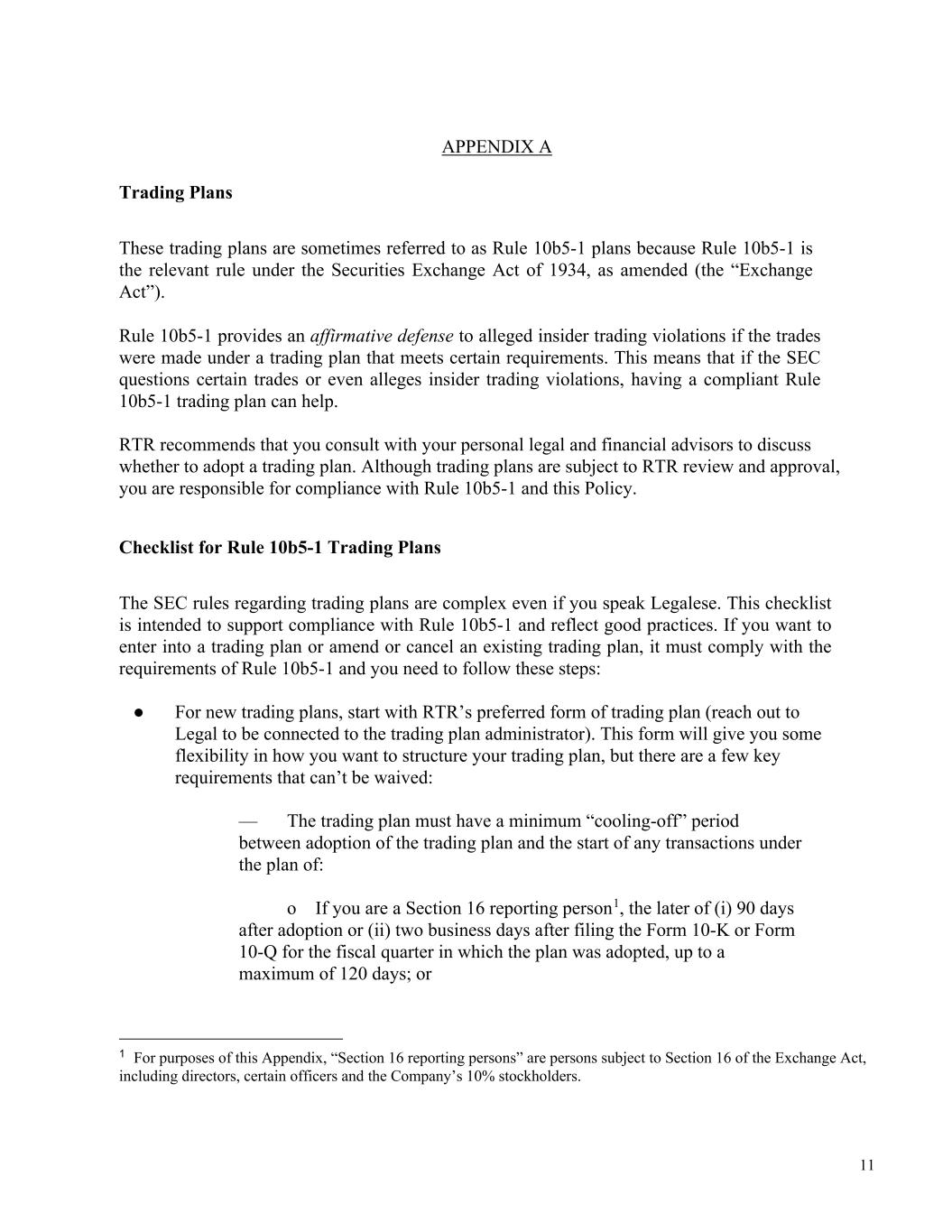 11 APPENDIX A Trading Plans These trading plans are sometimes referred to as Rule 10b5-1 plans because Rule 10b5-1 is the relevant rule under the Securities Exchange Act of 1934, as amended (the “Exchange Act”). Rule 10b5-1 provides an affirmative defense to alleged insider trading violations if the trades were made under a trading plan that meets certain requirements. This means that if the SEC questions certain trades or even alleges insider trading violations, having a compliant Rule 10b5-1 trading plan can help. RTR recommends that you consult with your personal legal and financial advisors to discuss whether to adopt a trading plan. Although trading plans are subject to RTR review and approval, you are responsible for compliance with Rule 10b5-1 and this Policy. Checklist for Rule 10b5-1 Trading Plans The SEC rules regarding trading plans are complex even if you speak Legalese. This checklist is intended to support compliance with Rule 10b5-1 and reflect good practices. If you want to enter into a trading plan or amend or cancel an existing trading plan, it must comply with the requirements of Rule 10b5-1 and you need to follow these steps: ● For new trading plans, start with RTR’s preferred form of trading plan (reach out to Legal to be connected to the trading plan administrator). This form will give you some flexibility in how you want to structure your trading plan, but there are a few key requirements that can’t be waived: — The trading plan must have a minimum “cooling-off” period between adoption of the trading plan and the start of any transactions under the plan of: o If you are a Section 16 reporting person1, the later of (i) 90 days after adoption or (ii) two business days after filing the Form 10-K or Form 10-Q for the fiscal quarter in which the plan was adopted, up to a maximum of 120 days; or 1 For purposes of this Appendix, “Section 16 reporting persons” are persons subject to Section 16 of the Exchange Act, including directors, certain officers and the Company’s 10% stockholders.