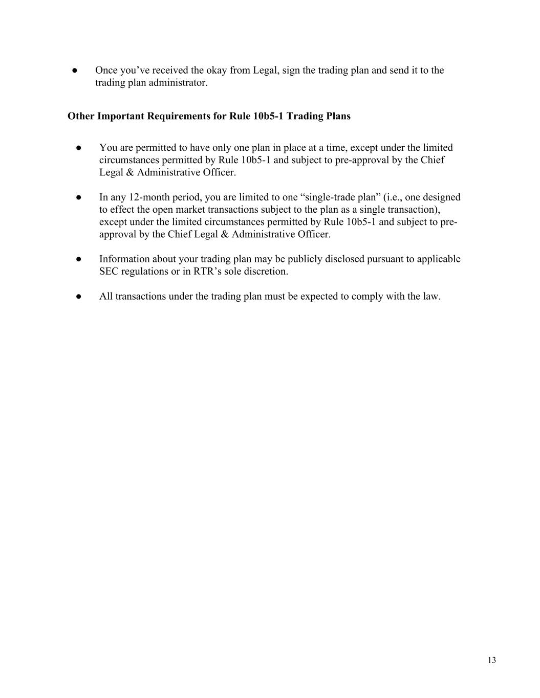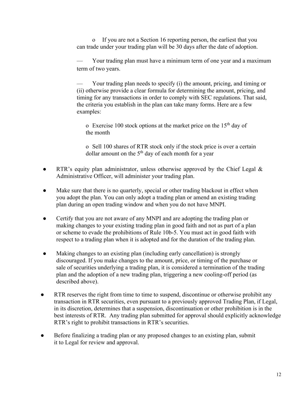 12 o If you are not a Section 16 reporting person, the earliest that you can trade under your trading plan will be 30 days after the date of adoption. — Your trading plan must have a minimum term of one year and a maximum term of two years. — Your trading plan needs to specify (i) the amount, pricing, and timing or (ii) otherwise provide a clear formula for determining the amount, pricing, and timing for any transactions in order to comply with SEC regulations. That said, the criteria you establish in the plan can take many forms. Here are a few examples: o Exercise 100 stock options at the market price on the 15th day of the month o Sell 100 shares of RTR stock only if the stock price is over a certain dollar amount on the 5th day of each month for a year ● RTR’s equity plan administrator, unless otherwise approved by the Chief Legal & Administrative Officer, will administer your trading plan. ● Make sure that there is no quarterly, special or other trading blackout in effect when you adopt the plan. You can only adopt a trading plan or amend an existing trading plan during an open trading window and when you do not have MNPI. ● Certify that you are not aware of any MNPI and are adopting the trading plan or making changes to your existing trading plan in good faith and not as part of a plan or scheme to evade the prohibitions of Rule 10b-5. You must act in good faith with respect to a trading plan when it is adopted and for the duration of the trading plan. ● Making changes to an existing plan (including early cancellation) is strongly discouraged. If you make changes to the amount, price, or timing of the purchase or sale of securities underlying a trading plan, it is considered a termination of the trading plan and the adoption of a new trading plan, triggering a new cooling-off period (as described above). ● RTR reserves the right from time to time to suspend, discontinue or otherwise prohibit any transaction in RTR securities, even pursuant to a previously approved Trading Plan, if Legal, in its discretion, determines that a suspension, discontinuation or other prohibition is in the best interests of RTR. Any trading plan submitted for approval should explicitly acknowledge RTR’s right to prohibit transactions in RTR’s securities. ● Before finalizing a trading plan or any proposed changes to an existing plan, submit it to Legal for review and approval.