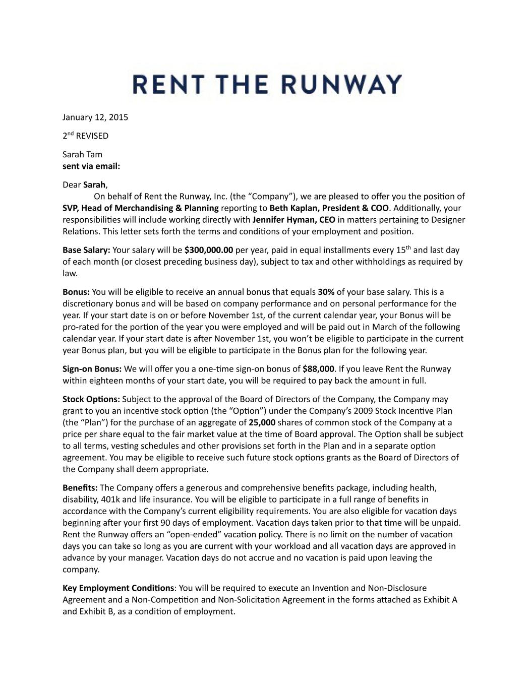 January 12, 2015 2nd REVISED Sarah Tam sent via email: Dear Sarah, On behalf of Rent the Runway, Inc. (the “Company”), we are pleased to offer you the position of SVP, Head of Merchandising & Planning reporting to Beth Kaplan, President & COO. Additionally, your responsibilities will include working directly with Jennifer Hyman, CEO in matters pertaining to Designer Relations. This letter sets forth the terms and conditions of your employment and position. Base Salary: Your salary will be $300,000.00 per year, paid in equal installments every 15th and last day of each month (or closest preceding business day), subject to tax and other withholdings as required by law. Bonus: You will be eligible to receive an annual bonus that equals 30% of your base salary. This is a discretionary bonus and will be based on company performance and on personal performance for the year. If your start date is on or before November 1st, of the current calendar year, your Bonus will be pro-rated for the portion of the year you were employed and will be paid out in March of the following calendar year. If your start date is after November 1st, you won’t be eligible to participate in the current year Bonus plan, but you will be eligible to participate in the Bonus plan for the following year. Sign-on Bonus: We will offer you a one-time sign-on bonus of $88,000. If you leave Rent the Runway within eighteen months of your start date, you will be required to pay back the amount in full. Stock Options: Subject to the approval of the Board of Directors of the Company, the Company may grant to you an incentive stock option (the “Option”) under the Company’s 2009 Stock Incentive Plan (the “Plan”) for the purchase of an aggregate of 25,000 shares of common stock of the Company at a price per share equal to the fair market value at the time of Board approval. The Option shall be subject to all terms, vesting schedules and other provisions set forth in the Plan and in a separate option agreement. You may be eligible to receive such future stock options grants as the Board of Directors of the Company shall deem appropriate. Benefits: The Company offers a generous and comprehensive benefits package, including health, disability, 401k and life insurance. You will be eligible to participate in a full range of benefits in accordance with the Company’s current eligibility requirements. You are also eligible for vacation days beginning after your first 90 days of employment. Vacation days taken prior to that time will be unpaid. Rent the Runway offers an “open-ended” vacation policy. There is no limit on the number of vacation days you can take so long as you are current with your workload and all vacation days are approved in advance by your manager. Vacation days do not accrue and no vacation is paid upon leaving the company. Key Employment Conditions: You will be required to execute an Invention and Non-Disclosure Agreement and a Non-Competition and Non-Solicitation Agreement in the forms attached as Exhibit A and Exhibit B, as a condition of employment.